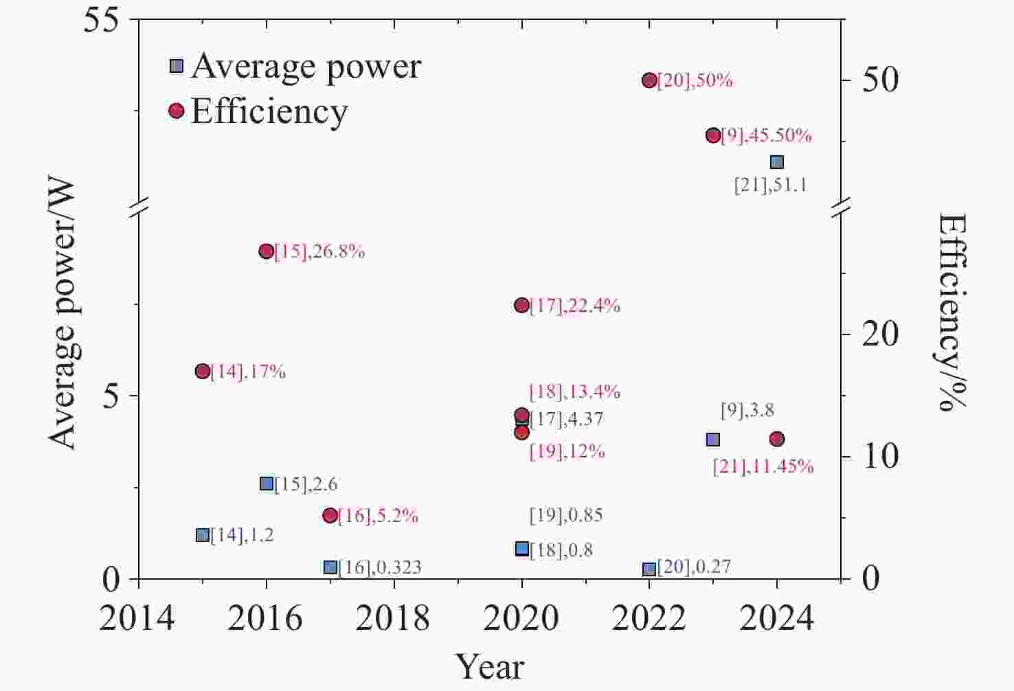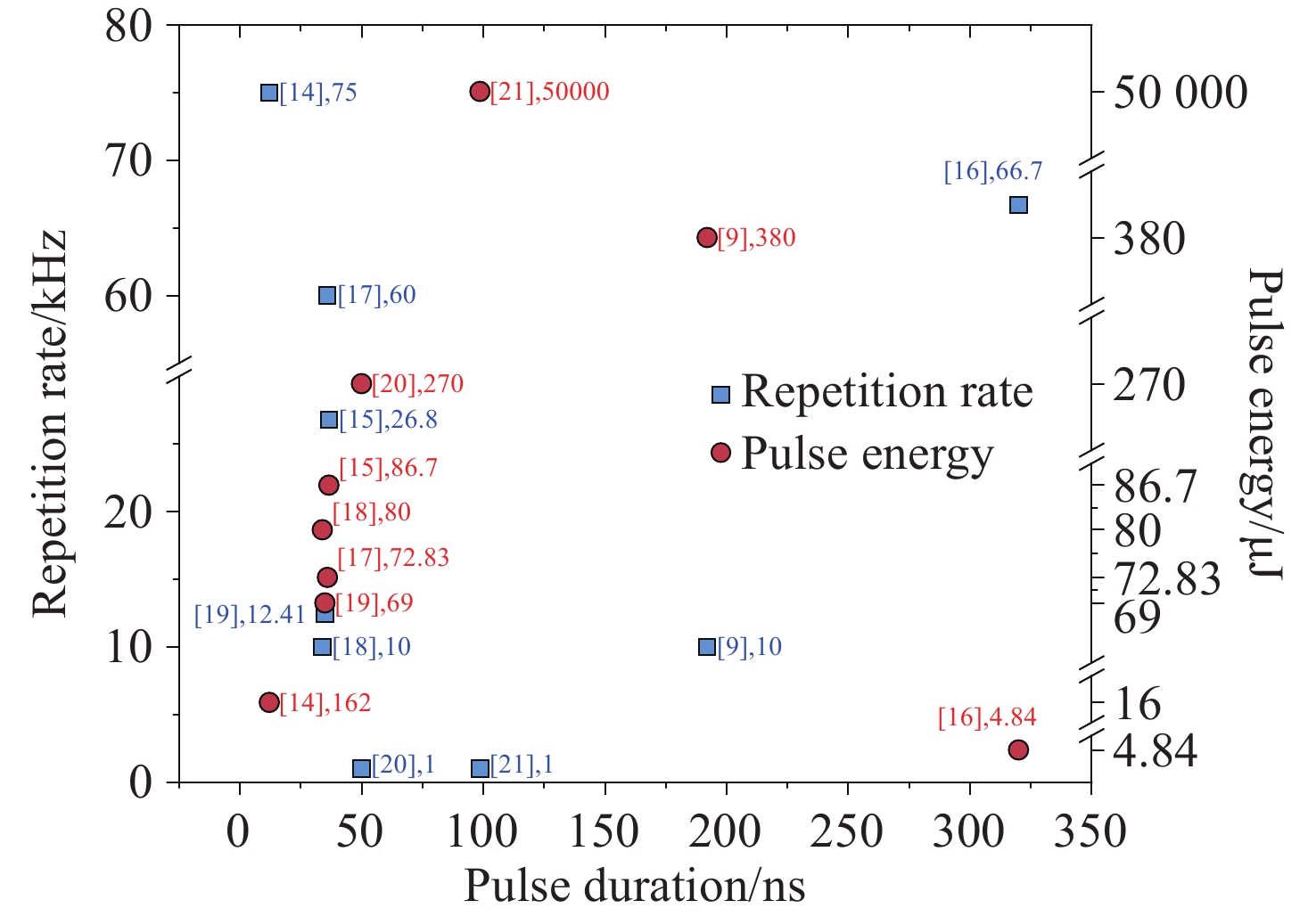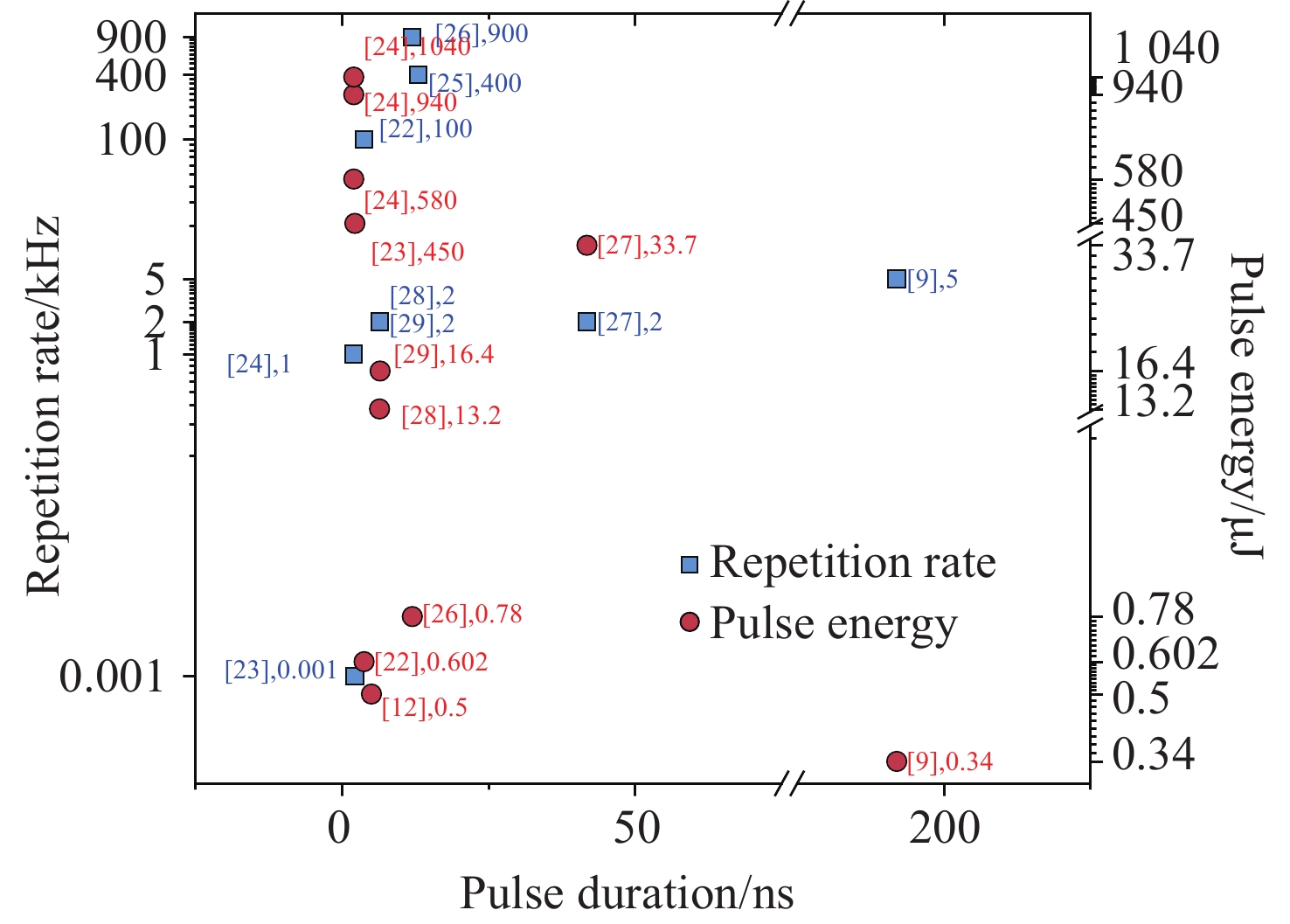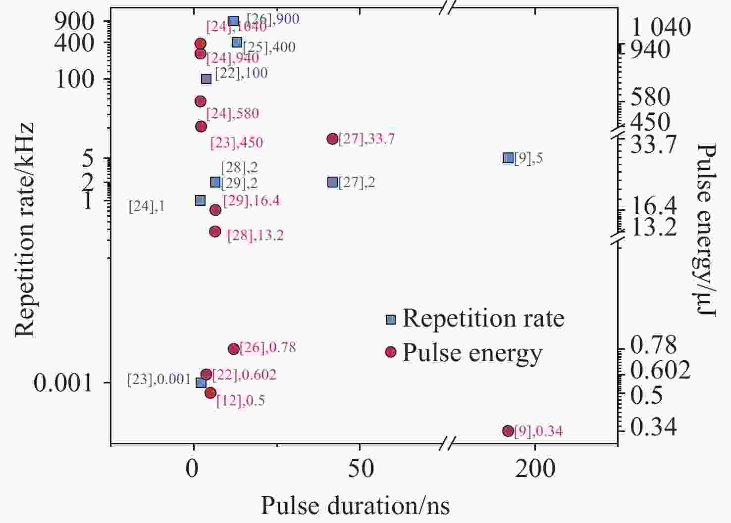 (ns)2022[20] LBO - 150 °C 0.27 532 270 50 50 - - 1 1064 - 2017[16] PPLN 1*1*1.2 25 °C 0.323 532.7 4.84 320 5.2 6.9 - 66.7 1064 - 2020[18] BBO 4*4*8 20 °C 0.8 539.9 80 33.9 13.40 - - 10 1080 - 2020[19] LBO 3*3*10 29 °C 0.85 532 69 - 12 - - 12.41 1064 35 2015[14] GTR-KTP 3*3*7 室温 1.2 532 162 12.15 17 - <1.5 75 1064 - 2016[15] LBO 2*2*15 20 2.6 535 86.7 36.6 26.8 - - 26.8 1070 - 2023[9] KTP 4*4*10 20 3.8 532 380 192 45.504 - 1.6/1.73 10 1064 - 2020[17] BBO 4*4*8 20 °C 4.37 532 72.83 36 22.40 - - 60 1064 - 2024[21] LBO - - 51.1 527 50 mJ 98.7 11.45 - 18.1/14.593 1 1054 1. 基频光重频;2. 泵浦功率7 W时测得; 3. 为$ \text{M}_{\text{x}}^{2}/\text{M}_{\text{y}}^{2} $简写;4.效率为倍频转换效率;5.泵浦功率5.8 W时测得; 表 2 纳秒级腔外倍频研究进展(按倍频输出平均功率升序)