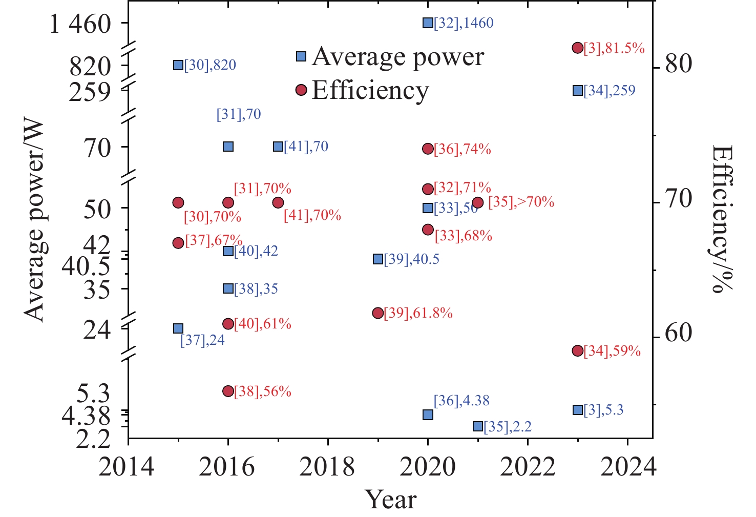 0.05 °C67.4 532 33.7 mJ 41.8 ns 75.40 - 1.31 2 1064 - 2023[26] LBO 长40 158.85 °C 70 528 0.78 mJ 65 - - 9004 1056 12 ns 2021[25] LBO - 142.85 °C 807 535 - - 36 - 1.28 400 1070 13 ns 2021[25] LBO - 142.85 °C 807 528 - - 60 - 1.28 400 1056 13 ns 2020[24] LBO 10*10*10 - 580 515 0.58J 2 ns5 89 - - 1 1030 - 2020[24] LBO 10*10*13 - 940 515 0.94J6 2 ns 78 - 1.4/1.323 1 1030 - 2020[24] LBO 10*10*13 - 1040 515 1.04J6 2 ns - - - 1 1030 - 1. 水冷铜炉温度为20 °C;2. 腔内倍频的脉宽;3. 为$ \text{M}_{\text{x}}^{2}/\text{M}_{\text{y}}^{2} $简写;4. 经由第一块晶体倍频产生;5. 基频光经时间整形至方形脉冲;6. 经由两块LBO晶体倍频输出的总能量;7. 输出的528 nm和535 nm混合光的平均功率;8. 输出的528 nm和535 nm混合光的光束质量; 表 3 皮秒级脉宽倍频研究进展(按倍频输出平均功率升序)