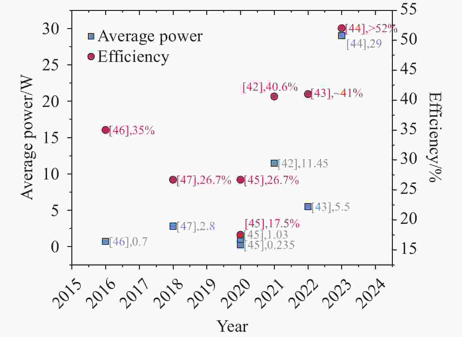 脉宽2021[35] LBO - 40 °C 2.2 532 2.2 mJ 27 ps >70 1.5 1 1064 2020[36] LBO 8*8*2 - 4.38 515 4.38 mJ 1.3 ps 74 <1.6 1 1030 2023[3] LBO 4*4*12 50 °C 5.3 532.2 0.53 mJ 18.6 ps 81.50 1.09/1.121 10 1064 2015[37] LBO 4*4*20 24 1.96 mJ 18.9 ps 67 1.753 5 1064 2016[38] LBO 8*8*10 47 °C 35 515 0.35 mJ - 56 1.4/1.61 100 1030 4 ps 2019[39] LBO 9*9*20 - 40.5 532 40.5 mJ - 61.8 1.26/1.251 1 1064 600 ps 2016[40] LBO 厚1.47 - 42 515 42 mJ - 61 - 1 1030 1.2 ps 2020[33] LBO 6*6*15 149 °C 50 532 50 mJ - 68 3.358/2.4571 1 1064 100 ps 2016[31] BBO 厚1.5 室温 70 515 20 mJ - 70 1.84/1.661 5 1030 1 ps 2017[41] β-BBO 厚1.5 - 70 515 14 mJ - 70 52 1030 1 ps 2023[34] LBO - - 259 515 259 mJ - 59 - 1 1030 1 ps 2015[30] LBO 6*6*5 47 °C 820 515 2.7 mJ - 70 1.53/1.991 300 1030 7.7 ps 2020[32] LBO 15*15*5 47 °C 1460 515 4.87 mJ - 71 1.38/1.431 300 1030 7.7 ps 1. 为$ \mathrm{M}_{\mathrm{x}}^{2}/\mathrm{M}_{\mathrm{y}}^{2} $简写; 2. 基频光重频;3. 最大绿光脉冲能量1.96 mJ输出时测得; 表 4 飞秒级脉宽倍频研究进展(按倍频输出平均功率降序)