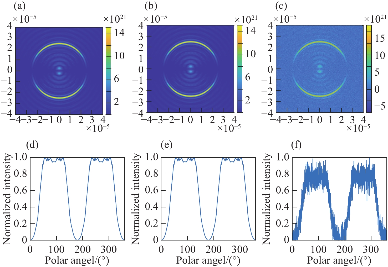 $ 0 $ ,(b)$ \dfrac{\mathrm{{\text{π}} }}{4} $ ,(c)$ \dfrac{\mathrm{{\text{π}} }}{2} $ ,(d)$ \dfrac{3\mathrm{{\text{π}} }}{4} $ 。图中第一行左侧箭头表示入射线偏振光的方向,右侧箭头表示焦平面前偏振片传输轴的方向Figure 7. Lignt intensity varies with the polar angle and their normalized intensity distribution curves. The rotation angles of incident polarized light are (a)