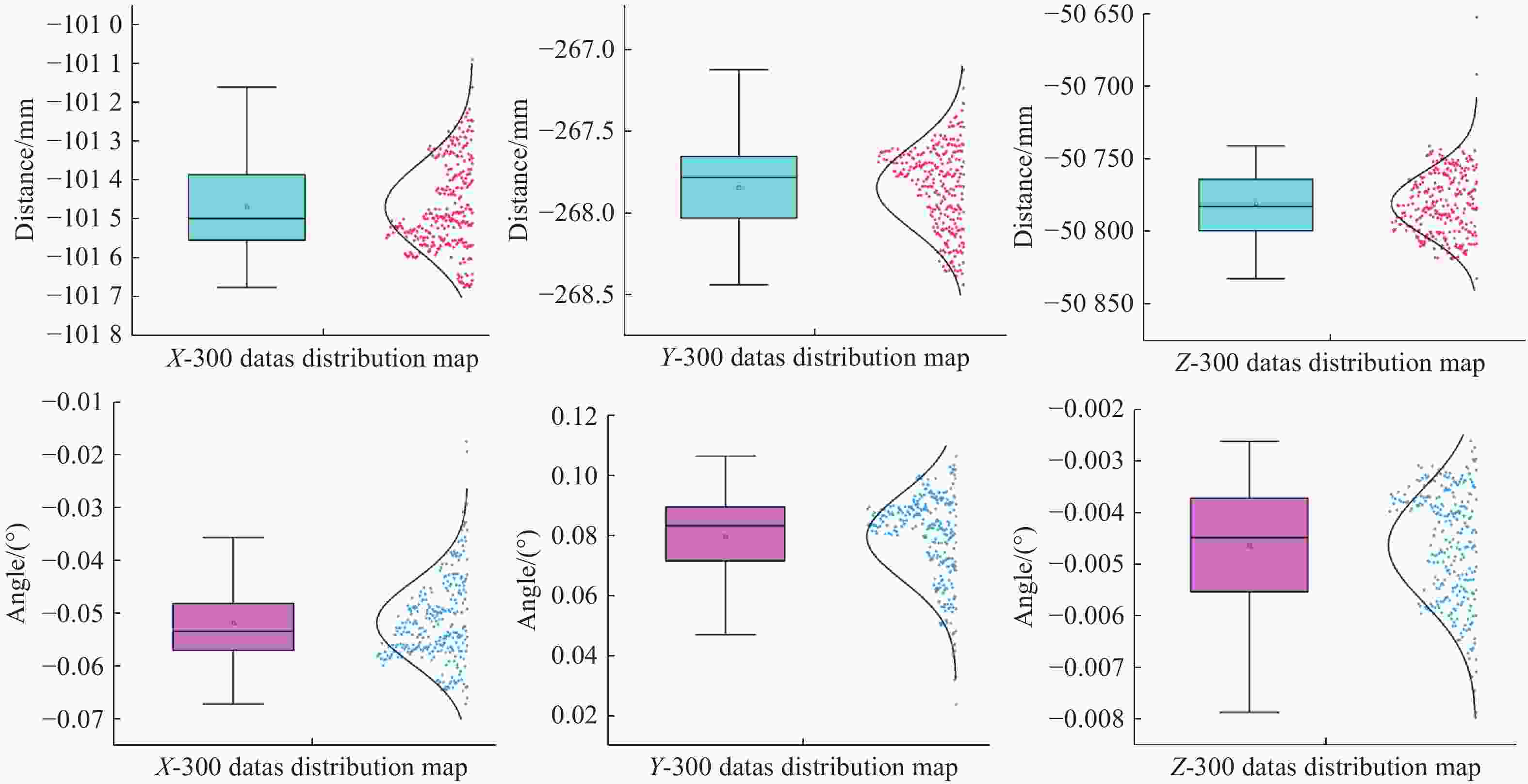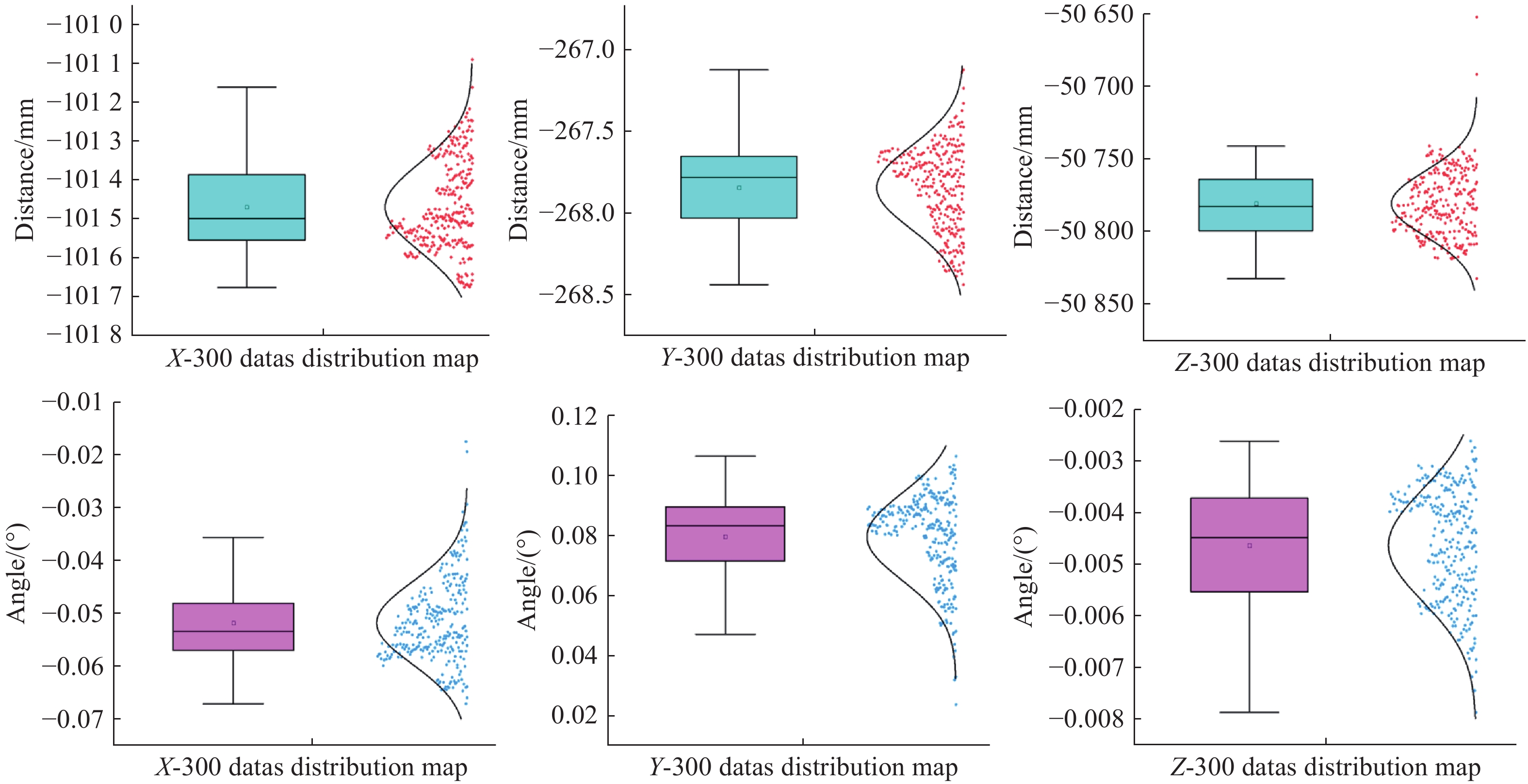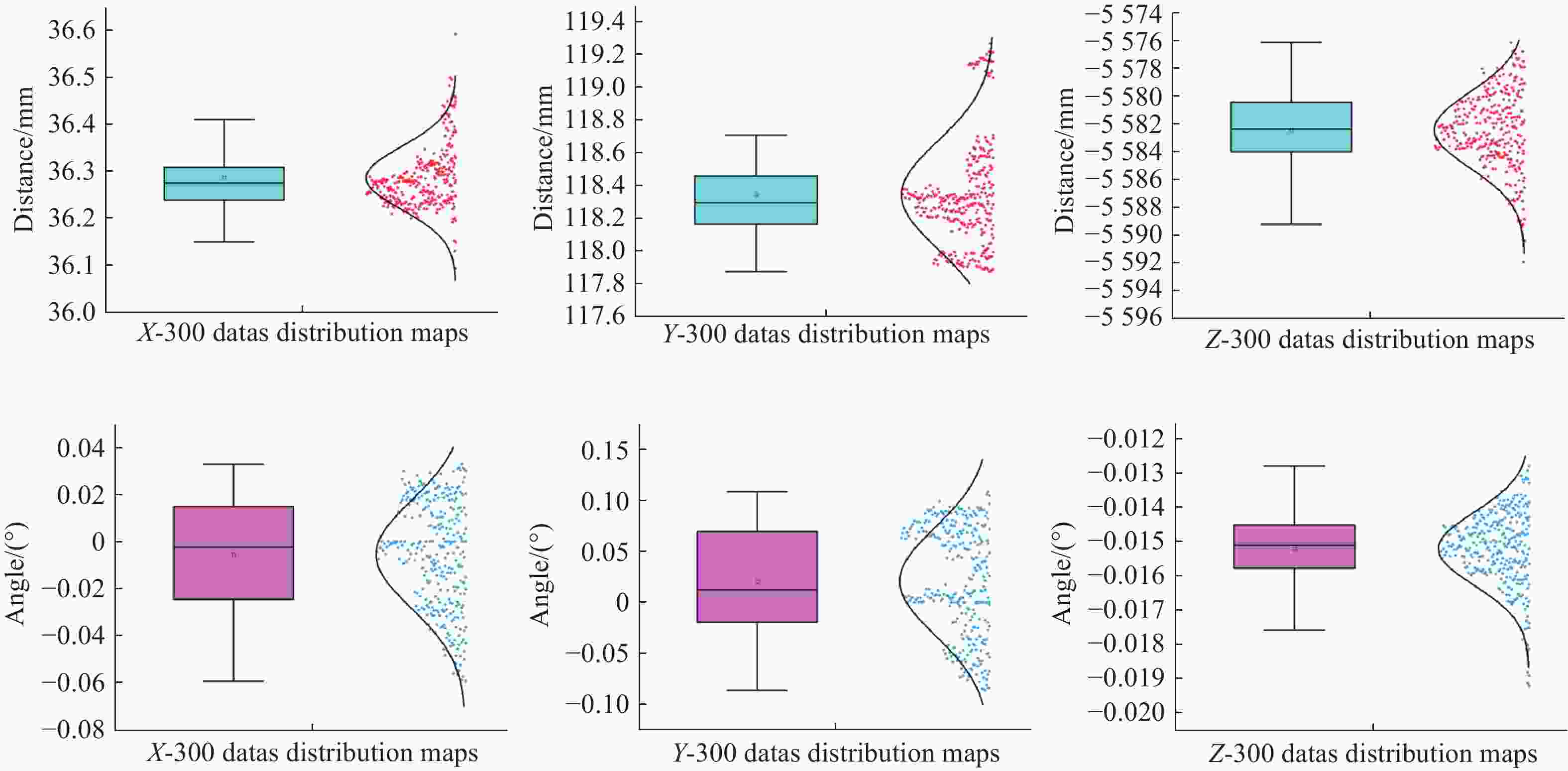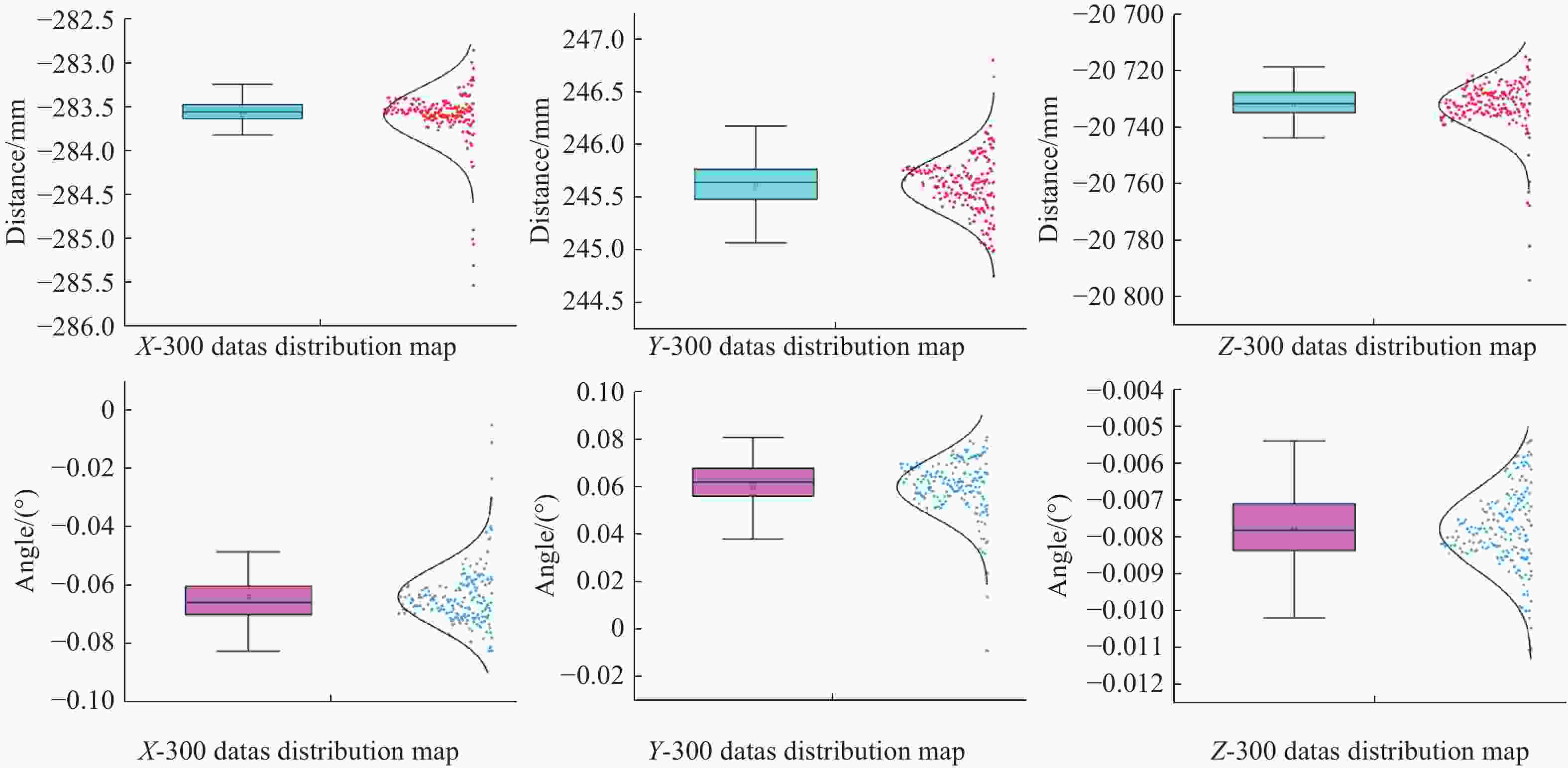 Parameters Std Mean-value Max-v Min-v Tx/mm 0.08 −58.63 − 58.3670 −58.72 Ty/mm 0.003 45.41 45.478 45.40 Tz/mm 0.10 −405.79 −402.922 −405.89 $\varphi $/(°) 0.003 −0.041 0.0009 −0.043 $\theta $/(°) 0.006 −0.184 −0.046 −0.07 $\psi $/(°) 0.0003 − 0.0157 −0.007 − 0.0161 -