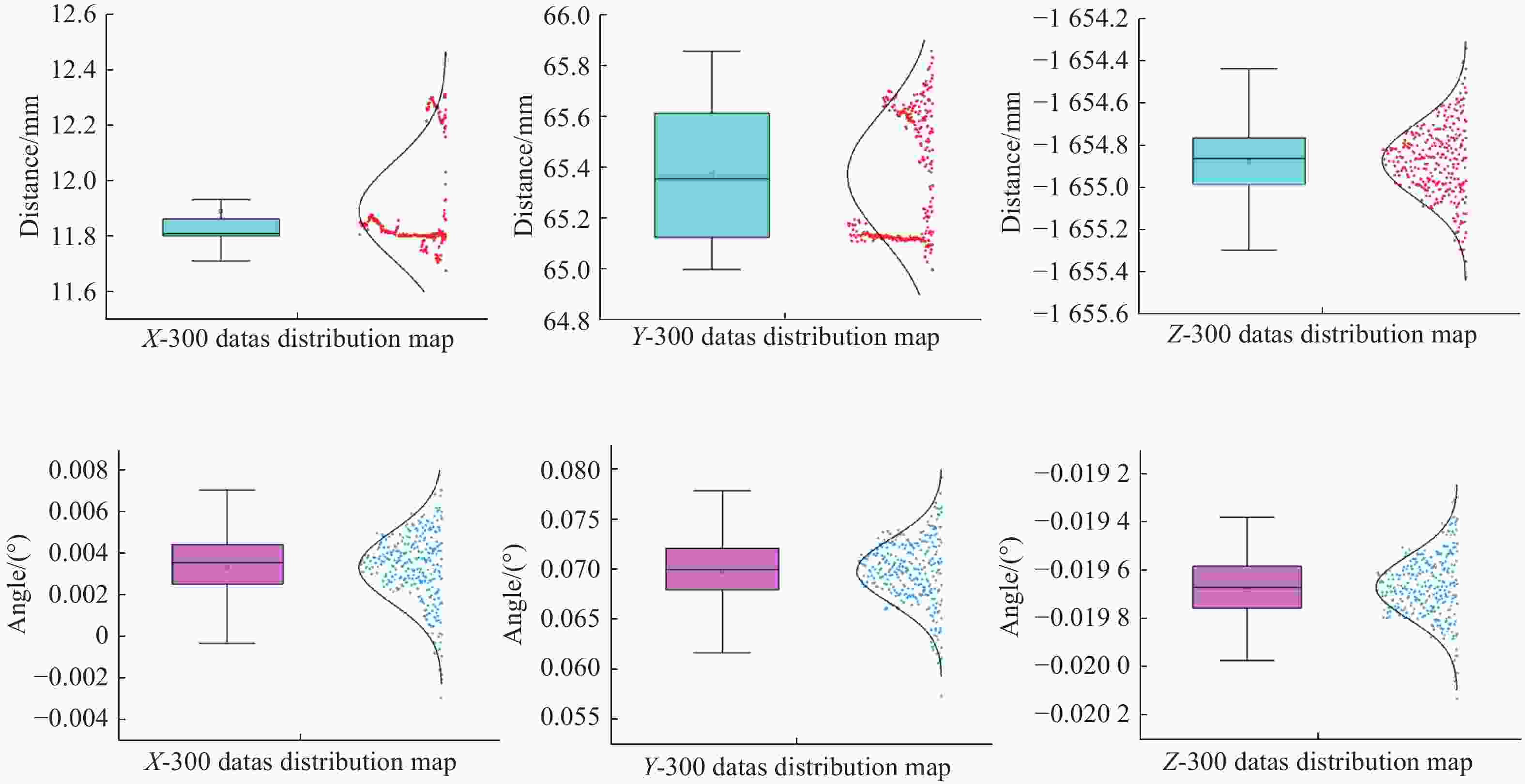 Parameters Std Mean-value Max-v Min-v Tx/mm 0.2270 11.8730 12.4530 11.6760 Ty/mm 0.2810 65.3370 65.7950 64.9990 Tz/mm 0.1870 − 1654.8800 − 1654.3430 − 1655.4240 $\varphi $/(°) 0.0020 − 0.0032 0.0078 − 0.0029 $\theta $/(°) 0.0036 − 0.0691 − 0.0792 − 0.0574 $\psi $/(°) 0.0002 − 0.0197 − 0.0192 − 0.0201 表 5 双星距离0.4 m时的相对位置与姿态测量结果