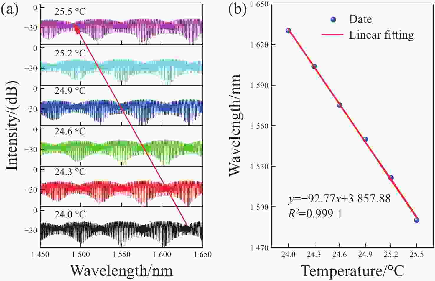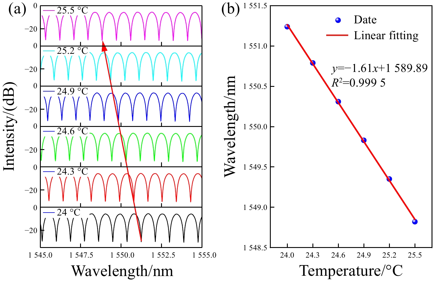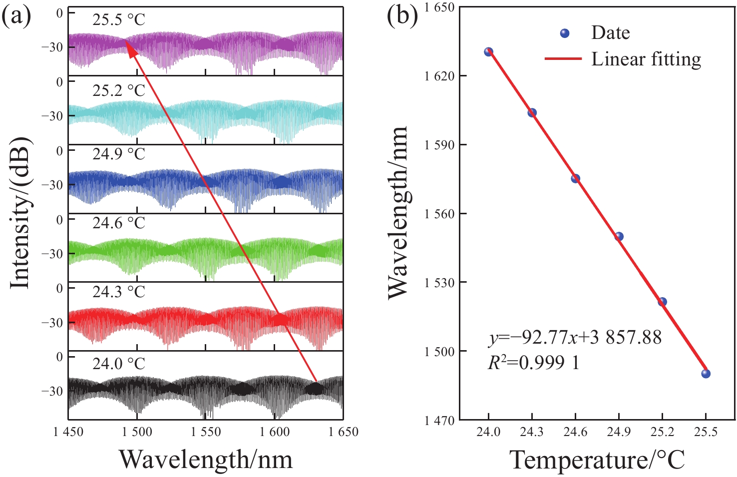 图 9  单一Lyot-Sagnac结构中PMF1作为传感部位的温度响应图谱。(a)干涉图谱;(b)线性拟合结果