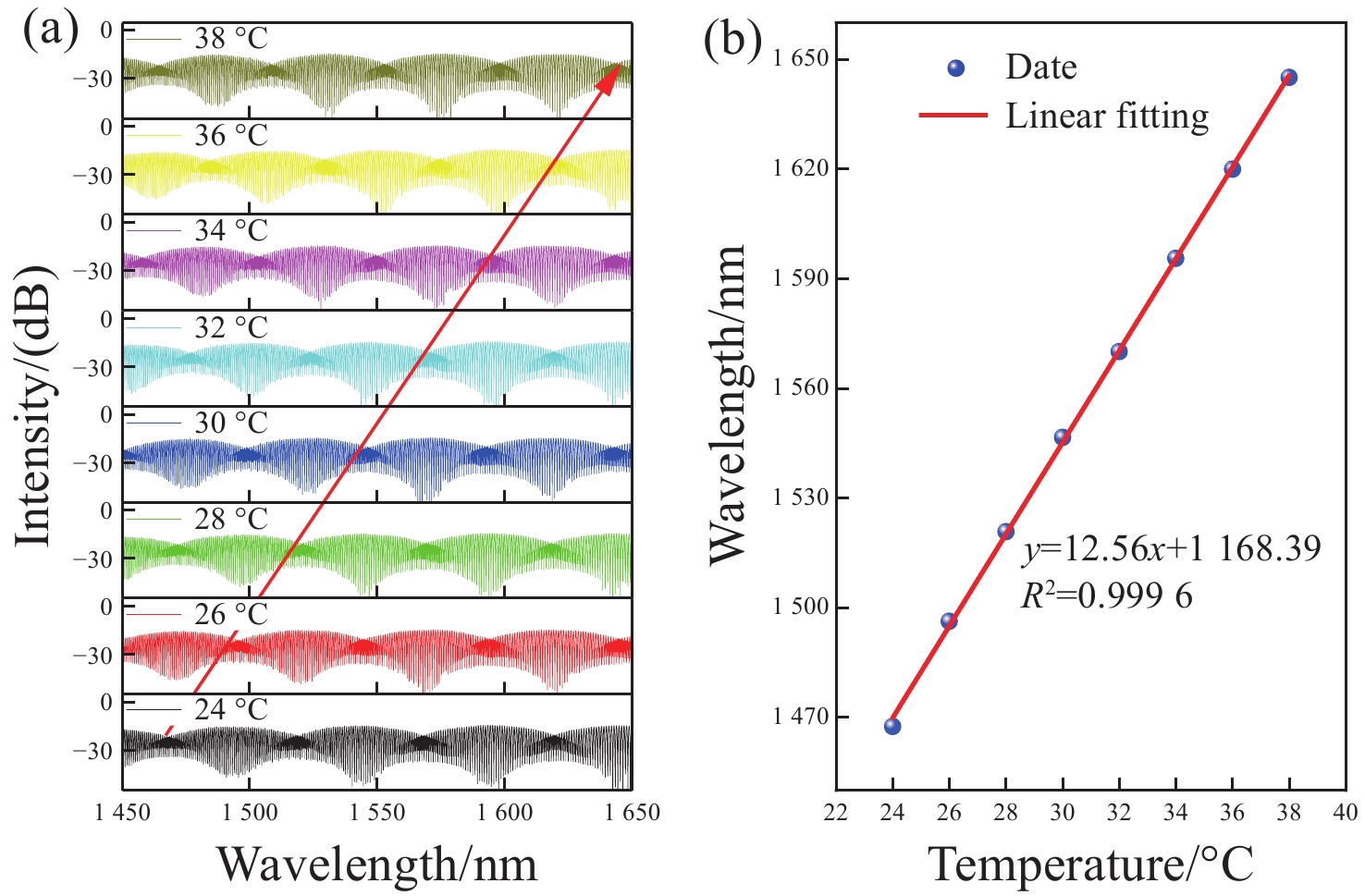Figure 12.  Temperature response characteristics when PMF2 acts as the sensing element in the cascaded sensor. (a) Interference spectra; (b) linear fitting results