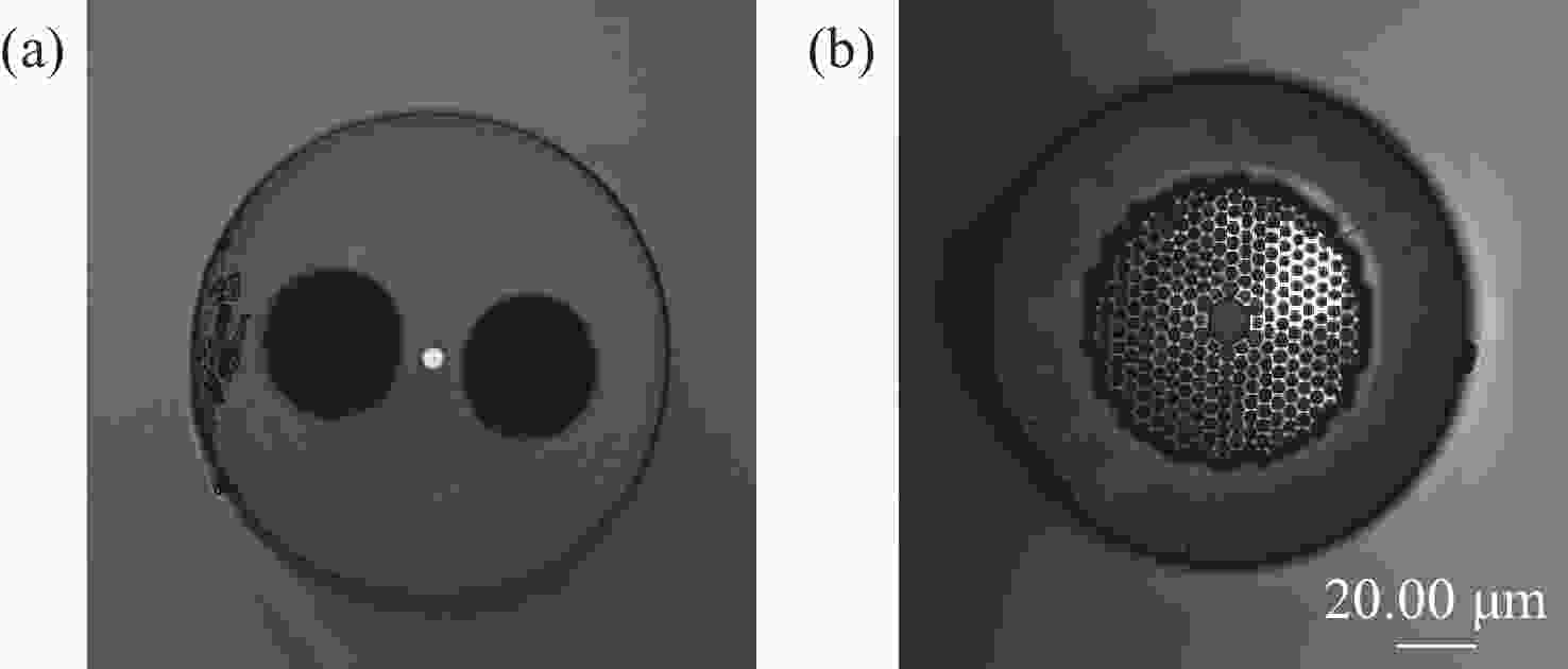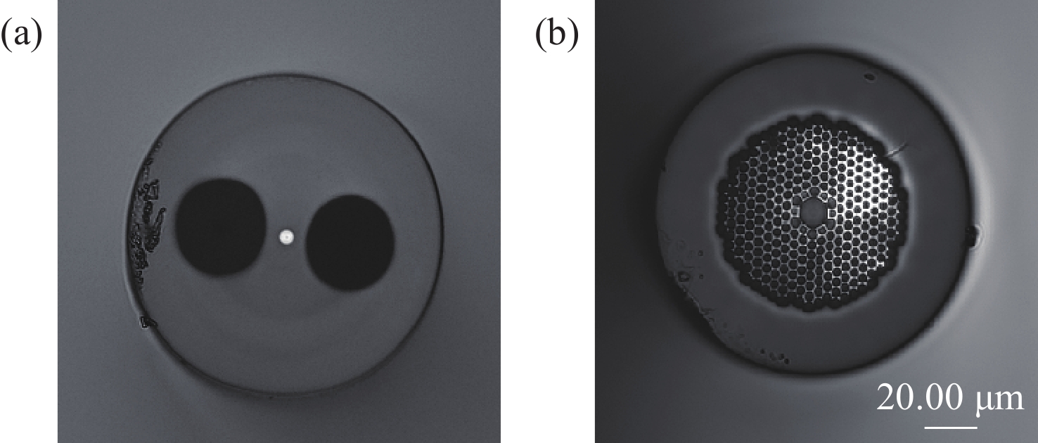 图 2  传感器所用光纤的端面表征。(a)PMF;(b)HCPCF