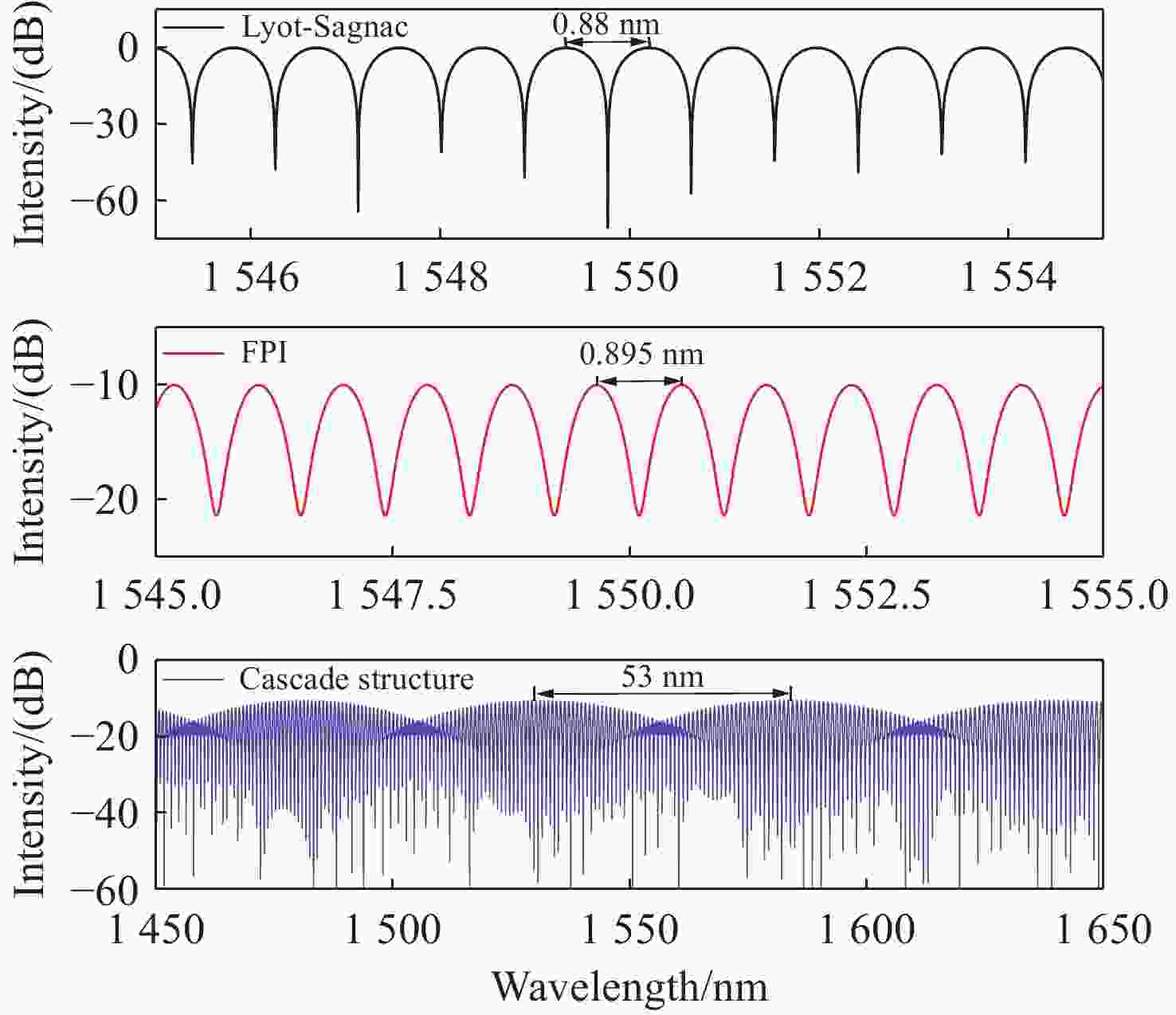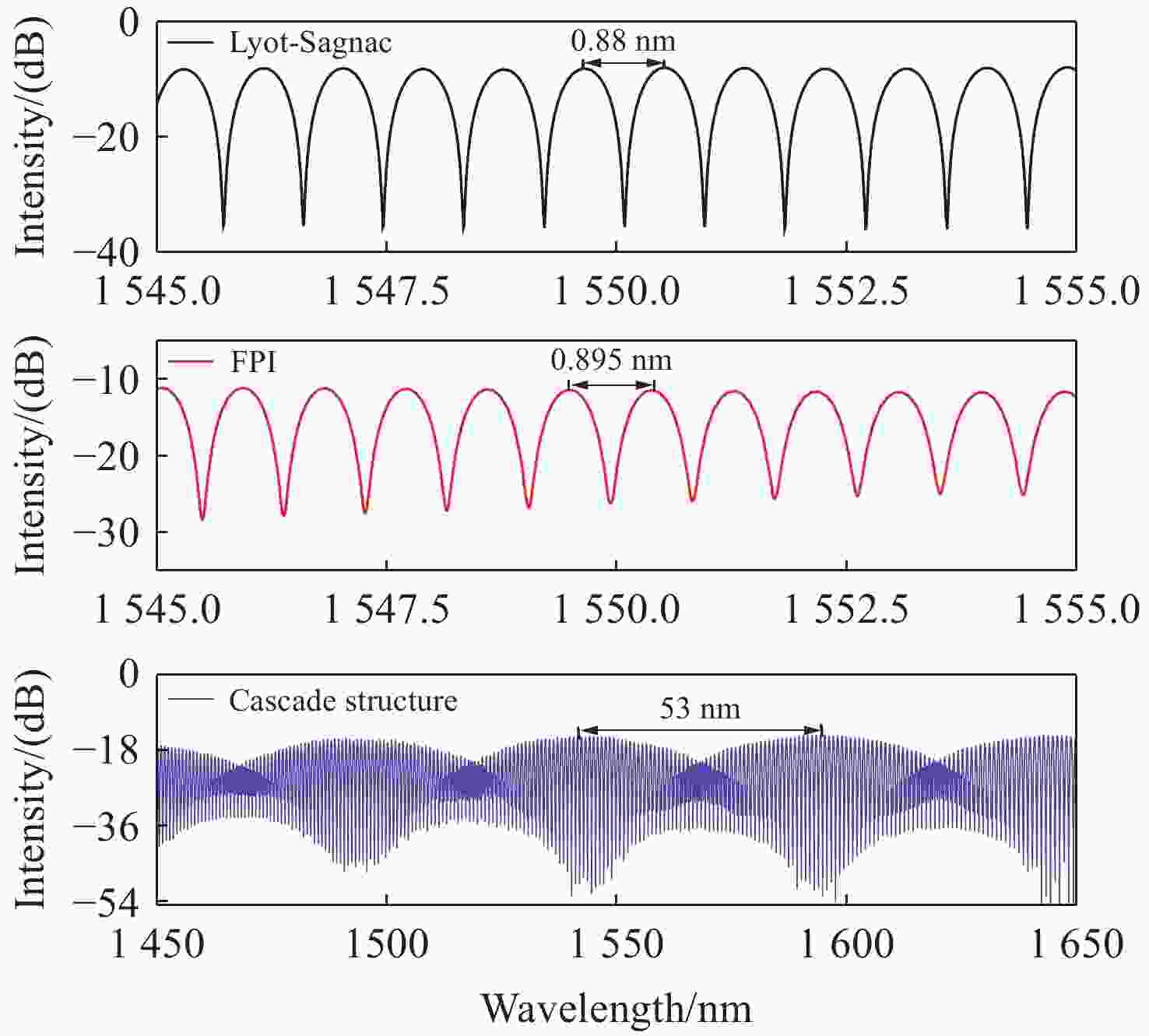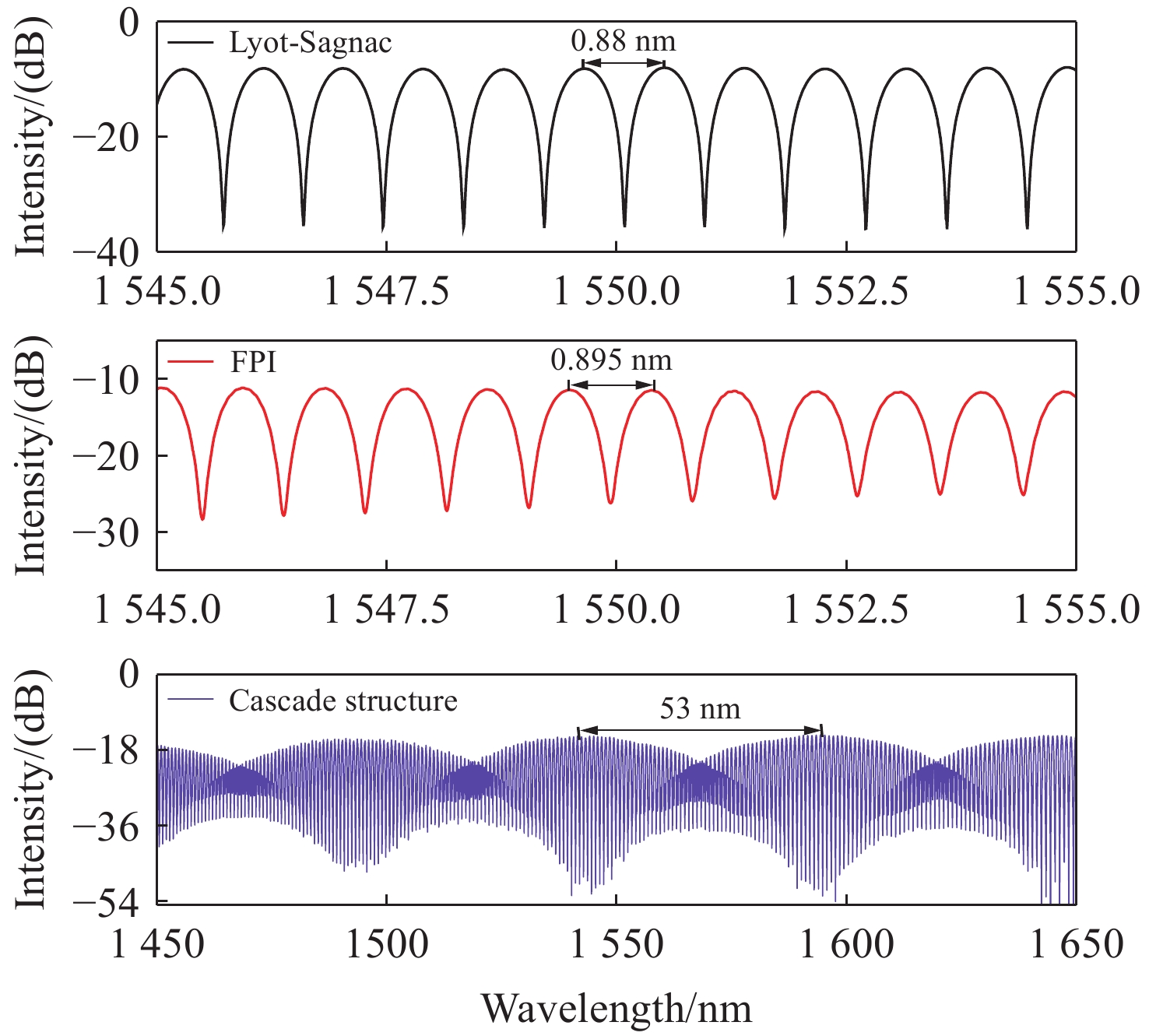 Figure 8.  Transmission spectra of the Lyot-Sagnac structure, FPI and cascaded sensor