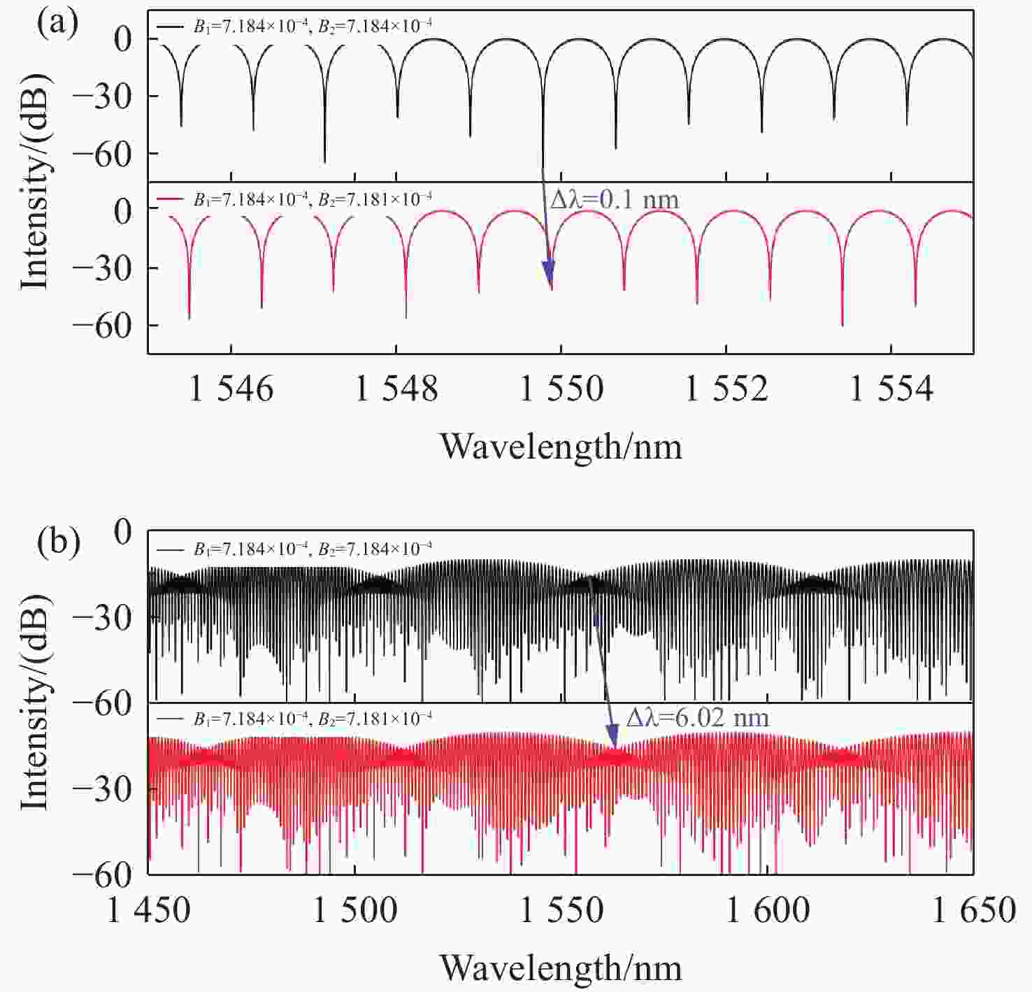 Figure 6.  Simulated temperature response characteristics of the sensing structure when B2 remains constant and B1 is varied. (a) Standalone Lyot-Sagnac interferometer; (b) cascaded sensor