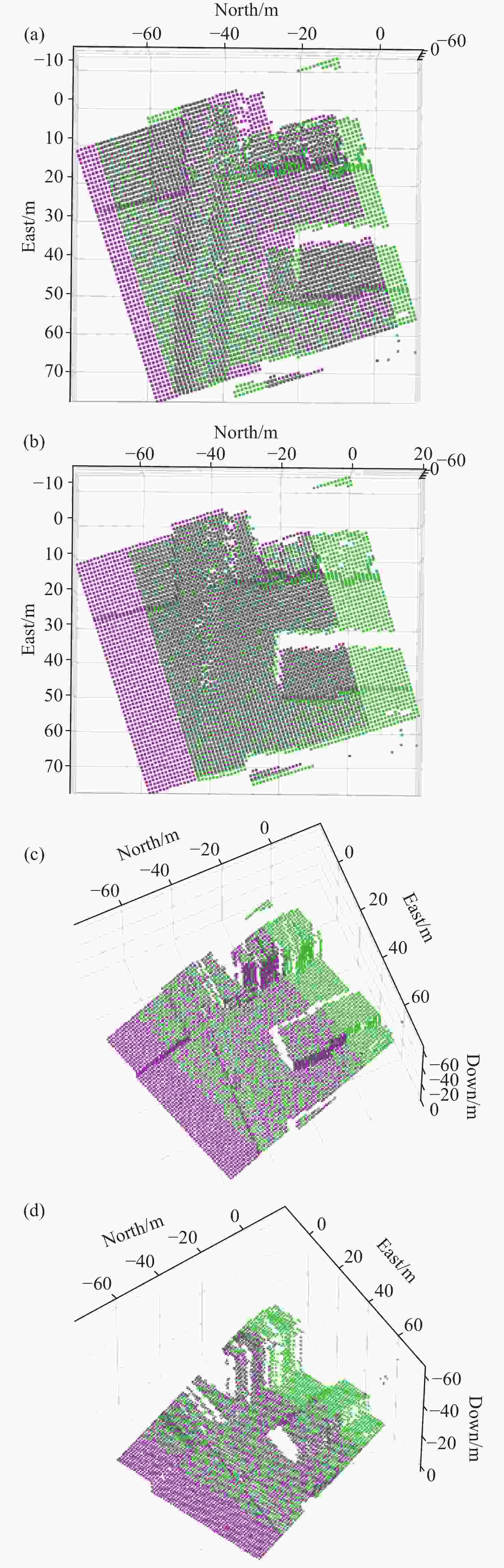 图 10 真实场景局部配准结果对比。(a)传统ICP;(b)改进ICP;(c)重叠点云提取结合传统ICP;(d)重叠点云提取结合改进ICP