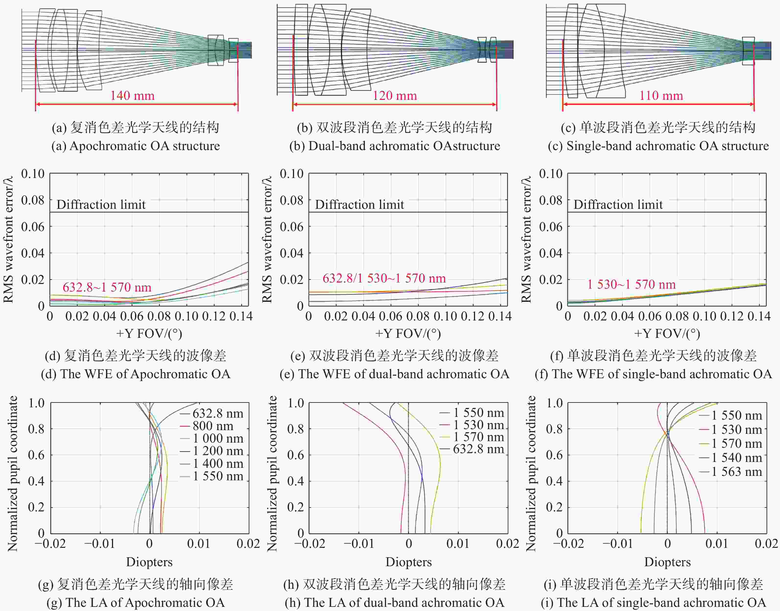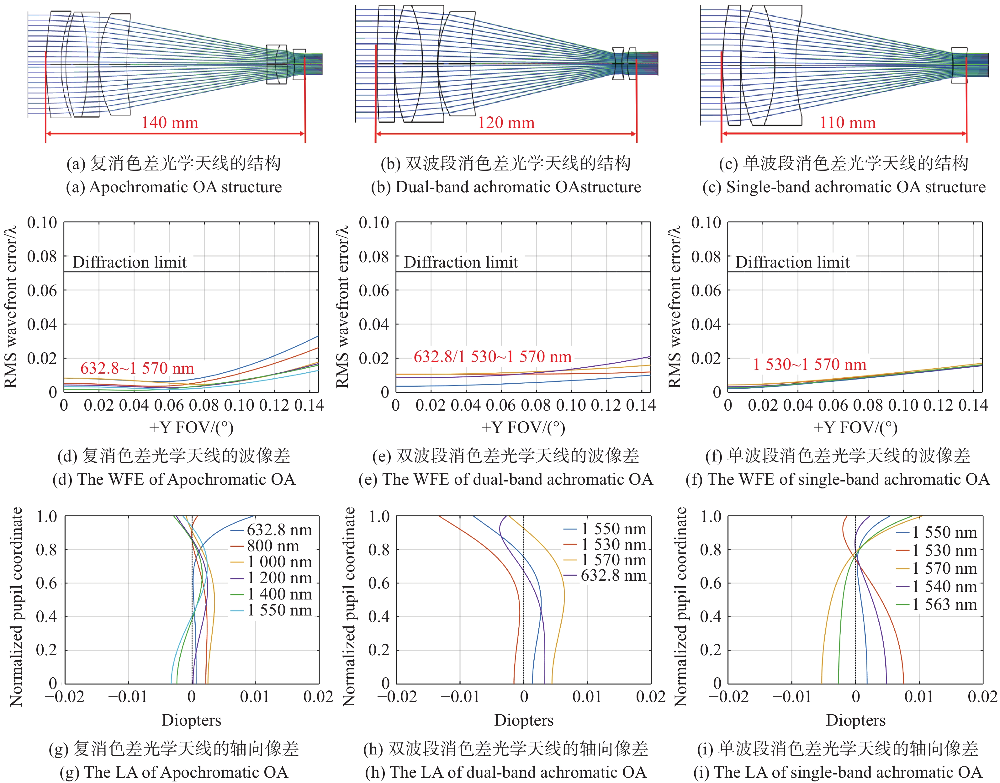 Item Apochromatic OA Dual-band achromatic OA Single-band achromatic OA Number of lenses 7 6 4 Length/mm 140 120 101 Weight/g 451 436 353 Optical transmittance 90.27% 91.37% 94.16% Full field wavefront error