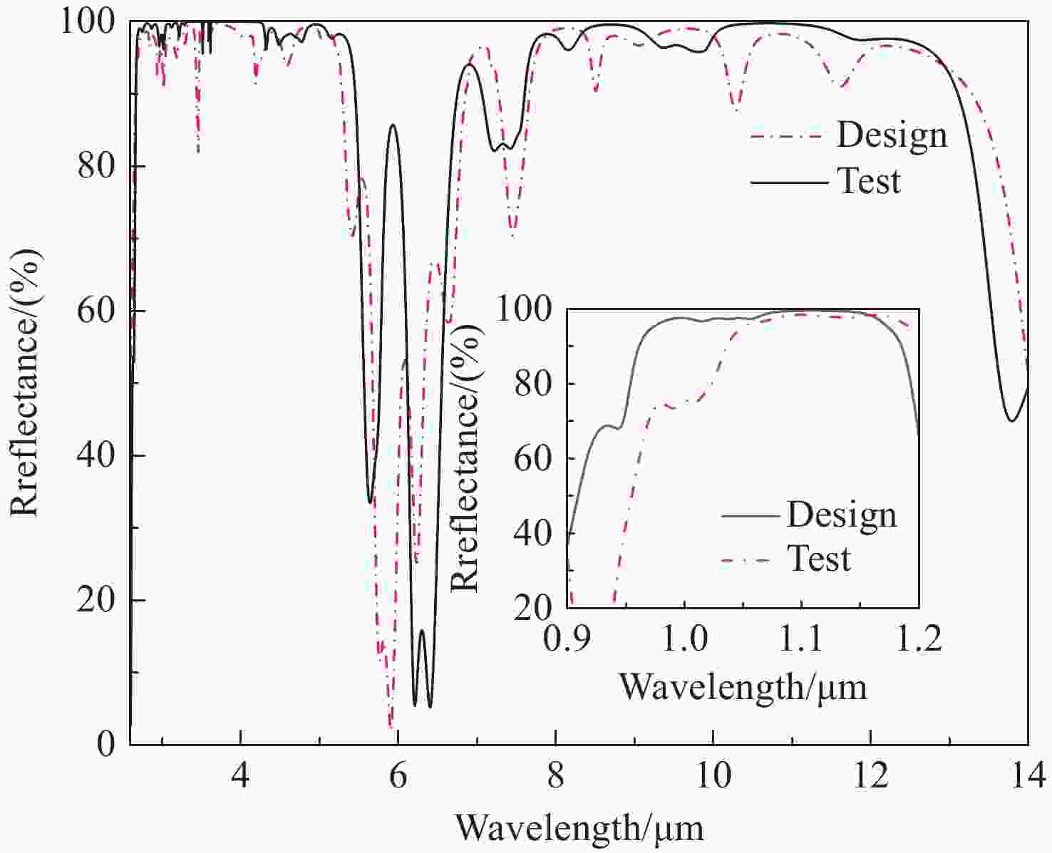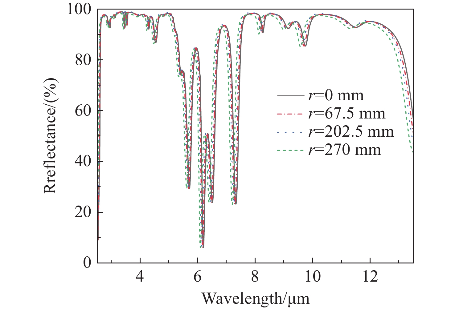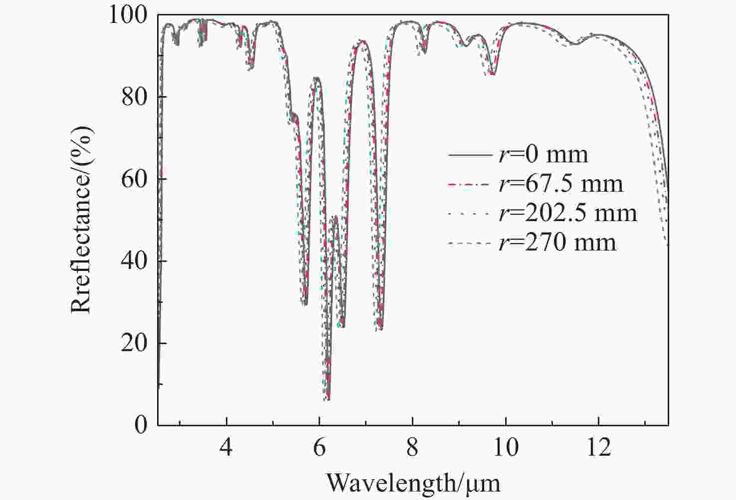 Abstract:Multi-band infrared detectors can simultaneously capture radiation information across multiple wavelengths, offering significant advantages over single-band infrared detectors in target recognition, classification, temperature measurement, and information extraction. Consequently, they have become a central focus of infrared detector technology research. As a key optical component of multi-band infrared detectors, the performance of the three-band large-aperture wide-angle infrared mirror directly determines detection accuracy. In the design phase, this study selected three materials: Ge, ZnS, and YbF3, based on high-reflectivity coating design principles, and optimized a structurally robust infrared reflector coating system through spectral superposition combined with TFCalc software. During the preparation stage, ion-source-assisted deposition was employed, and the issue of film delamination was resolved by optimizing the deposition process. During spectral testing, problems related to spectral drift in the samples were addressed through film thickness error experiments and optimization of the YbF3 process. Test results indicate that, at an incident angle of 45°, the infrared mirror achieves an average reflectance of 96.93% in the 3−5 µm spectral band, 96.54% in the 8−12 µm spectral band, and 94.64% in the 1.064 µm spectral band, the spectral non-uniformity within the 270 mm×270 mm aperture for the 3−5 µm and 8−12 µm spectral bands is 4.83%. In accordance with the national standard GJB 2485A-2019 (Environmental Test Standard), the prepared samples successfully passed adhesion and high and low temperature tests, meeting the application requirements for multi-band infrared detectors.