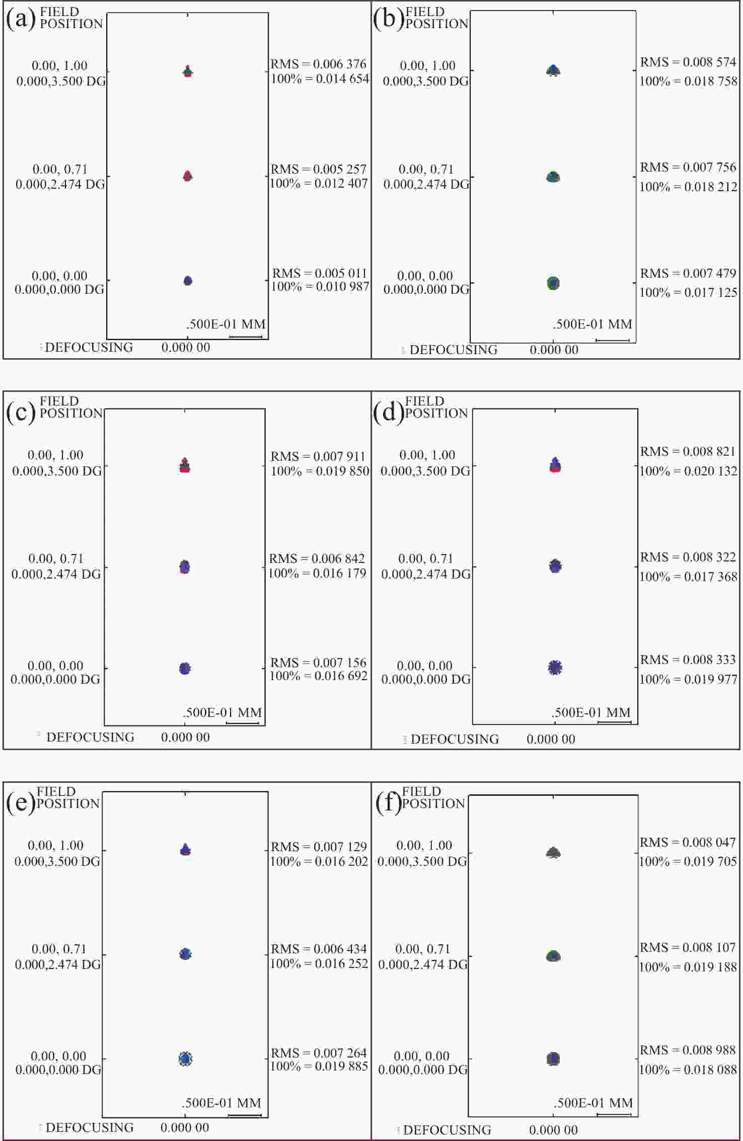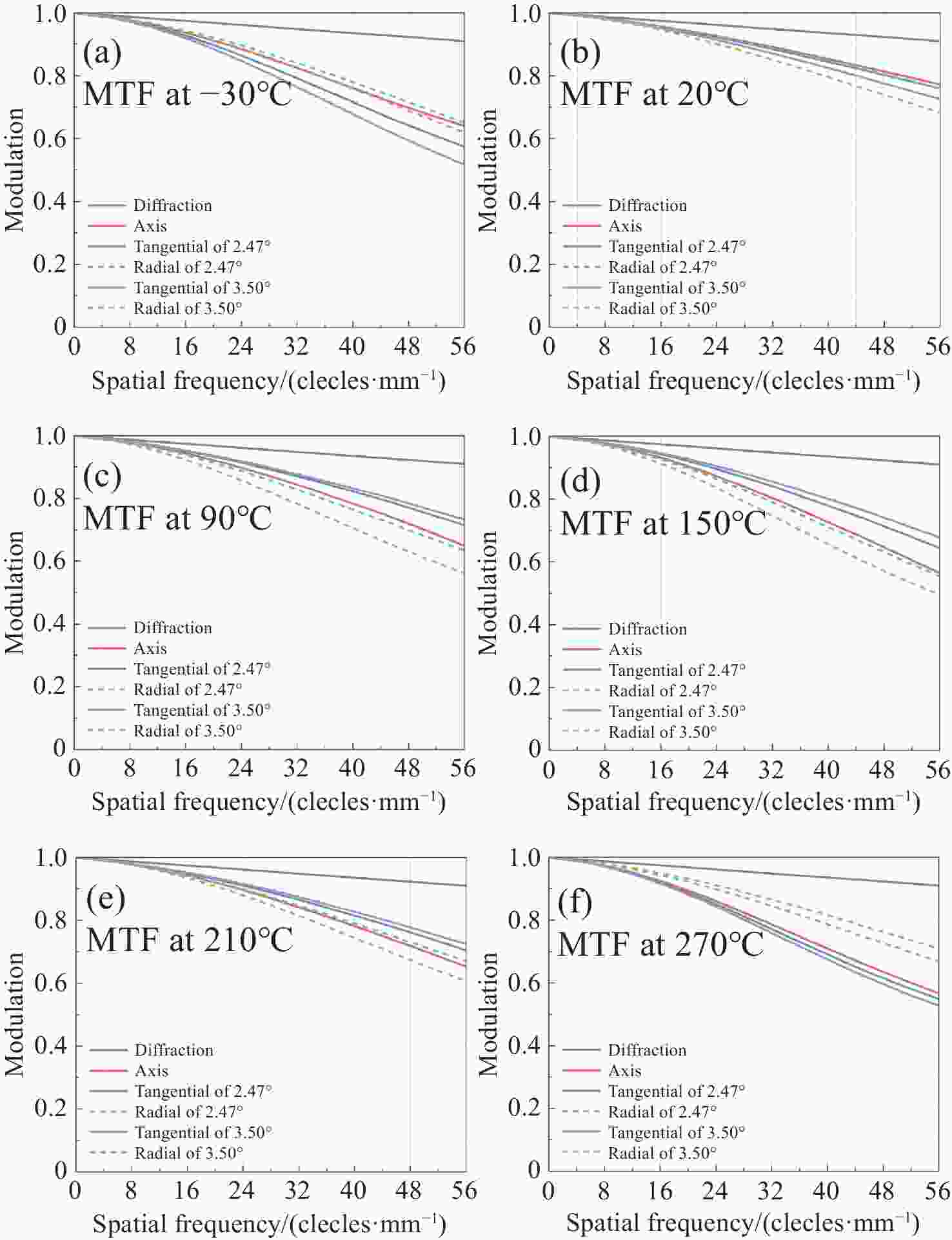 Abstract:In wide-temperature-range applications, traditional optical systems often struggle to maintain stable imaging quality, primarily because conventional athermal design methods fail to fully account for the differences in the linear expansion coefficients and refractive index temperature coefficient of glass materials at high and low temperatures. To address this issue, this paper proposes an athermal design method for wide temperature ranges. By reconstructing the thermal aberration modeling process, the method accurately characterizes the nonlinear response of thermal aberrations to temperature variation, thereby selecting glass material combinations that minimize the overall thermal optical power within the wide temperature range. In combination with the thermal expansion properties of the housing material, it effectively suppresses system focal shift. To validate the effectiveness of the proposed method, an optical system with a focal length of 100 mm, an F-number of 2.2, and a field of view of 7° was designed. Simulation results show that within the temperature range of −30°C to 270°C, the system consistently maintains high imaging performance. The modulation transfer function (MTF) remains above 0.5 at 56 lp/mm across all fields and temperatures. The spot diameter is less than 9 μm, and more than 90% of the energy is enclosed within an 18 μm circle. The above results fully verify the effectiveness of the proposed method and provide strong support for athermal design of optical systems under wide temperature ranges. Meanwhile, the method demonstrates good engineering adaptability and shows broad application prospects in the design of imaging systems for complex environments.