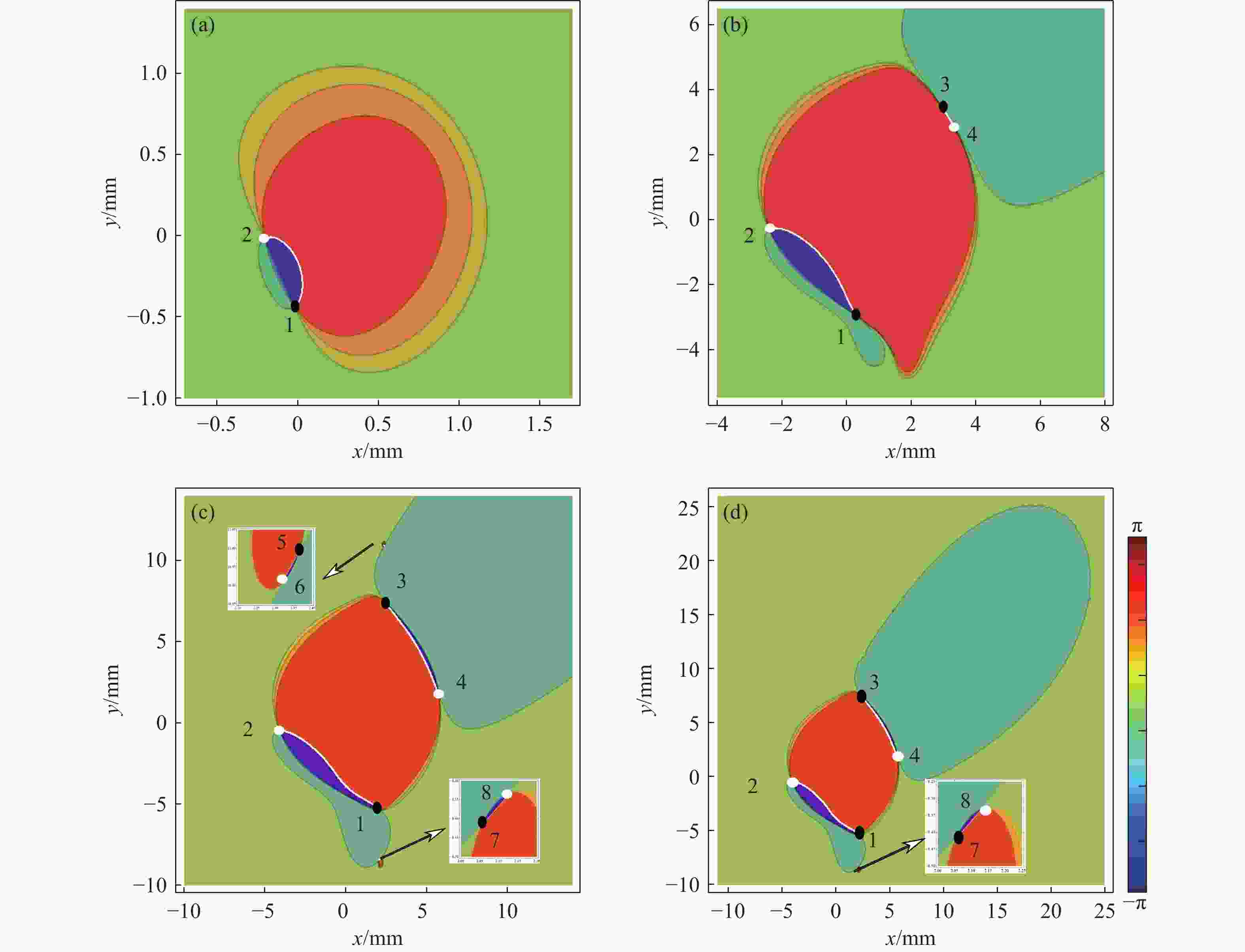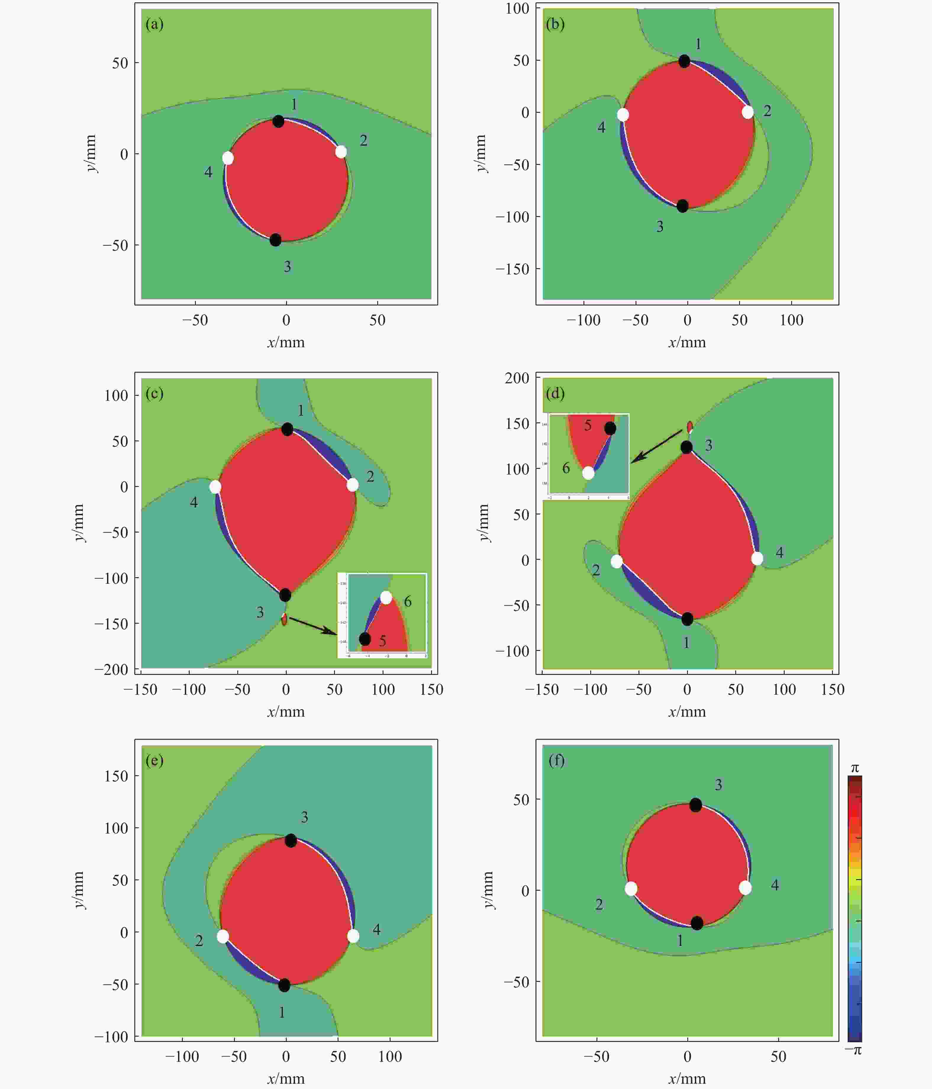 图 3 GSMV光束海洋湍流中不同离轴参数 s 的 S12等相位图。(a) s = −0.8 mm;(b) s = −0.46 mm;(c) s = −0.41 mm; (d) s = 0.41 mm; (e) s = 0.46 mm; (f) s = 0.8 mm