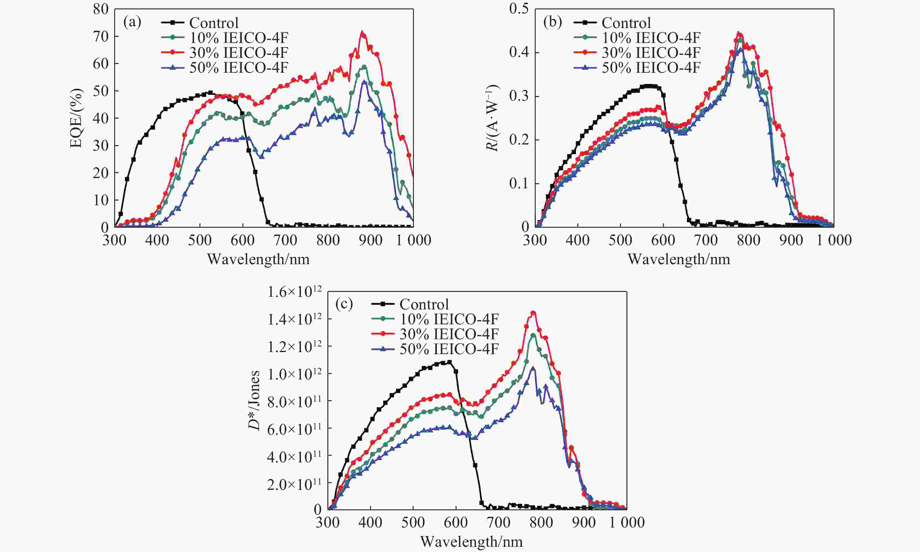 (×1012 Jones)Control 19.17 (±0.35) 3.81 (±0.32) 323.1 (±0.01) 0.78 (±0.18) 10% 24.36 (±0.42) 4.06 (±0.27) 354.5 (±0.03) 1.13 (±0.25) 30% 27.25 (±0.39) 1.70 (±0.18) 409.9 (±0.01) 1.45 (±0.14) 50% 9.07 (±0.34) 7.85 (±0.22) 30.1 (±0.02) 0.09 (±0.11) 表 2 不同IEICO-4F掺杂比例下的器件阻抗参数