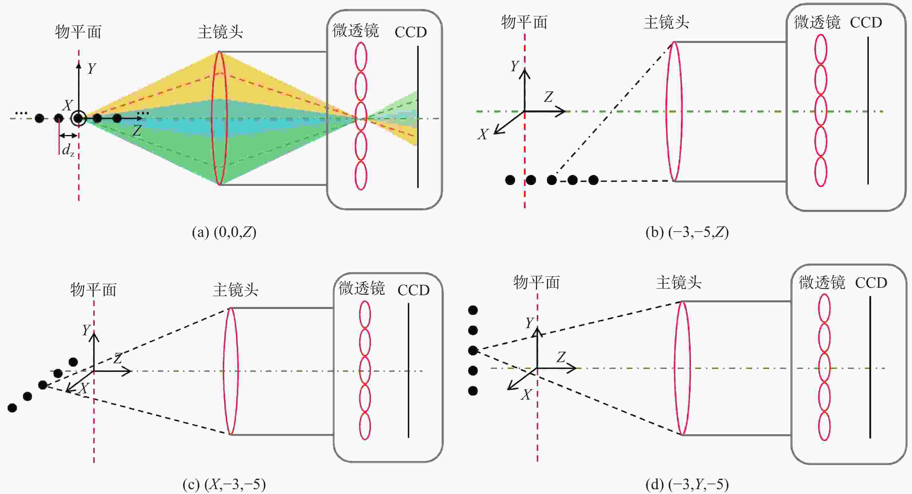 M l )对光场相机深度分辨率的影响。结果表明,光场相机在物平面与光轴交点附近以外的区域具有较高的深度分辨率。光场相机2.0在(0,0,0)附近区域的深度分辨率优于光场相机1.0。对于正方形排列的微透镜阵列,光场相机2.0的横向分辨率较光场相机1.0略有提升。光场相机1.0的深度分辨率随着M l 的增大而逐渐降低。Abstract:In the process of 3D scene reconstruction, the spatial resolution of the light field camera (LFC) affects the recoverable spatial details as well as the depth resolution, thereby influencing the accuracy of the 3D reconstruction. Therefore, calculating and analyzing the spatial resolution of the LFC is crucial for identifying the high and low resolution regions. In this paper, a calculation method for the spatial resolution of an LFC is explored based on the forward ray-tracing technique, which has the advantage of high accuracy. The spatial resolutions of LFC 1.0 and LFC 2.0 under different microlens array configurations are quantitatively calculated and compared. In addition, the effects of the inverse magnification (