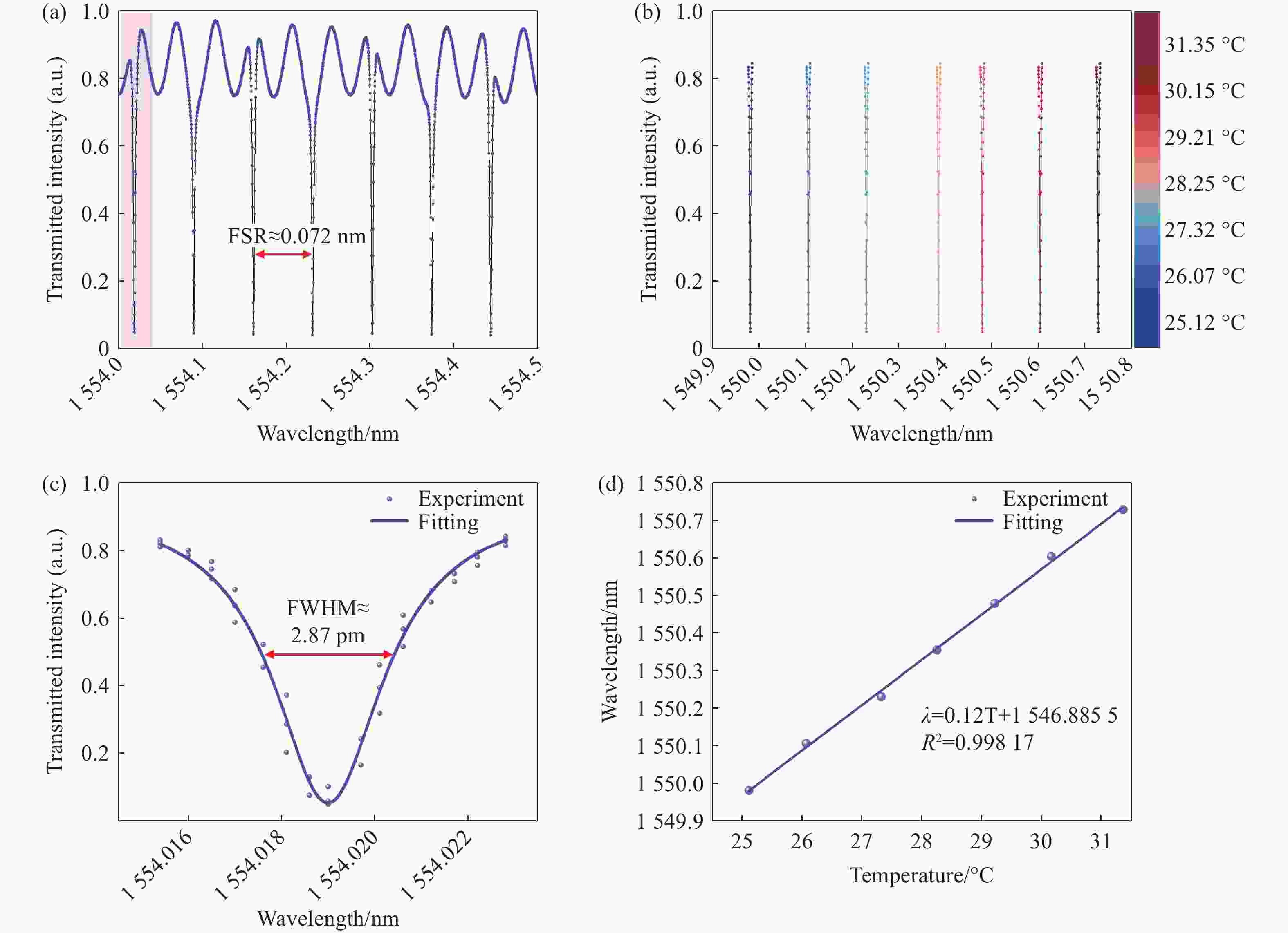 图 4 铌酸锂微环谐振温度传感器在波长域的响应特性。(a)微环谐振器透射光谱;(b)25 °C至31 °C温度调制下的谐振波长漂移;(c)微环谐振器线宽表征;(d)温度-波长的线性相关性及拟合函数