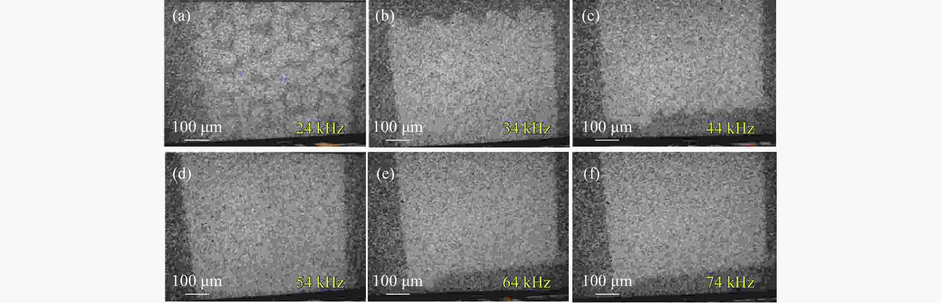 图 11 脉宽 200 ns和功率 175 W (35%),重复频率分别为 15 kHz、 25 kHz、 35 kHz、 45 kHz、 55 kHz、 65 kHz激光清洗显微镜样貌图
