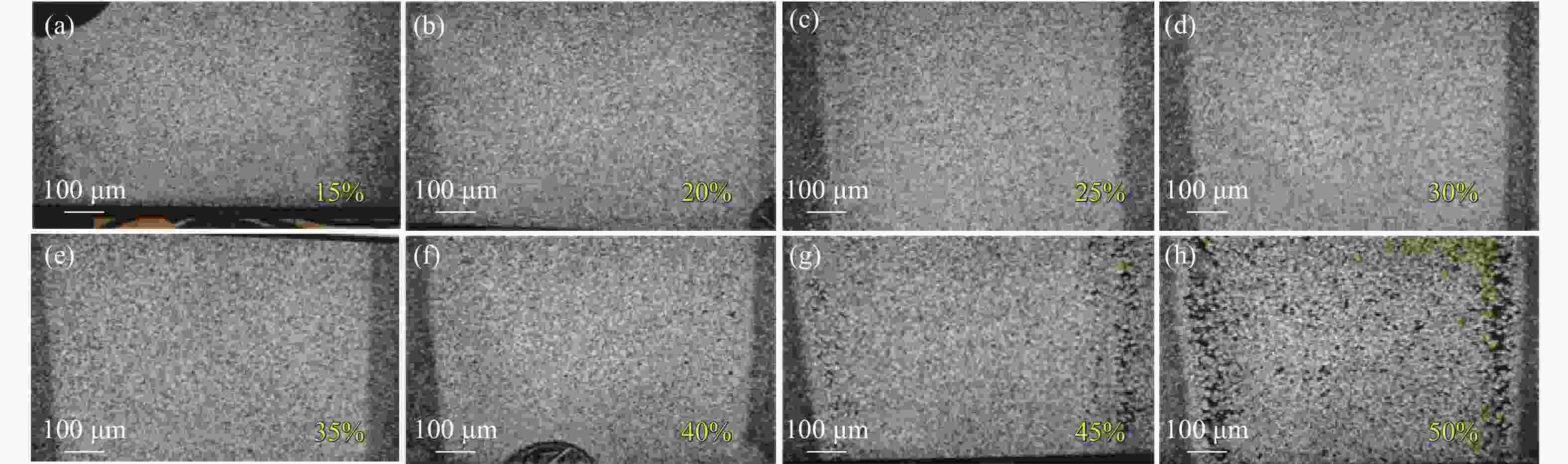 图 7 脉宽200 ns 和重频45 kHz时,功率分别为最大功率的(a) 15%、(b) 20%、(c) 25%、(d) 30%、(e) 35%、(f) 40%、(g) 45%、(h) 50%激光清洗显微镜样貌图