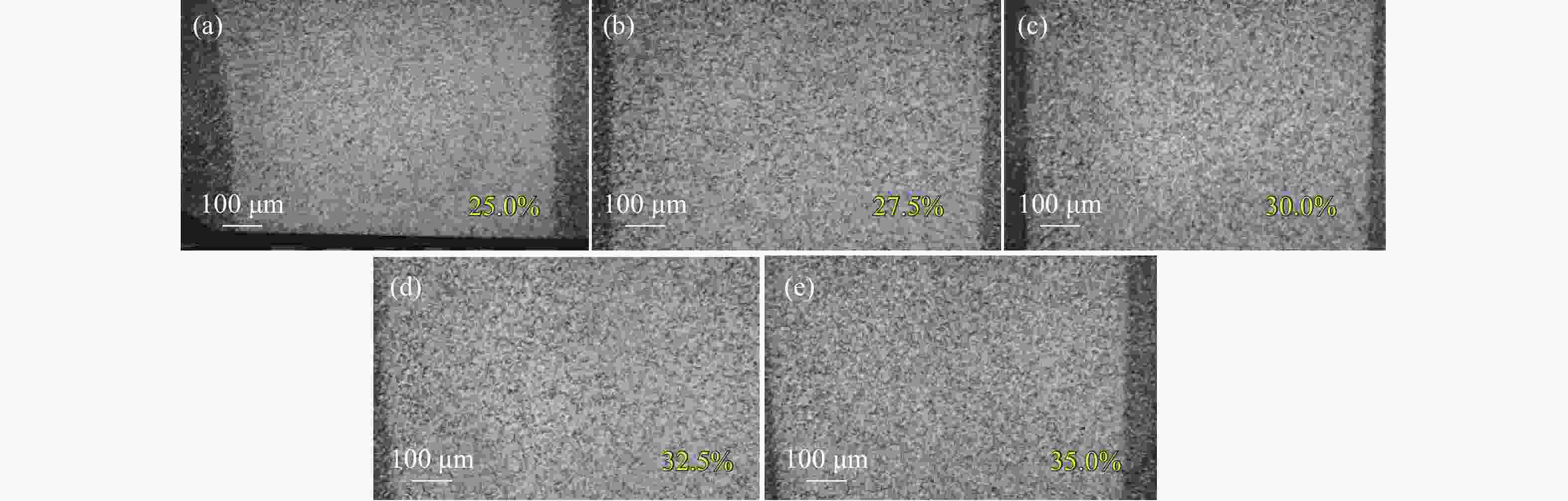 图 8 脉宽200 ns、重频45 kHz时,功率分别为最大功率的(a) 25%、(b) 27.5%、(c) 30%、(d) 32.5%、(e) 35%对应的激光清洗显微镜样貌