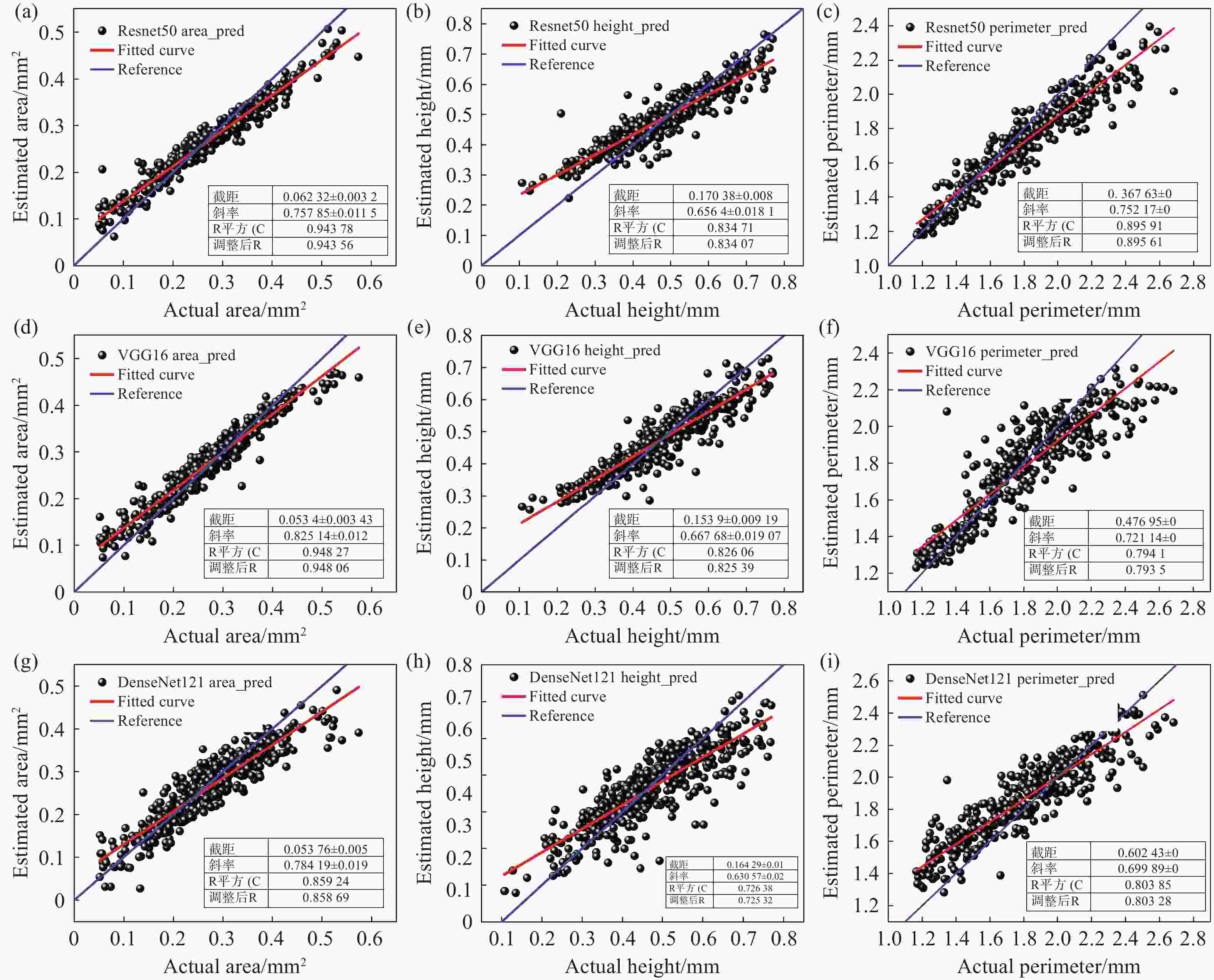 图 7 三种网络架构RGB模型预测-真实散点对比。(a)、(b)、(c)分别为面积、高度、周长ResNet50预测结果;(d)、(e)、(f)分别为面积、高度、周长VGG16预测结果;(g)、(h)、(i)分别为面积、高度、周长DenseNet121预测结果