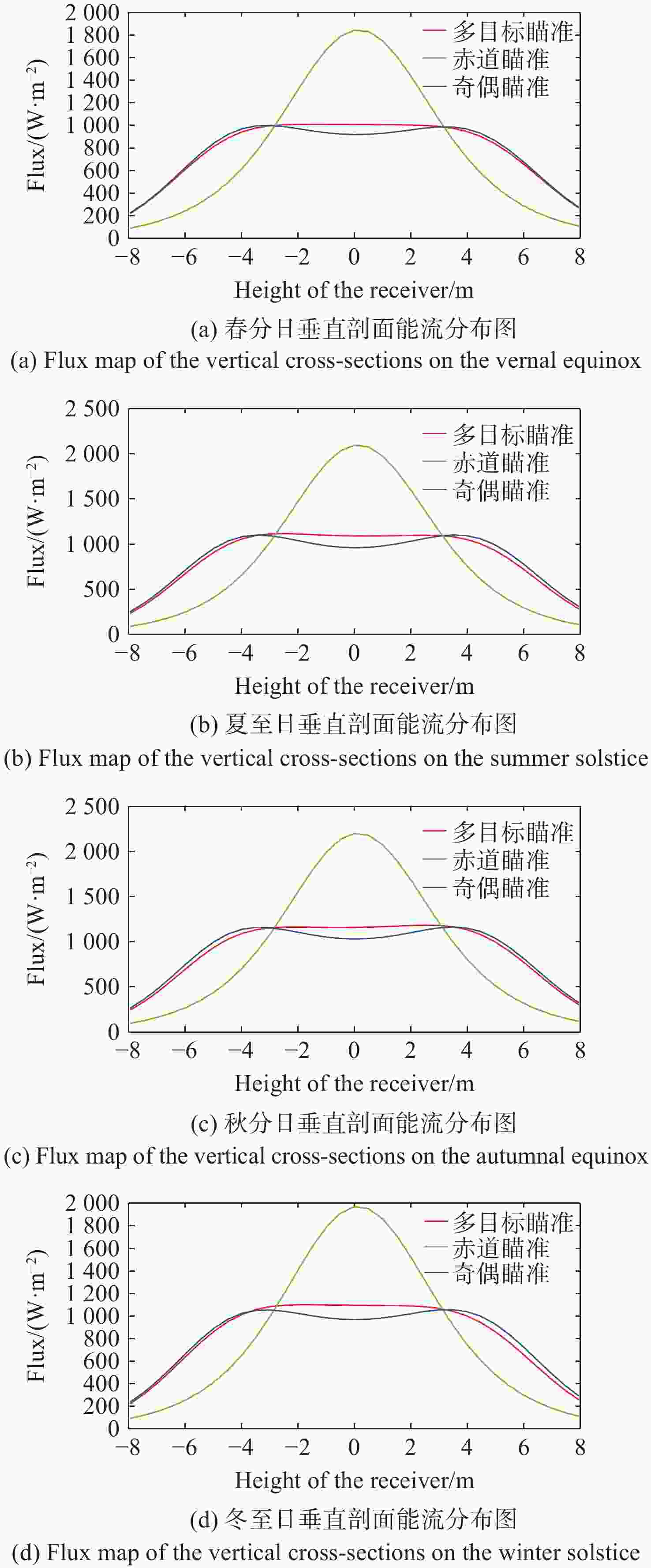 典型日(天) 时刻(h) DNI(KW/m2) 瞄准因子[$ {K}_{1},{K}_{2},{K}_{3} $] 峰值能流(MW/m2) 截断因子(%) $ \Delta {f}_{{\mathrm{int}}} $(%) CV 春分日(81) 12.0 0.850 赤道瞄准 1.9431 82.02 0.0 0.4503 [1.8] 1.0268 79.79 −2.23 0.2155 [2.0,2.5,3.0] 1.0171 81.16 −0.86 0.2103 夏至日(172) 12.0 0.972 赤道瞄准 2.0974 82.24 0.0 0.4641 [1.8] 1.1036 79.96 −2.28 0.1822 [2.0,2.5,3.0] 1.1214 81.29 −0.95 0.1617 秋分日(264) 12.0 0.964 赤道瞄准 2.2012 82.02 0.0 0.4501 [1.8] 1.1647 79.78 −2.24 0.2096 [2.0,2.5,3.0] 1.1859 81.14 −0.88 0.2019 冬至日(345) 12.0 0.882 赤道瞄准 1.9698 80.65 0.0 0.4507 [3.0] 1.0578 78.51 −2.14 0.2299 [2.0,2.5,3.0] 1.1026 80.07 −0.58 0.2259 -