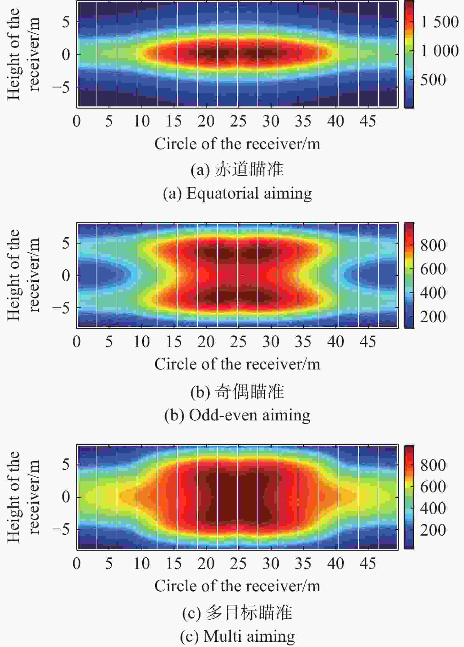 参数名称 数值 地理纬度/° 37.36 定日镜数/面 26667 立柱高度/m 3.2 定日镜高度/m 4.81 定日镜宽度/m 6.29 有效反射面积/m2 30 镜面反射率 0.94 塔光学高度/m 220 吸热器高度/m 16.4 吸热器直径/m 15.8 表 2 赤道瞄准、奇偶瞄准、多目标瞄准在典型日结果对比