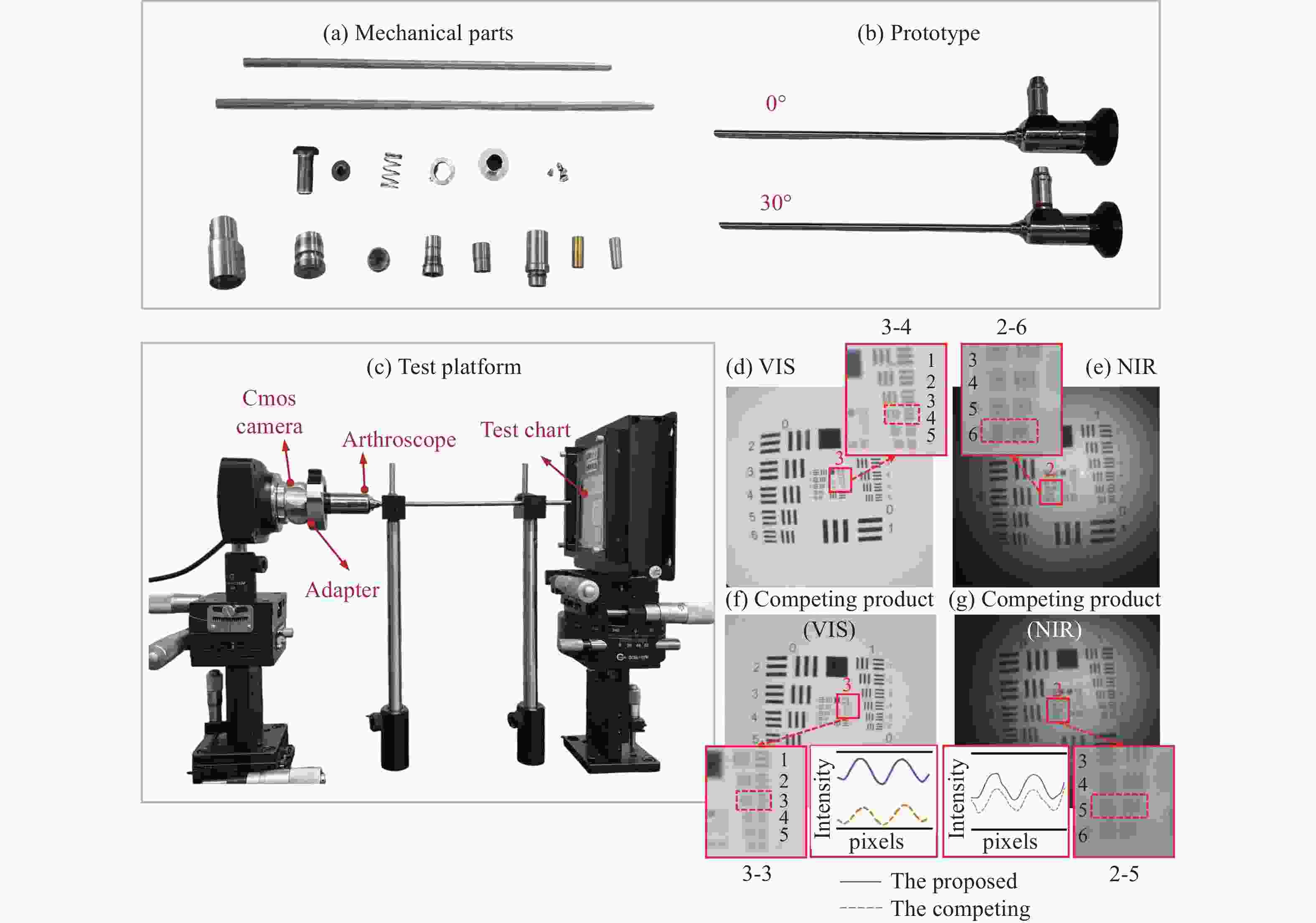 图 10 样机及物方分辨率检测。(a)机械件;(b)样机;(c)测试平台;(d)所设计的关节内窥镜在VIS下;(e)所设计的关节内窥镜在NIR下;(f)竞品关节内窥镜在VIS下;(g)竞品关节内窥镜在NIR下