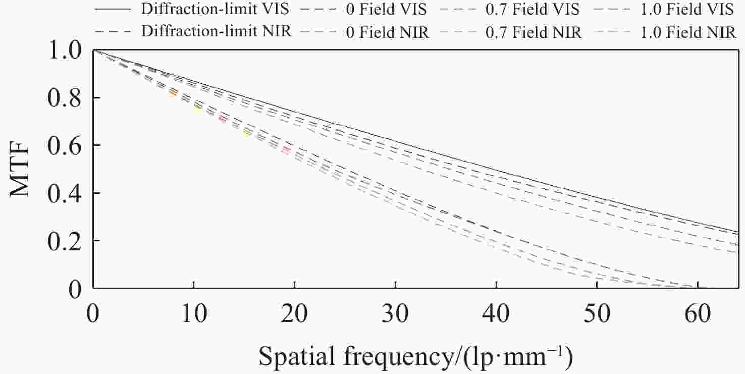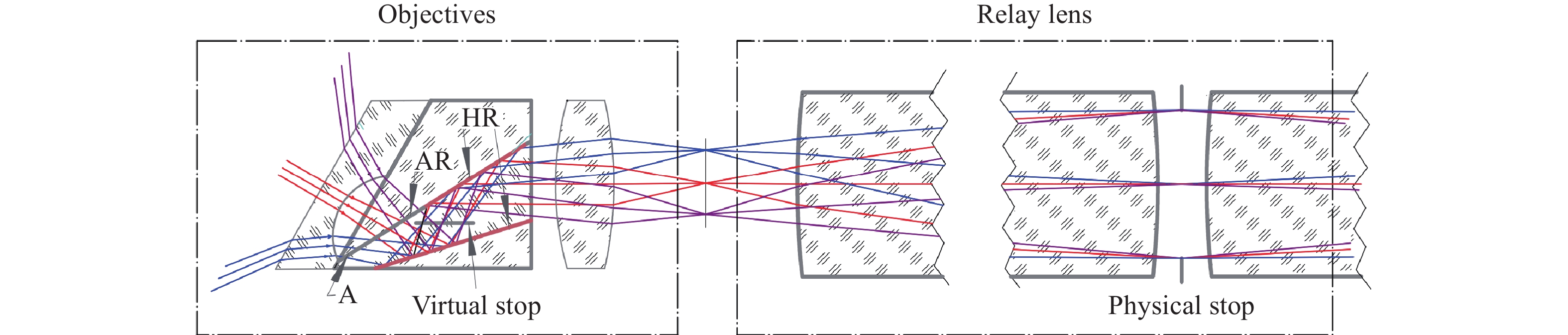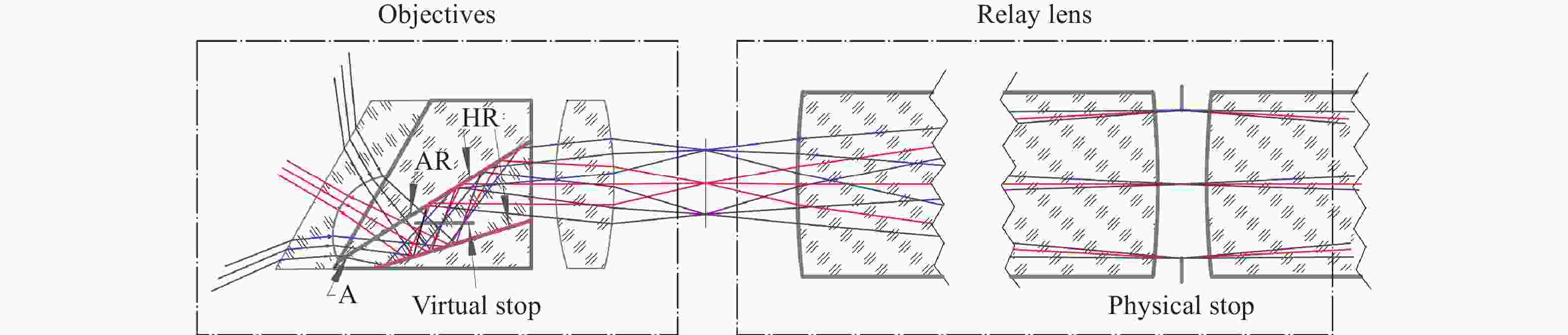 为提升关节内窥镜在临床手术中的成像性能并拓展其应用前景,设计了一种兼具大视场与高分辨率、可见光与近红外宽光谱齐焦成像特性的关节内窥镜光学系统。物镜通过大光焦度负透镜压缩主光线角度、减小轴外与轴上光线的光程差;并利用光阑共轭成像在转向棱镜内形成等效虚拟光阑,以在有限口径下兼顾大视场下的通光效率与高像质。中继镜采用三级近对称结构,通过光焦度与阿贝数分配有效抑制宽光谱传像过程中的轴向色差累积,从而实现齐焦成像。经公差分析表明,该系统具有良好制造与装调可实现性。实验结果验证了所设计的宽光谱关节内窥镜在95°视场角下可实现可见光与近红外波段齐焦成像,角分辨力分别为4.34 C/(°)和2.74 C/(°),光学系统为低成本实现高性能荧光内窥镜提供了可行方案,具备重要的应用价值。