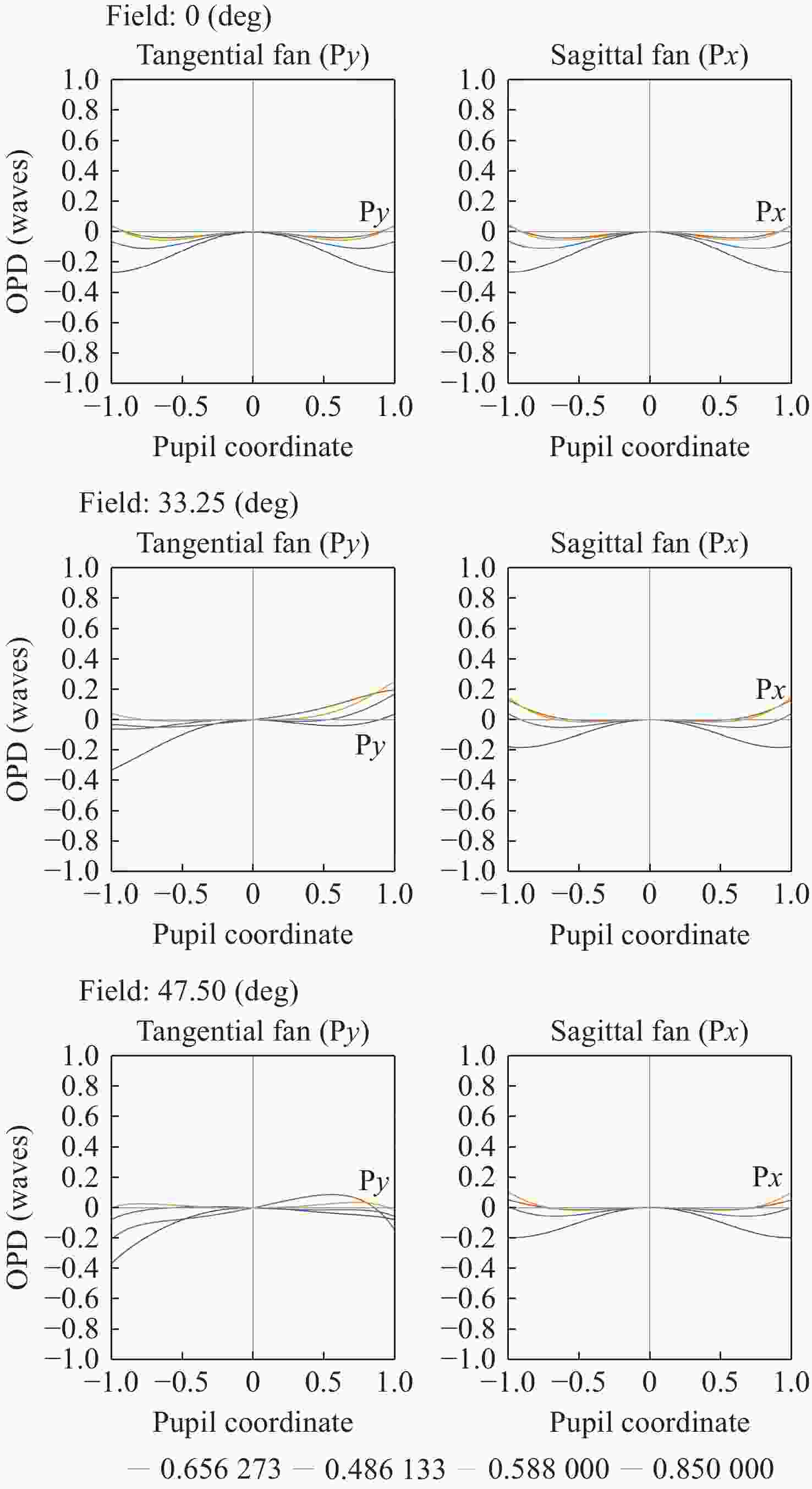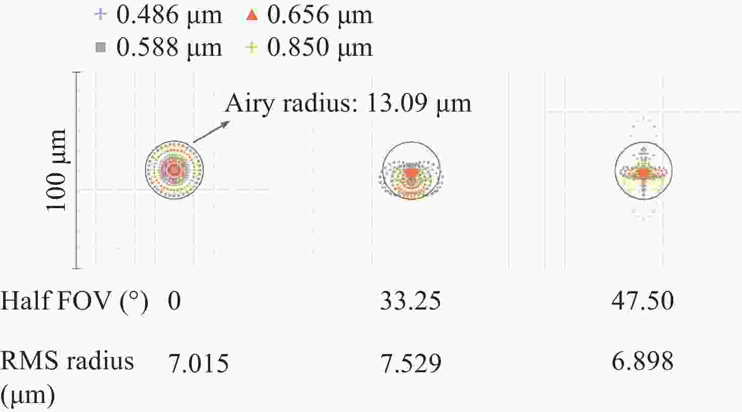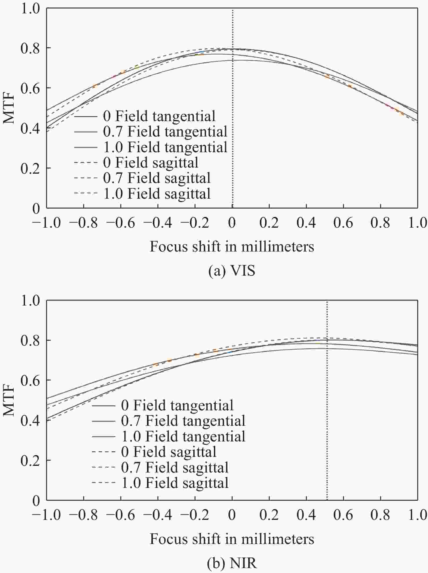 为提升关节内窥镜在临床手术中的成像性能并拓展其应用前景,设计了一种兼具大视场与高分辨率、可见光与近红外宽光谱齐焦成像特性的关节内窥镜光学系统。物镜通过大光焦度负透镜压缩主光线角度、减小轴外与轴上光线的光程差;并利用光阑共轭成像在转向棱镜内形成等效虚拟光阑,以在有限口径下兼顾大视场下的通光效率与高像质。中继镜采用三级近对称结构,通过光焦度与阿贝数分配有效抑制宽光谱传像过程中的轴向色差累积,从而实现齐焦成像。经公差分析表明,该系统具有良好制造与装调可实现性。实验结果验证了所设计的宽光谱关节内窥镜在95°视场角下可实现可见光与近红外波段齐焦成像,角分辨力分别为4.34 C/(°)和2.74 C/(°),光学系统为低成本实现高性能荧光内窥镜提供了可行方案,具备重要的应用价值。