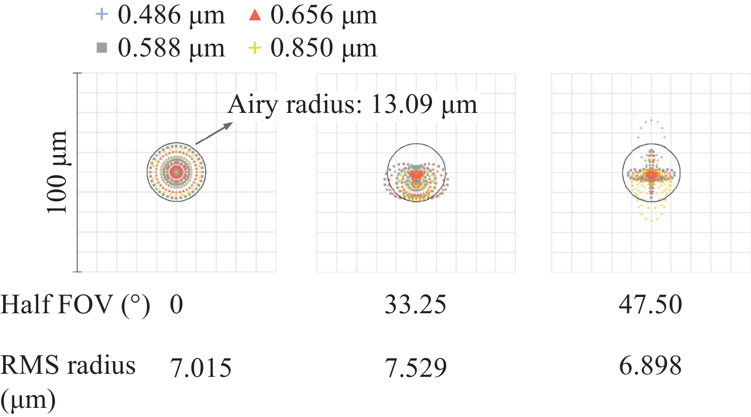 Abstract:To enhance the imaging performance of arthroscopes in clinical surgery and broaden their potential for clinical applications, a wide-spectrum arthroscopic optical system featuring a large field of view, high resolution, and parfocal imaging capability in both visible and near-infrared bands was designed. The objective lens use a high optical power negative lens to compress the chief-ray angle and reduce the optical path difference between off-axis and on-axis rays. Through conjugate aperture imaging, an equivalent virtual stop is formed inside the turning prism, which allows the system to maintain both high transmission efficiency and high image quality under a limited aperture. The relay lens adopts a near-symmetric structure, and by distributing optical power and Abbe numbers appropriately, it effectively suppresses the accumulation of axial chromatic aberration across the broad spectral range, thereby achieving parfocal imaging. Tolerance analysis shows that the system has good manufacturability and assembly feasibility. Experimental results verify that the designed wide-spectrum arthroscope achieves parfocal imaging in the visible and near-infrared bands with a 95° field of view, and angular resolutions of 4.34 C/(°) and 2.74 C/(°), respectively. The optical system provides a feasible solution for achieving low-cost, high-performance fluorescence arthroscopy and has significant application value.