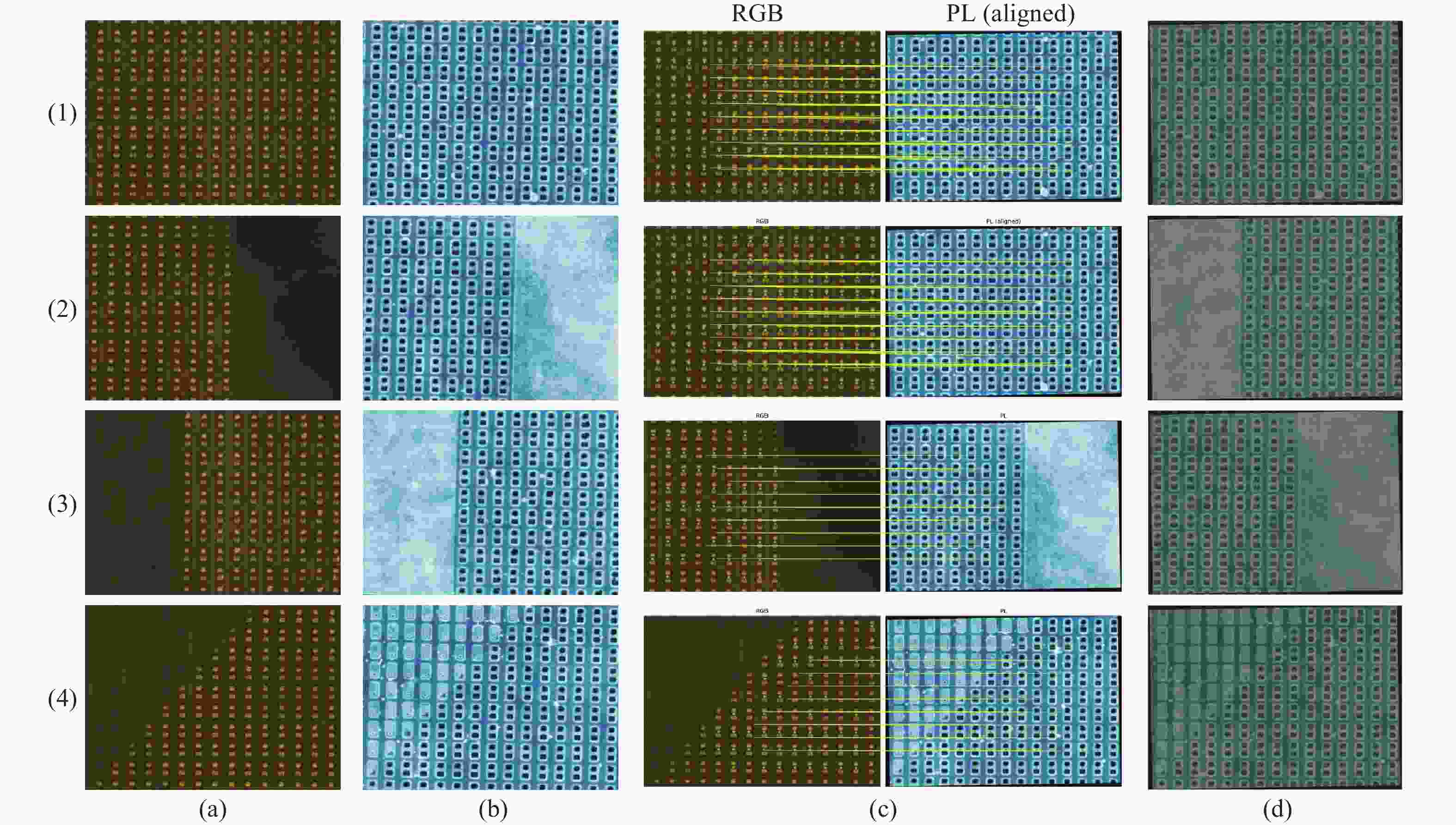 针对Micro LED缺陷检测中可见光(RGB)与光致发光(Photoluminescence, PL)图像因模态差异较大而难以实现高精度配准的难题,本研究致力于开发一种具备亚像素级精度和高鲁棒性的多模态图像配准方法,从而建立芯片物理结构与电学性能之间的映射关系。我们提出了一种结合结构特征约束与双向残差优化的配准方法:首先,基于Micro LED规则阵列的几何特性,设计了差异化的特征检测策略:在RGB图像中,通过椭圆拟合和基于密度的空间聚类算法(Density-Based Spatial Clustering of Applications with Noise, DBSCAN)精确提取电极中心;而在PL图像中,则采用改进的分水岭算法结合亚像素精修技术来定位芯片中心。其次,在配准优化阶段构建了双向残差约束框架,并引入基于残差分布的置信度加权机制,通过迭代重加权最小二乘法求解最优仿射变换参数。实验结果表明,本方法的平均绝对误差(Mean Absolute Error, MAE)为0.823像素,达到了亚像素级精度;与基线方法相比,MAE显著降低了94.2%。同时,均方根误差(Root Mean Square Error, RMSE)为0.996像素,最大误差(Max Error)控制在2.839像素以内,内点率达到75.0%,单次配准平均耗时仅为0.036秒,与互信息(Mutual Information, MI)等传统方法相比,运行效率实现了数量级提升。基于上述策略,本方法有效克服了多模态图像中的特征失配和异常点干扰问题,在配准精度、鲁棒性和效率方面均优于传统方法,为Micro LED芯片的精确缺陷检测与多模态分析提供了可靠的技术基础。