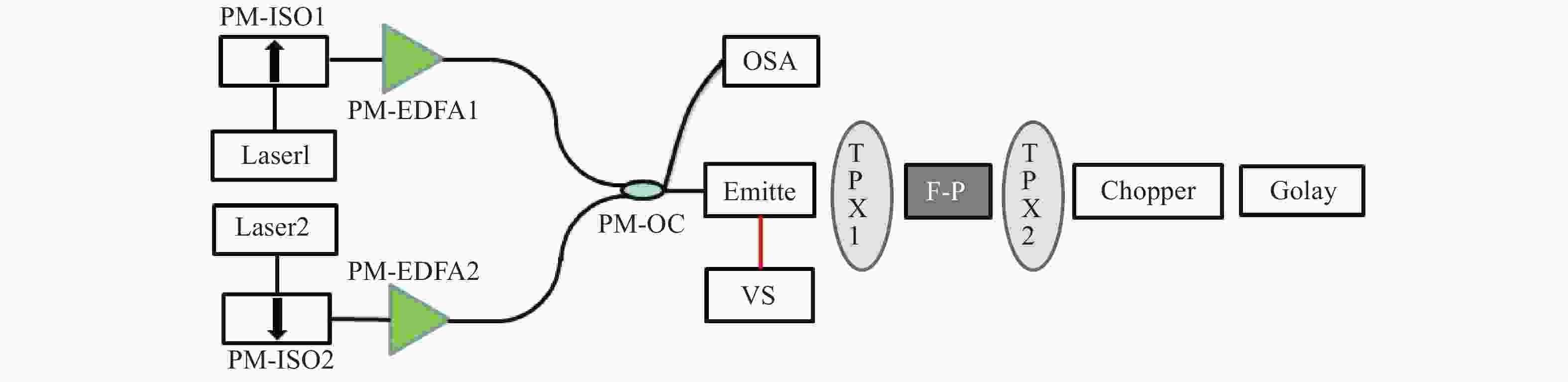 Figure 2.  Structural diagram of continuous THz radiation source. PM: Polarization-maintaining; ISO: Isolator; EDFA: Erbium-doped fiber amplifier; OC: Optical Coupler; OSA: Optical spectrum analyzer; VS: Voltage source; TPX: Terahertz lens; F-P: Terahertz scanning Fabry-Perot interferometer