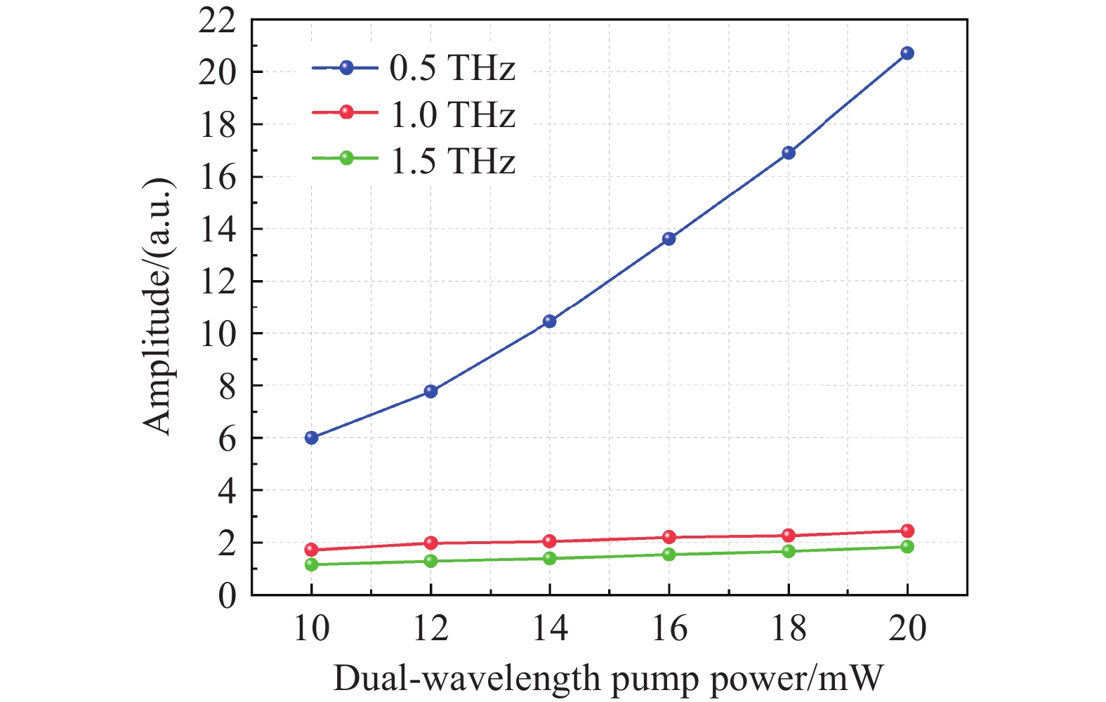 Figure 7.  Relationship between Terahertz Output Intensity and Total Power of Dual-Wavelength Laser Pumping