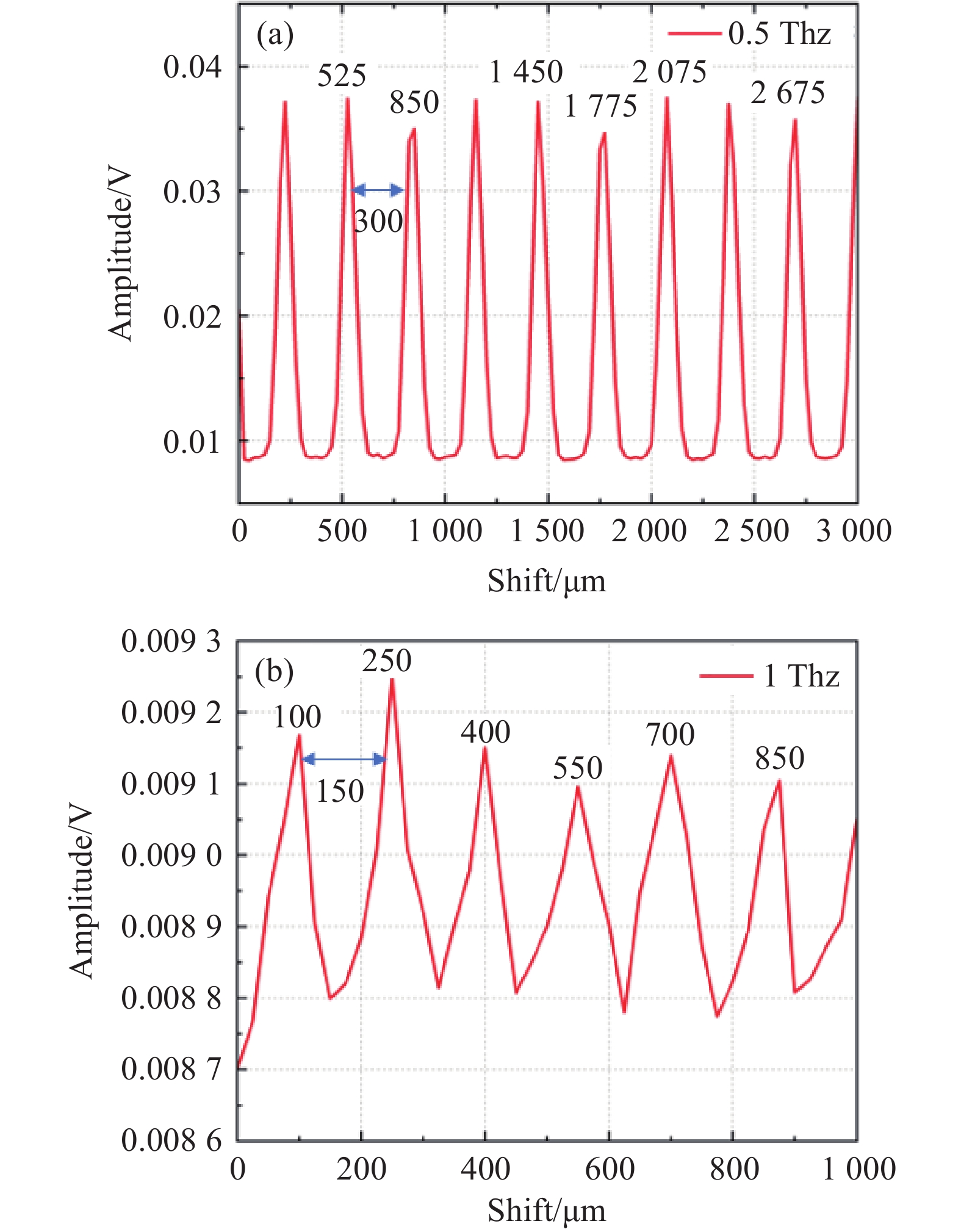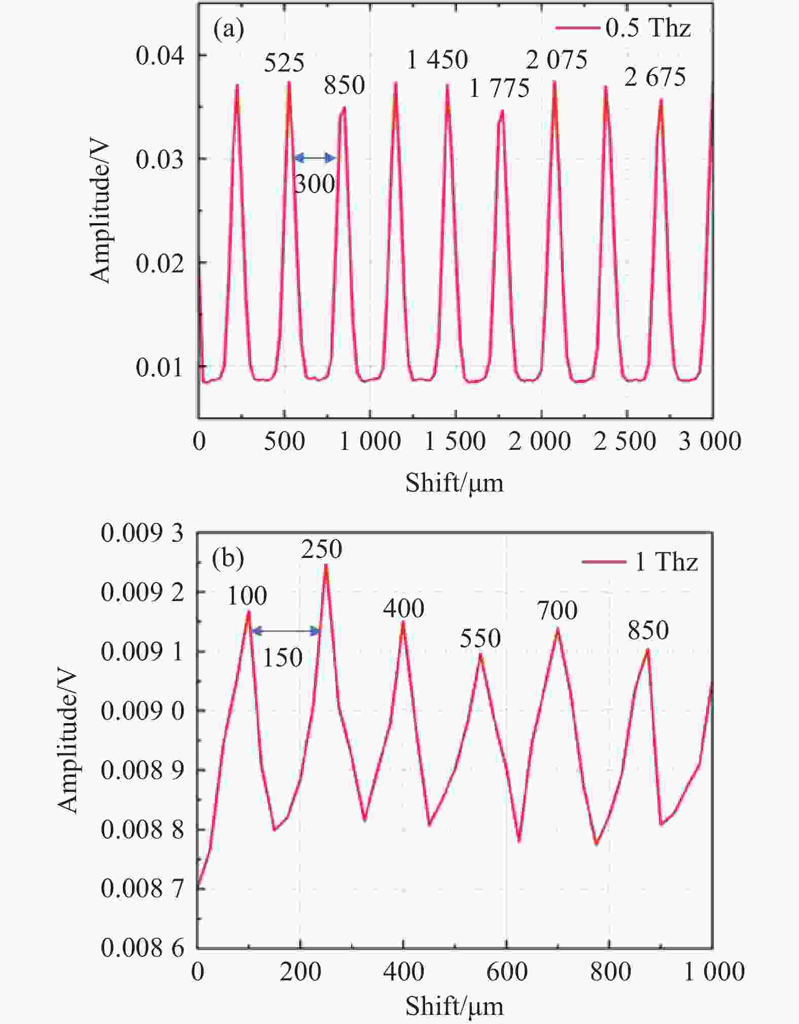 图 8  (a) 0.5 THz频率测试曲线;(b) 1 THz频率测试曲线