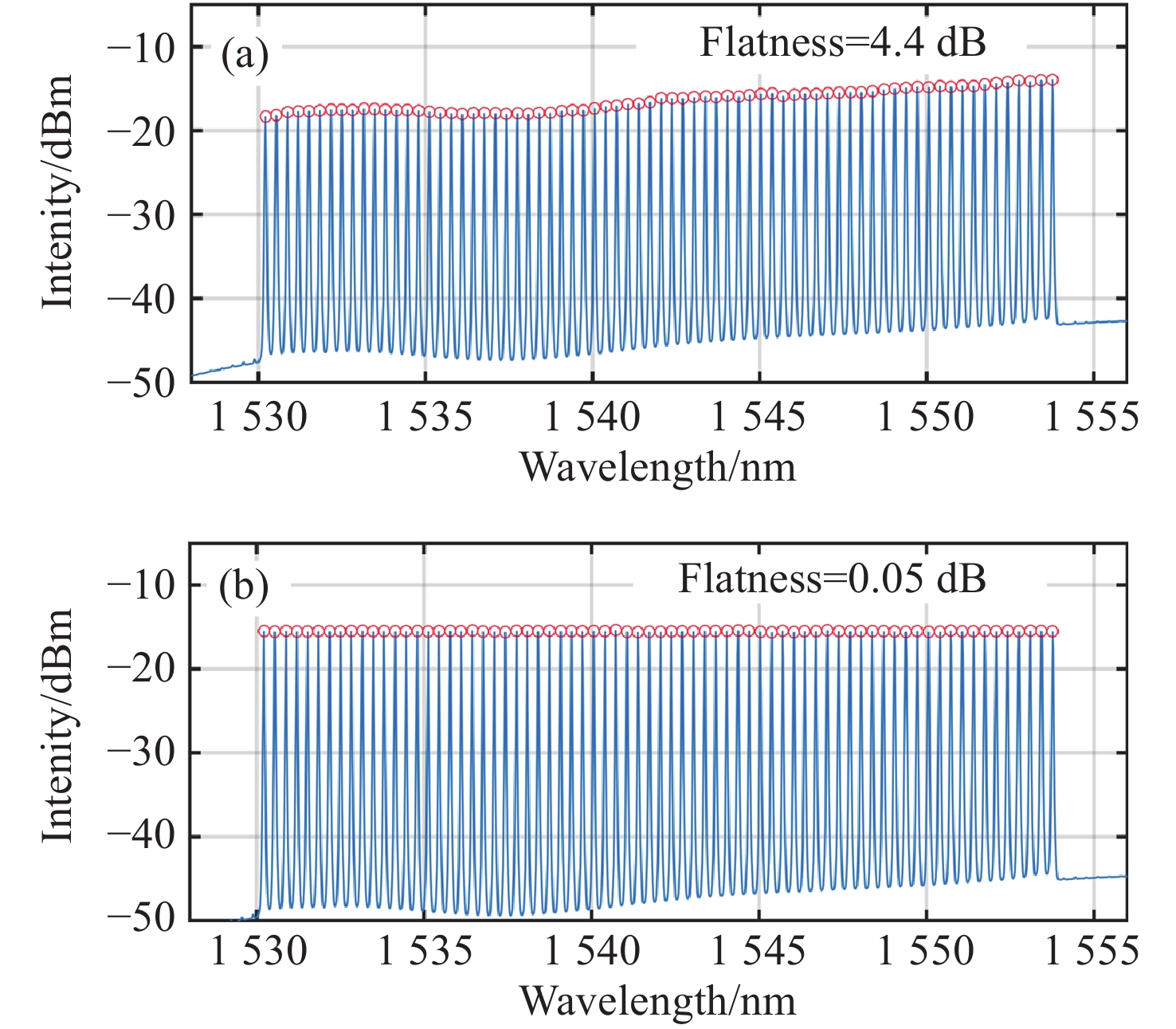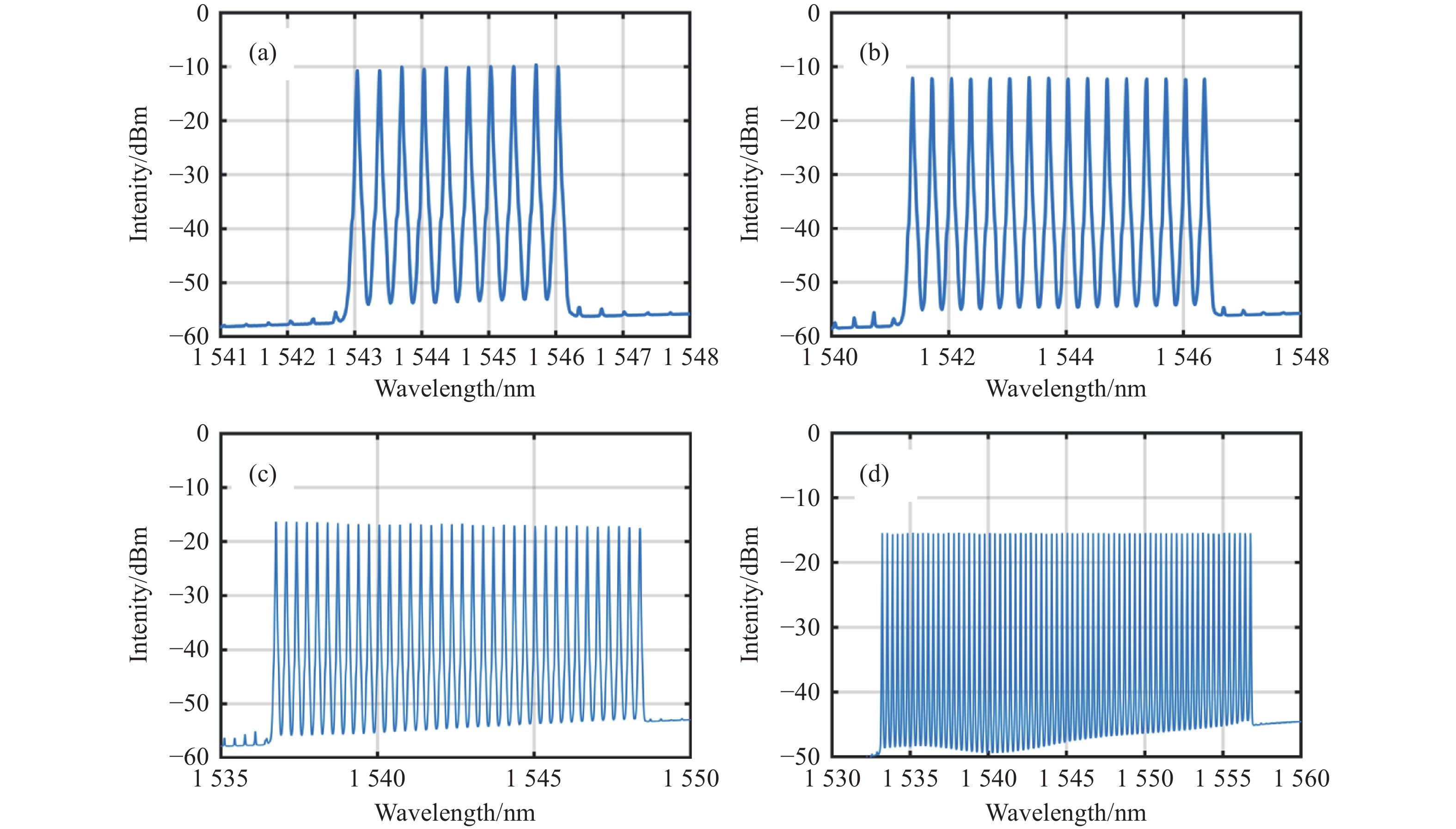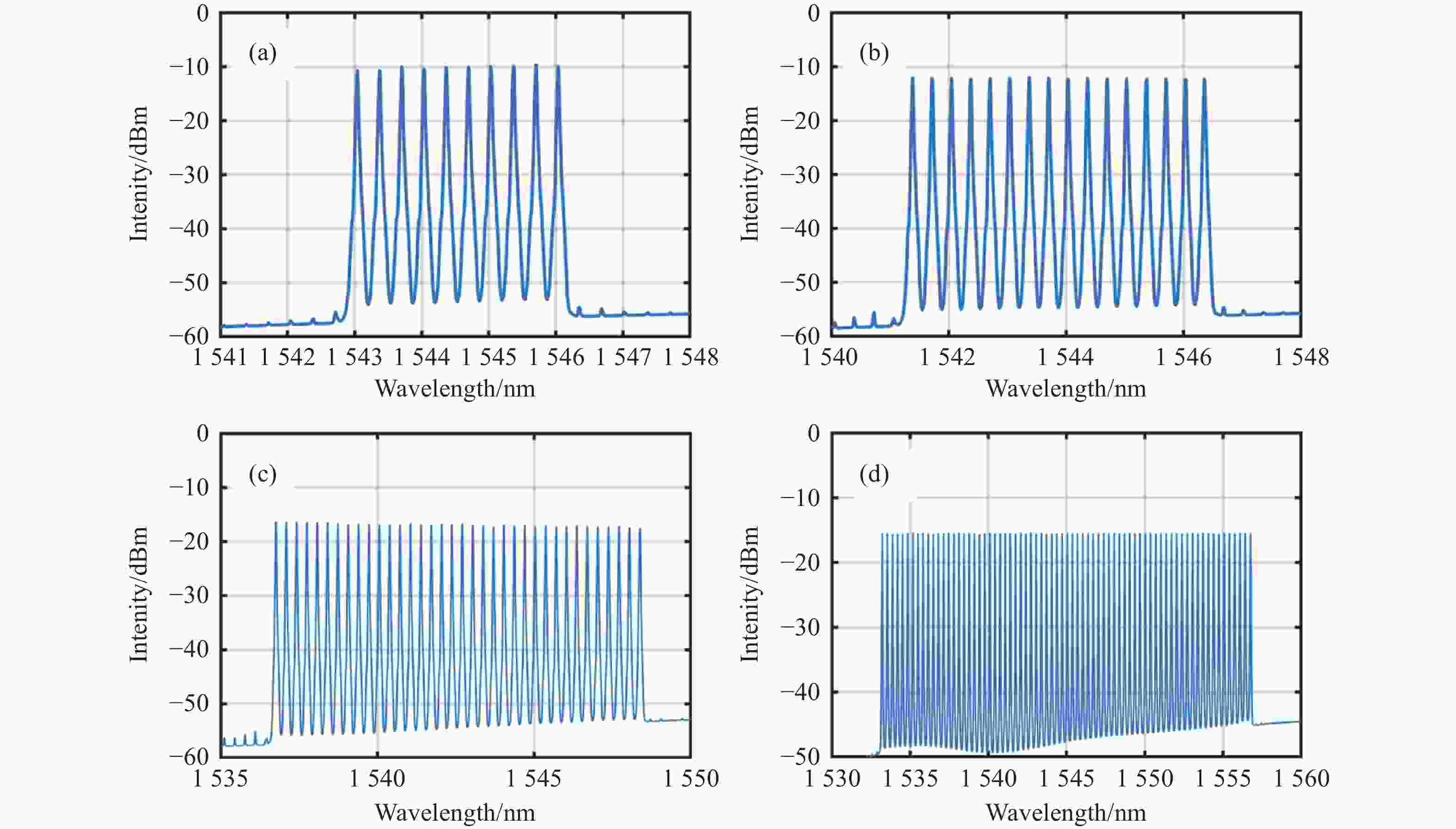 图 4  对应于不同抽头数的形状梳的光谱。(a)10个抽头;(b)16个抽头;(c)36个抽头;(d)72个抽头;