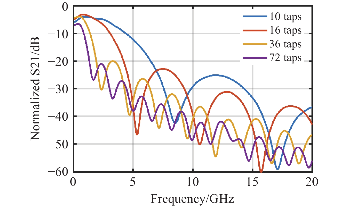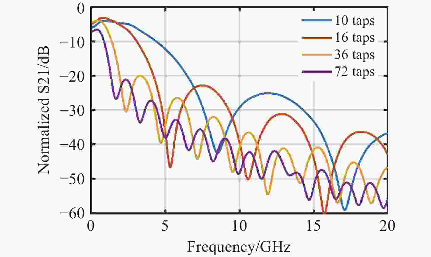 Figure 5.  Sinc-style photonic RF filters with different tap numbers.