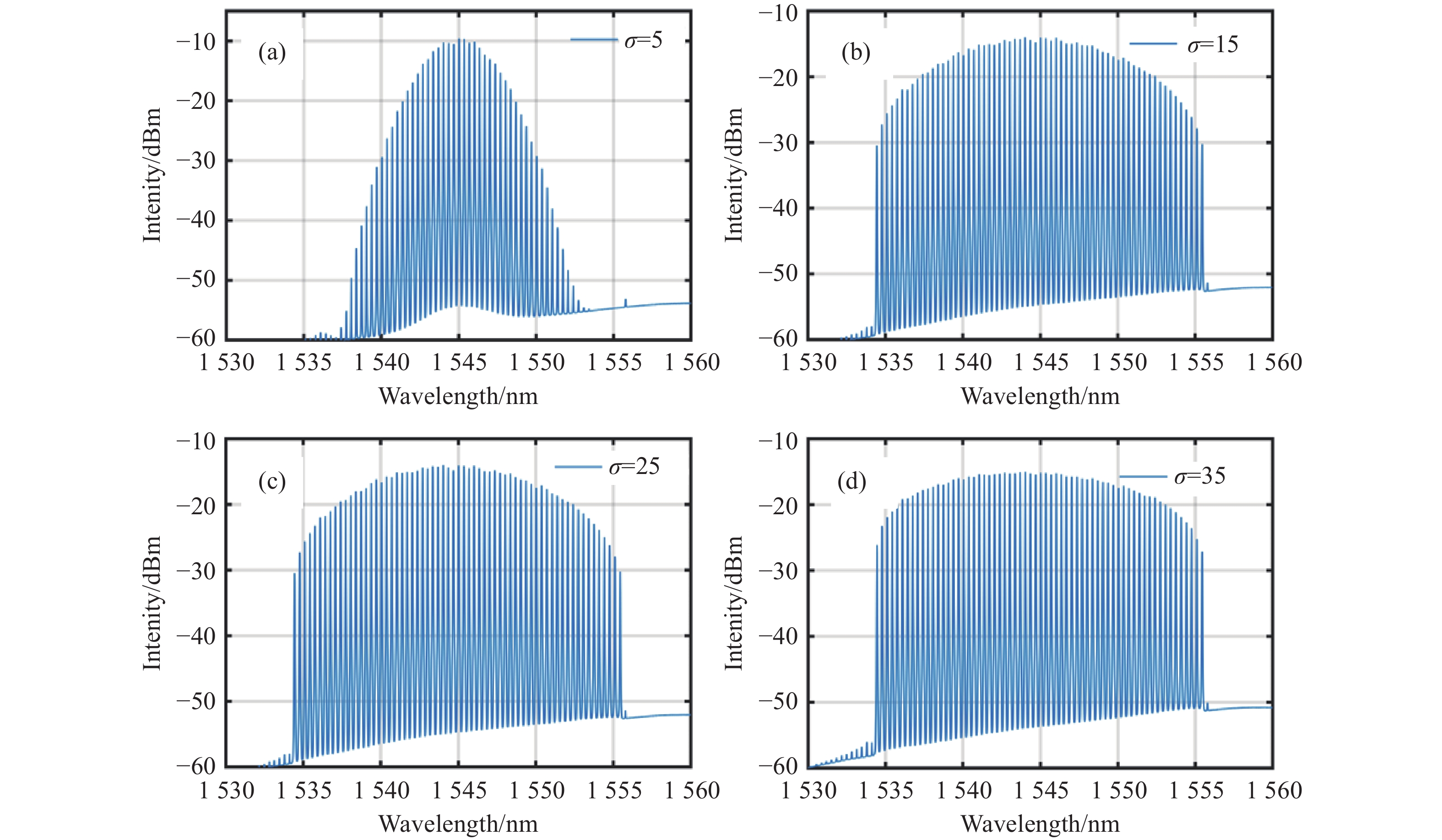 Figure 6.  Optical spectra of the Gaussian-apodized sinc filter. (a) σ=5, (a) σ=15, (a) σ=25, (a) σ=35.