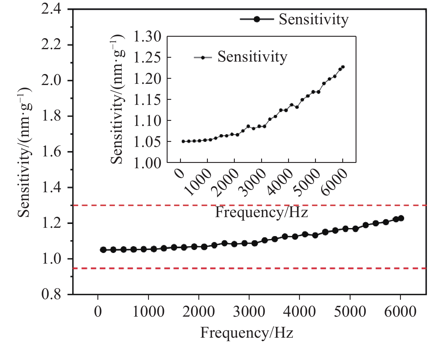 0.8915 nm/g. After temperature compensation, the maximum residual sum of squares (RSS) of the sensor is 0.168, and the full-scale nonlinearity error does not exceed 1.033%. In dynamic response tests, the characteristic frequency of the sensor is considerably higher than6000 Hz. The sensor exhibits high flatness within the frequency response range of 100−2000 Hz, and its sensitivity gradually increases between 2000 Hz and6000 Hz, with a maximum increment of only 0.177 nm/g. Featuring high consistency, adhesive-free integration, and electromagnetic immunity, this sensor provides a robust solution for vibration measurement in high-temperature environments.-