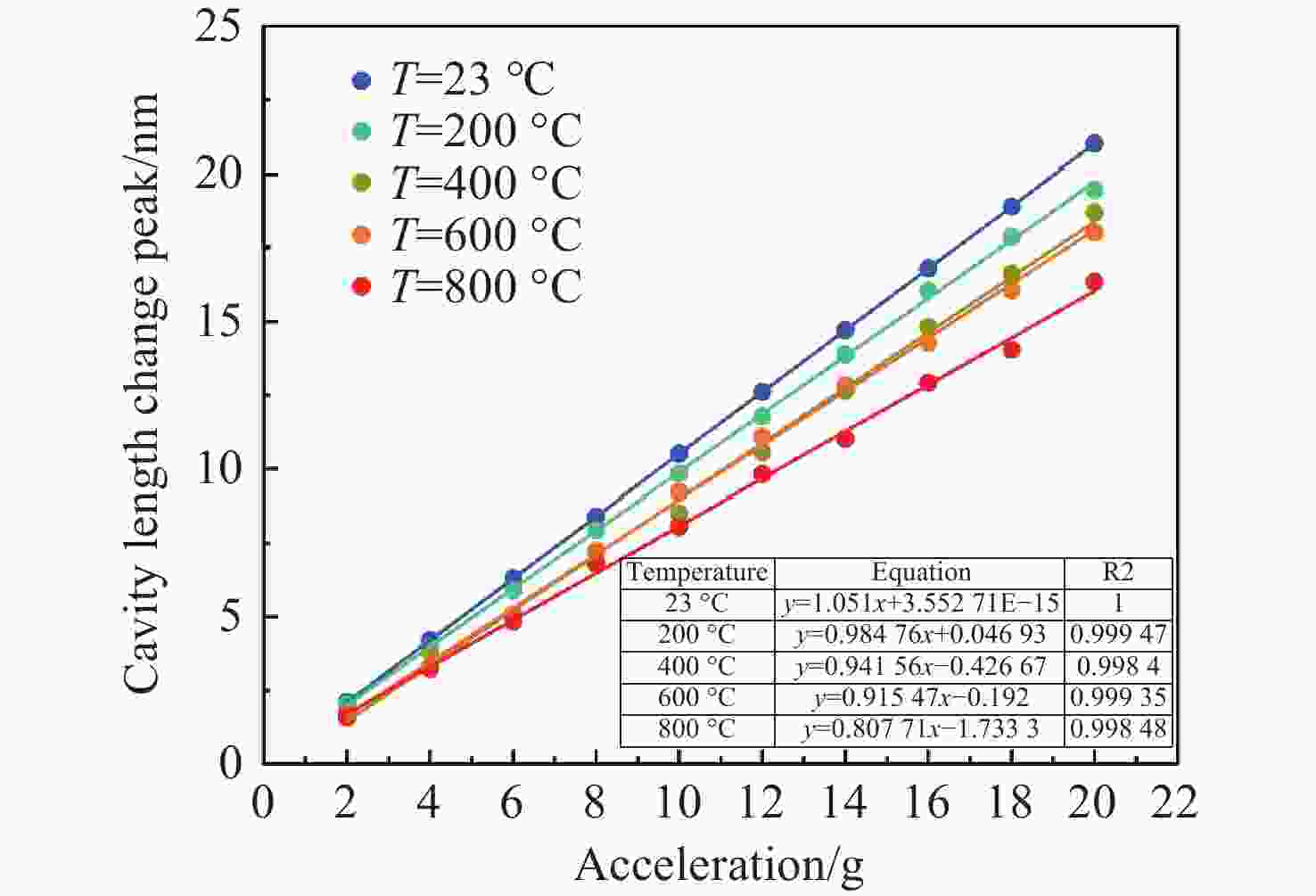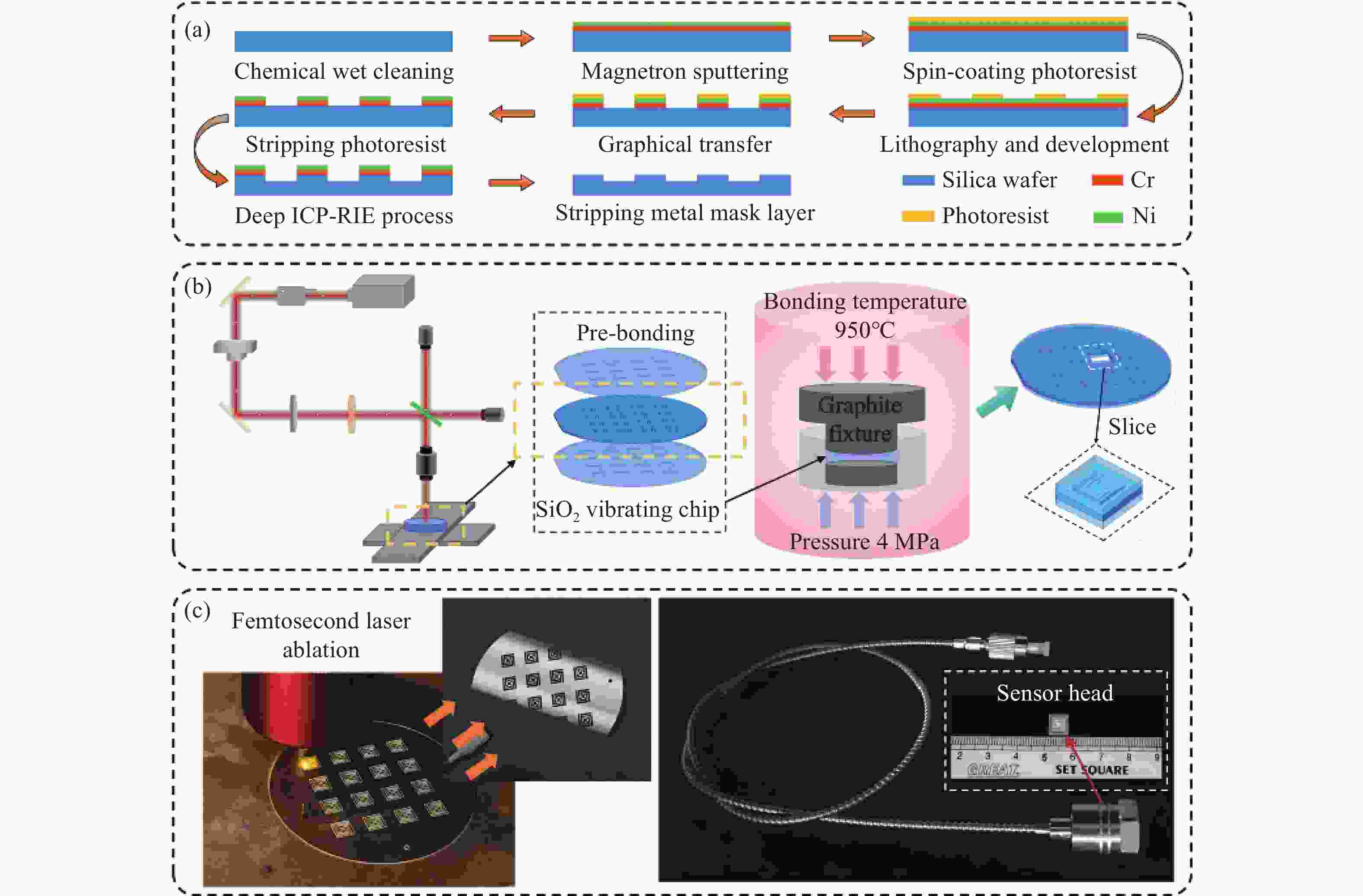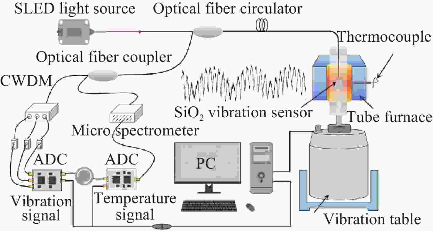 0.8915 nm/g;经温度补偿后,传感器的残差平方和最大为0.168,全量程误非线性误差不大于1.033%;在动态响应测试中,该传感器的特征频率远高于6000 Hz,在100−2000 Hz的频率响应范围内表现出较高的平坦度,其灵敏度在2000 −6000 Hz之间逐渐增加,最大增量仅为0.177 nm/g。此外,传感器具有高一致性、全无胶化集成、抗电磁干扰等优点,为高温环境下的振动测量提供了一种新的解决思路,在高温振动领域具有广泛的应用前景。Abstract:To An all-silica fiber-optic Fabry-Perot (F-P) high-temperature vibration sensor is proposed to address sensor failure and signal distortion in extreme environments. A collimated coupling structure based on a silica ball lens enables integrated, non-contact signal transmission between the fiber and the sensitive structure. The sensitive units are batch-fabricated using MEMS and thermal pressure bonding technologies. By combining three-wavelength dynamic demodulation with spectral cross-correlation, precise vibration signal extraction and temperature compensation are achieved, effectively eliminating thermal cross-sensitivity. Experimental results indicate that as the temperature increases from room temperature (23 °C) to 800 °C, the sensitivity of the sensor decreases from 1.051 nm/g to