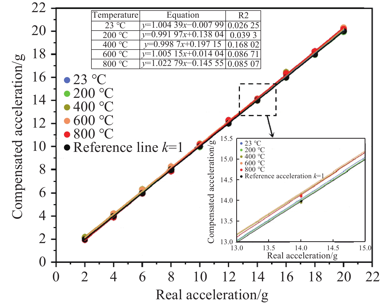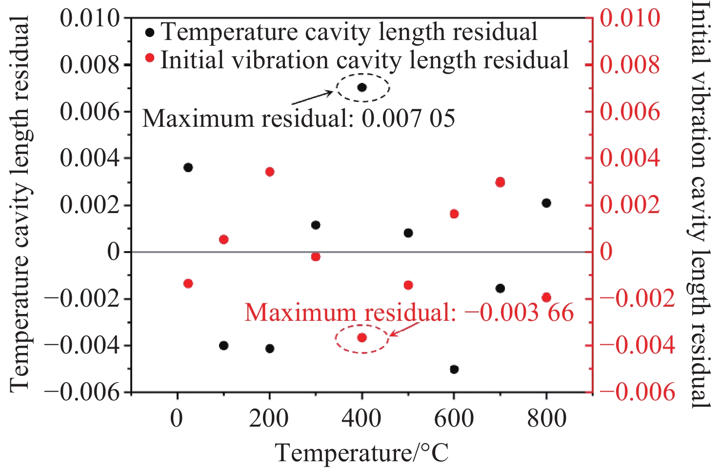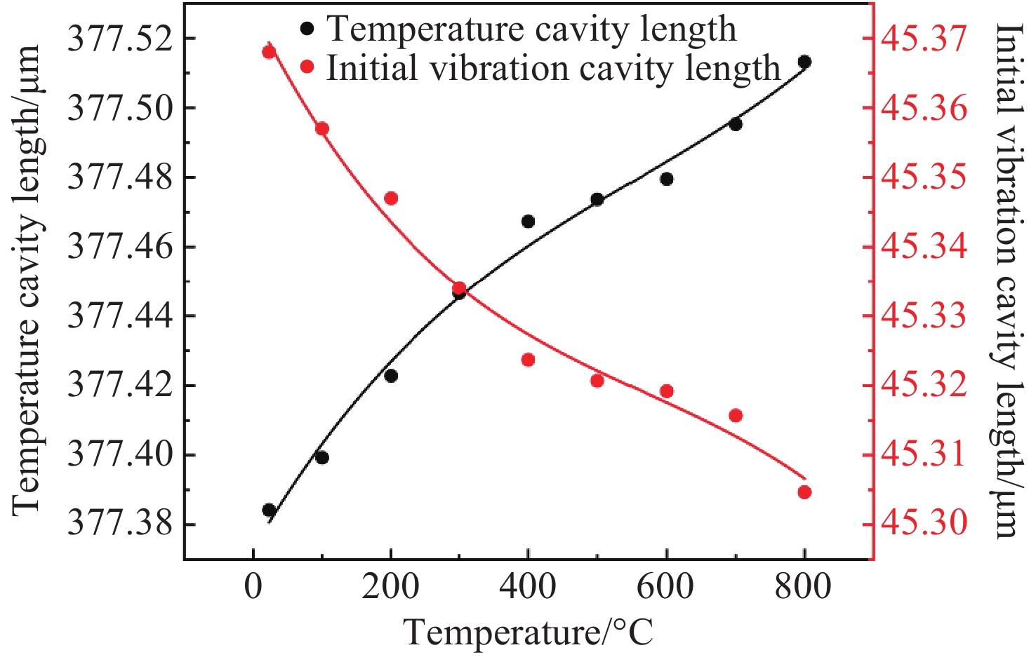 0.8915 nm/g;经温度补偿后,传感器的残差平方和最大为0.168,全量程误非线性误差不大于1.033%;在动态响应测试中,该传感器的特征频率远高于6000 Hz,在100−2000 Hz的频率响应范围内表现出较高的平坦度,其灵敏度在2000 −6000 Hz之间逐渐增加,最大增量仅为0.177 nm/g。此外,传感器具有高一致性、全无胶化集成、抗电磁干扰等优点,为高温环境下的振动测量提供了一种新的解决思路,在高温振动领域具有广泛的应用前景。Abstract:To An all-silica fiber-optic Fabry-Perot (F-P) high-temperature vibration sensor is proposed to address sensor failure and signal distortion in extreme environments. A collimated coupling structure based on a silica ball lens enables integrated, non-contact signal transmission between the fiber and the sensitive structure. The sensitive units are batch-fabricated using MEMS and thermal pressure bonding technologies. By combining three-wavelength dynamic demodulation with spectral cross-correlation, precise vibration signal extraction and temperature compensation are achieved, effectively eliminating thermal cross-sensitivity. Experimental results indicate that as the temperature increases from room temperature (23 °C) to 800 °C, the sensitivity of the sensor decreases from 1.051 nm/g to