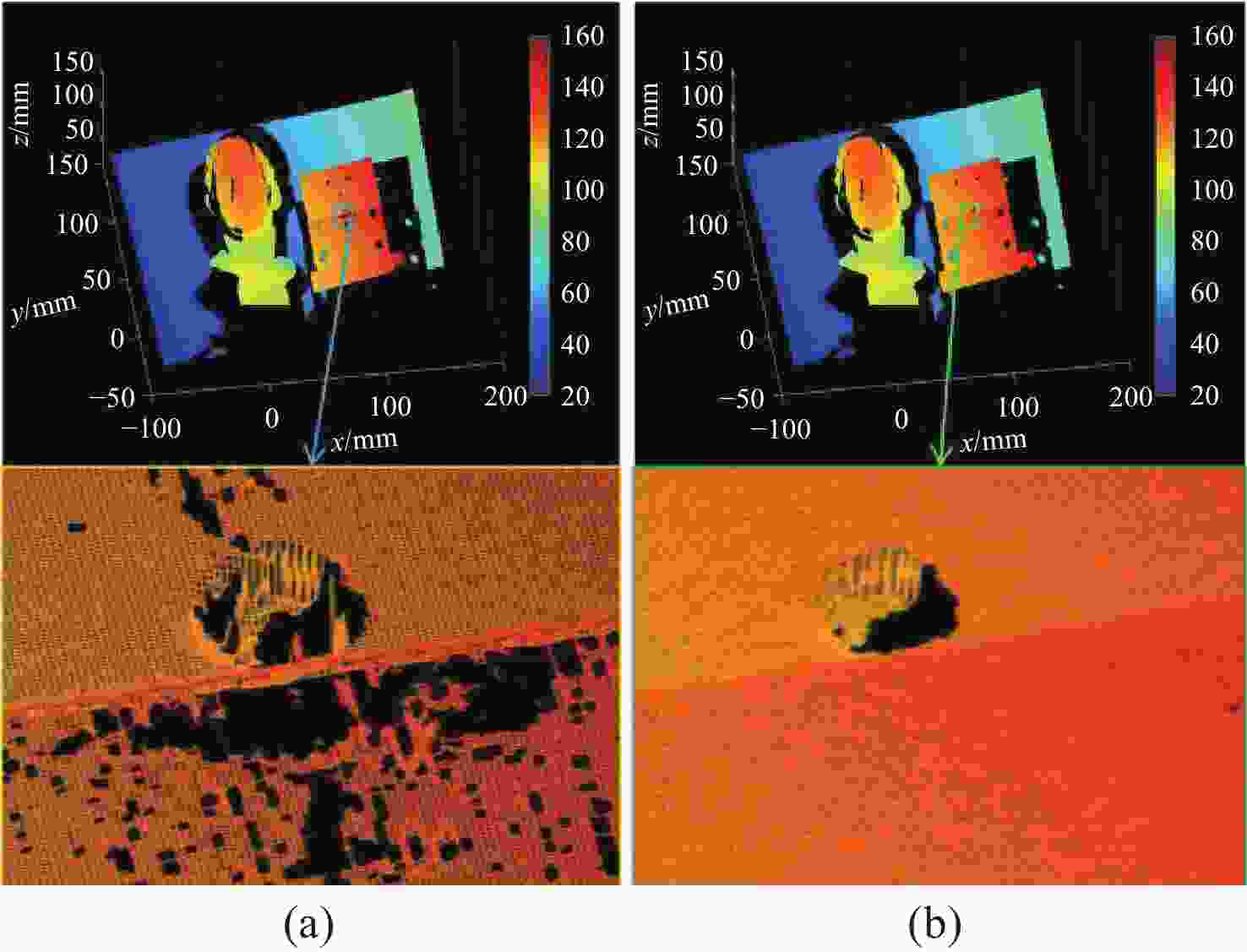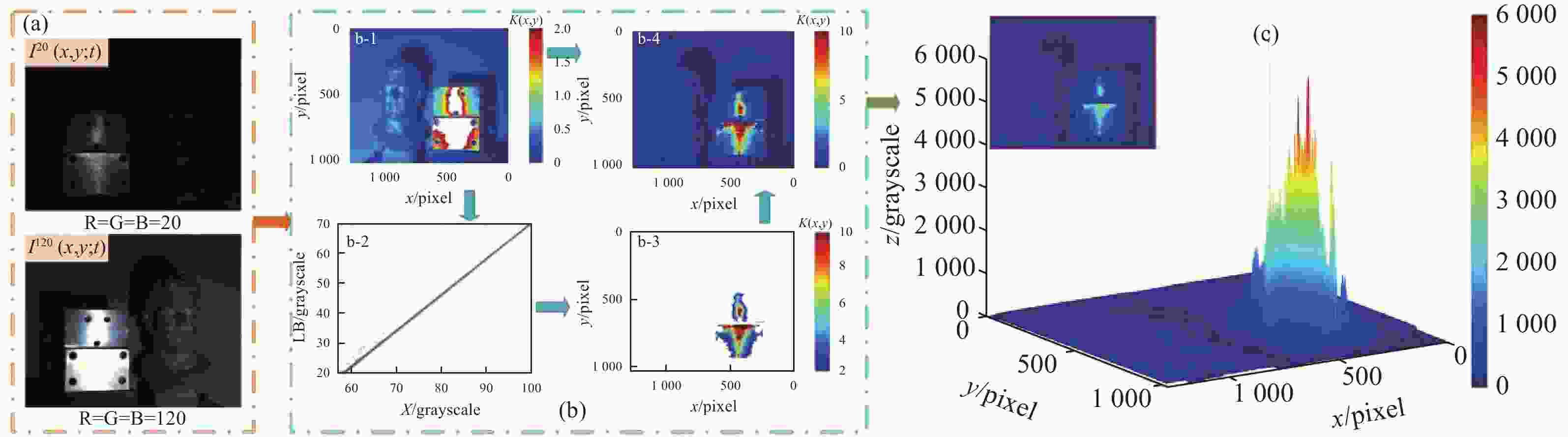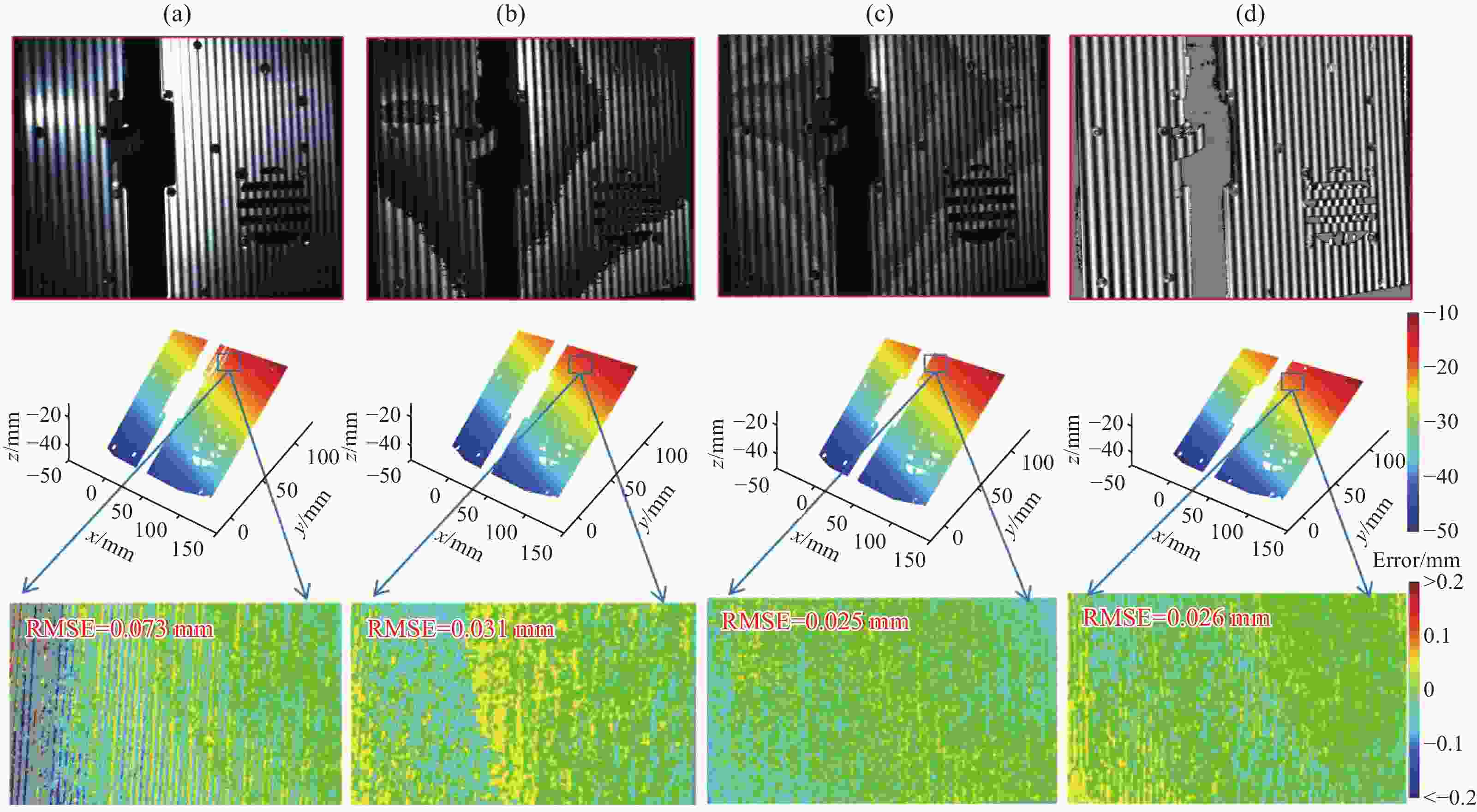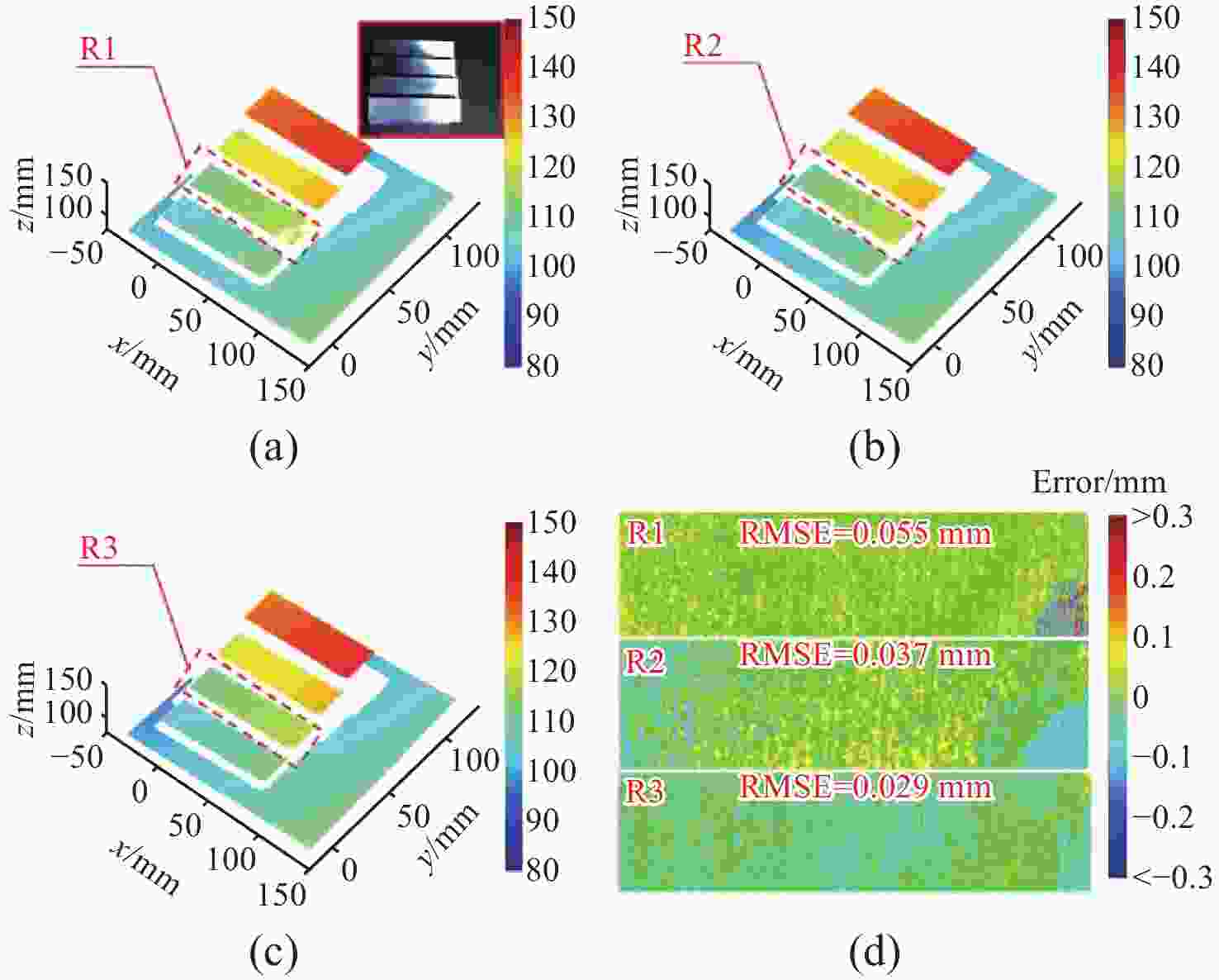 ${I^{120}}(x,y;t)$ non-over-exposed region, b-2 is the distribution and fitting result of$ LB(x,y) $ and${I^{120}}(x,y;t)$ , b-3 is the reflectance coefficient of the${I^{120}}(x,y;t)$ over-exposed region, and b-4 the reflectance coefficient of the measured scene. (c) High dynamic range measured scene dataFigure 10. Highly reflective standards and step measurement result. (a) 3D data obtained by the traditional method. (b) 3D data obtained by Liu's method[26]. (c) 3D data obtained by the method in this paper. (d) Planar RMSEs of the three methods