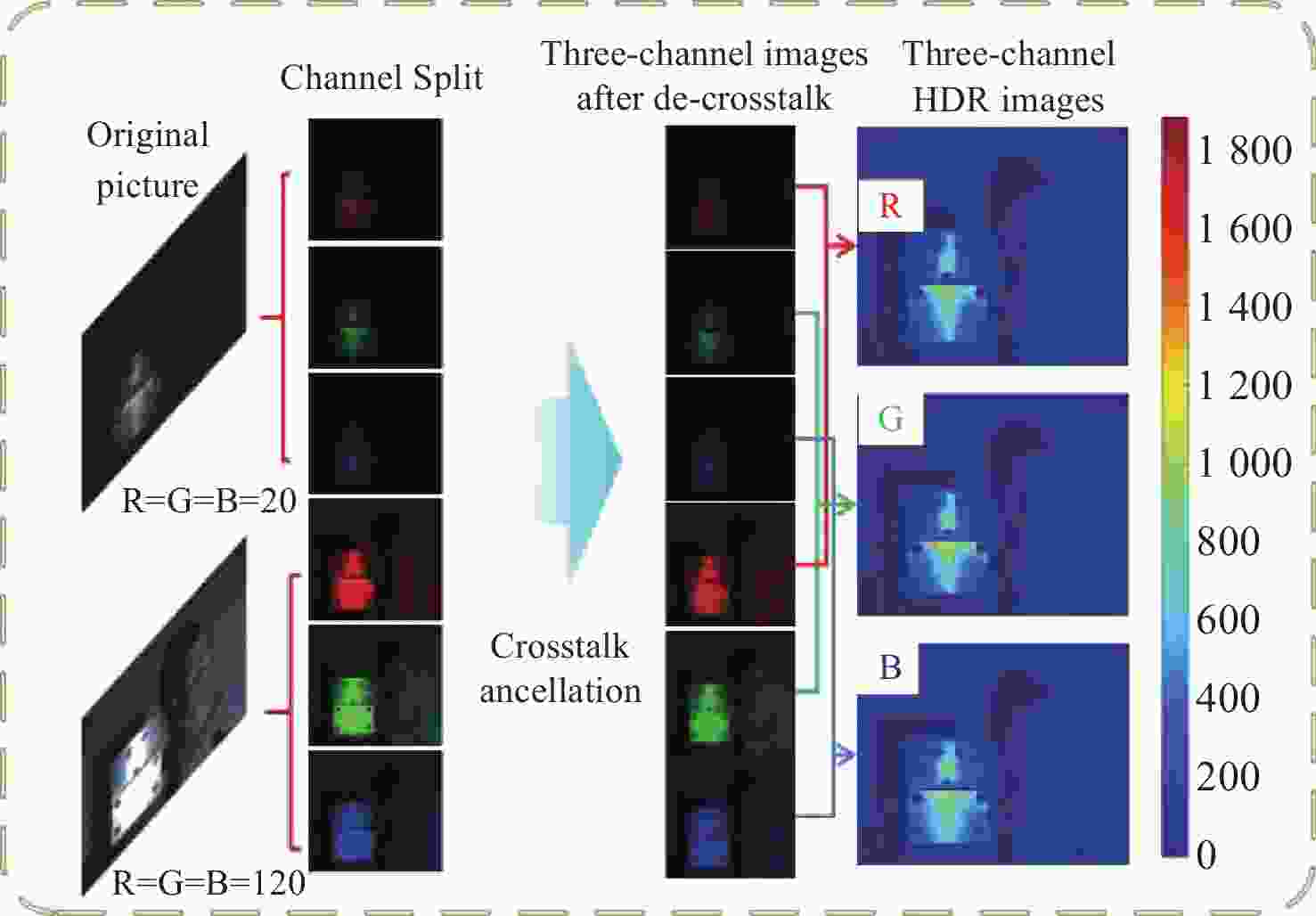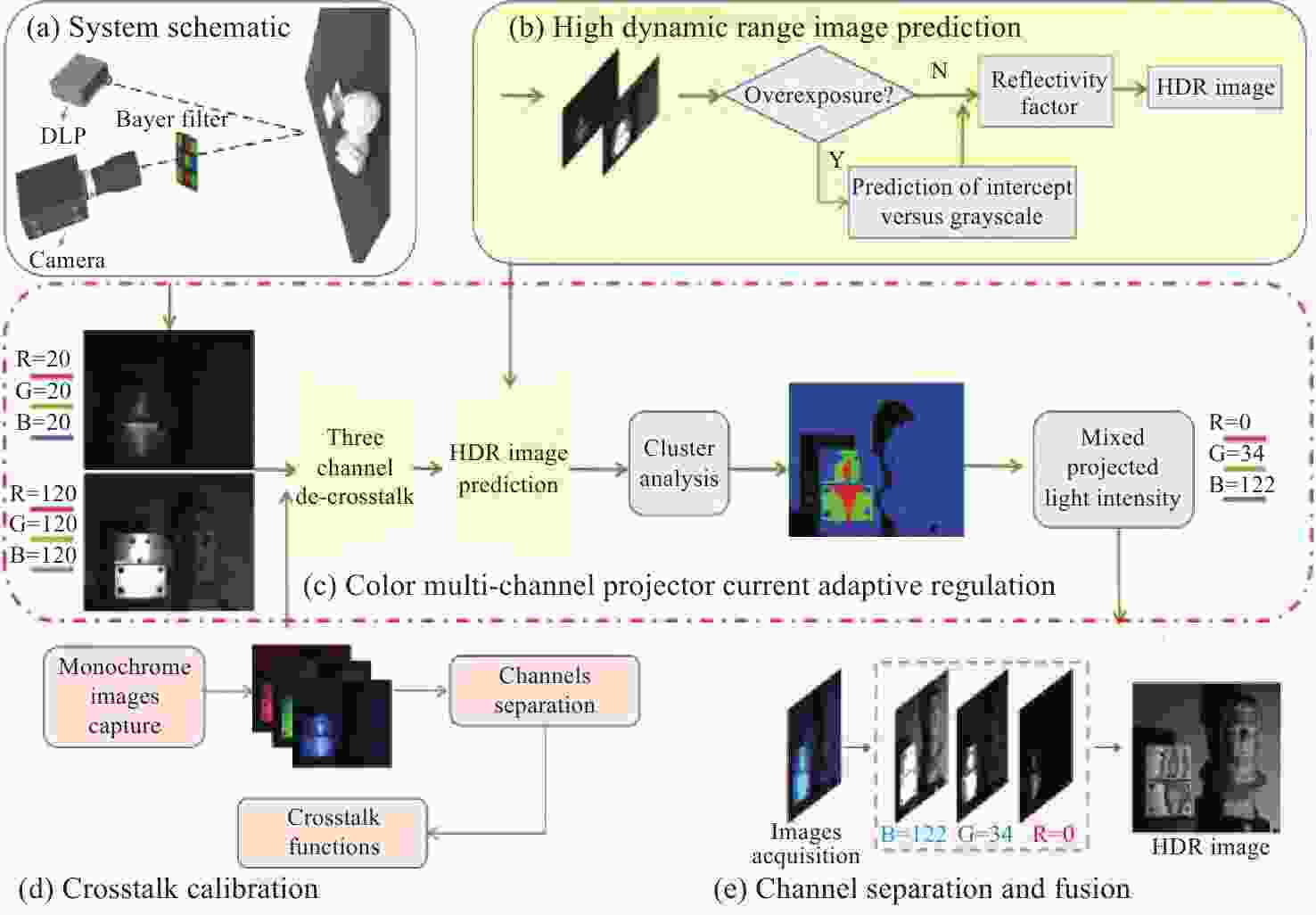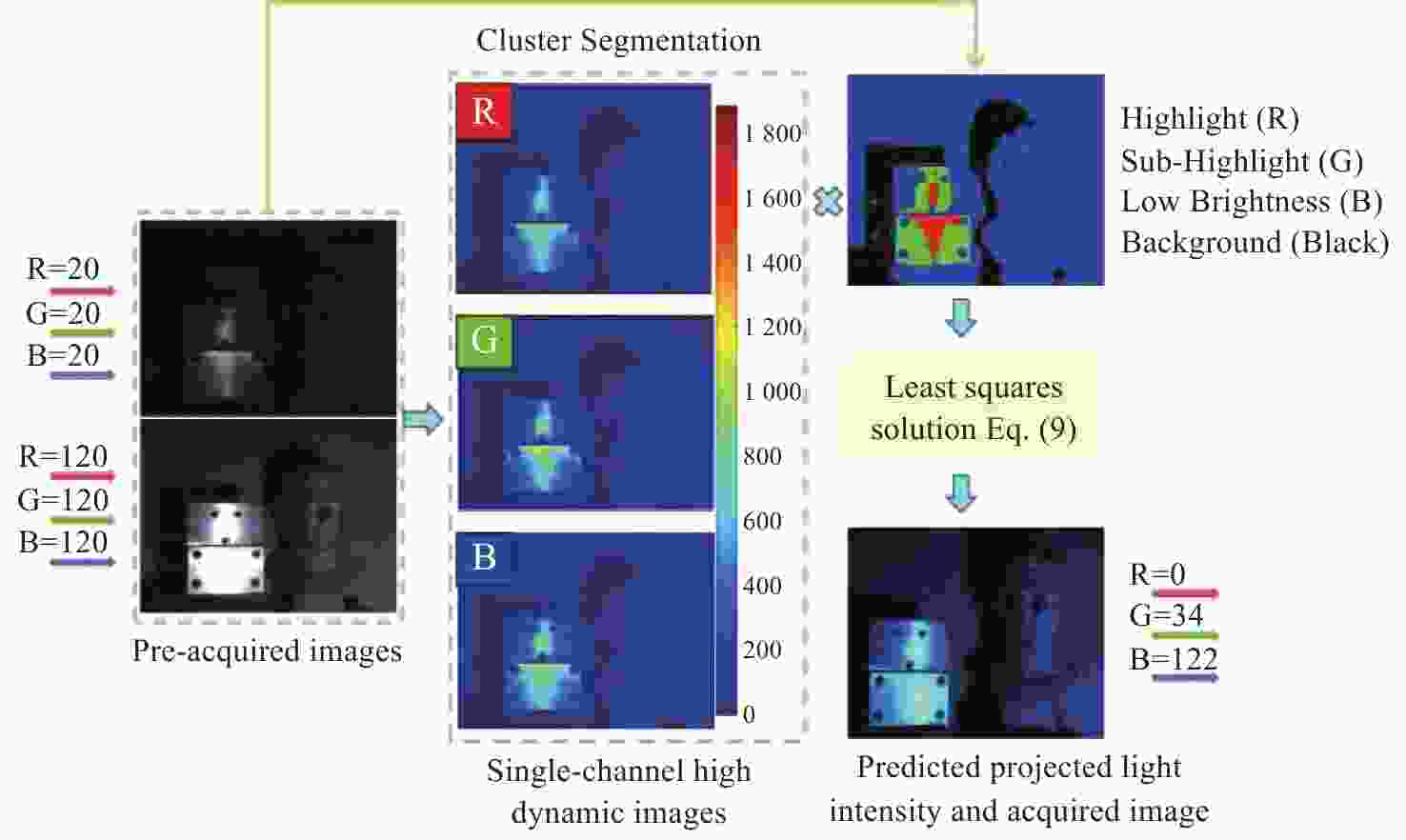 单一曝光时间或单一投影强度的条纹投影轮廓术(FPP)系统方法受限于相机的动态范围,会导致图像的过饱和和欠饱和,从而造成点云缺失或精度降低。为了解决这一问题,有别于投影仪像素调制方法,我们利用彩色投影仪三通道LED投影强度可单独控制的特点,提出了投影仪三通道光强分离的方法,结合彩色相机,实现了单曝光、多光强图像采集。进一步地,将串扰系数应用到被测物体三通道反射率预测中,结合聚类与通道映射,建立了投影仪三通道电流与相机三通道图像光强的像素级映射模型,实现了最佳投影电流预测和高动态范围图像获取。我们所提出的方法只需一次曝光就能实现高动态范围场景的高精度三维数据获取,该方法的有效性已通过标准平面和标准台阶的实验进行了验证,相比于现有单曝光高动态范围方法显著降低了平均绝对误差(44.6%), 相比于多曝光融合方法所需要的采集图像数量显著减小(文中场景下图片数量减小70.8%),提出的方法在各种 FPP 相关领域具有巨大潜力。