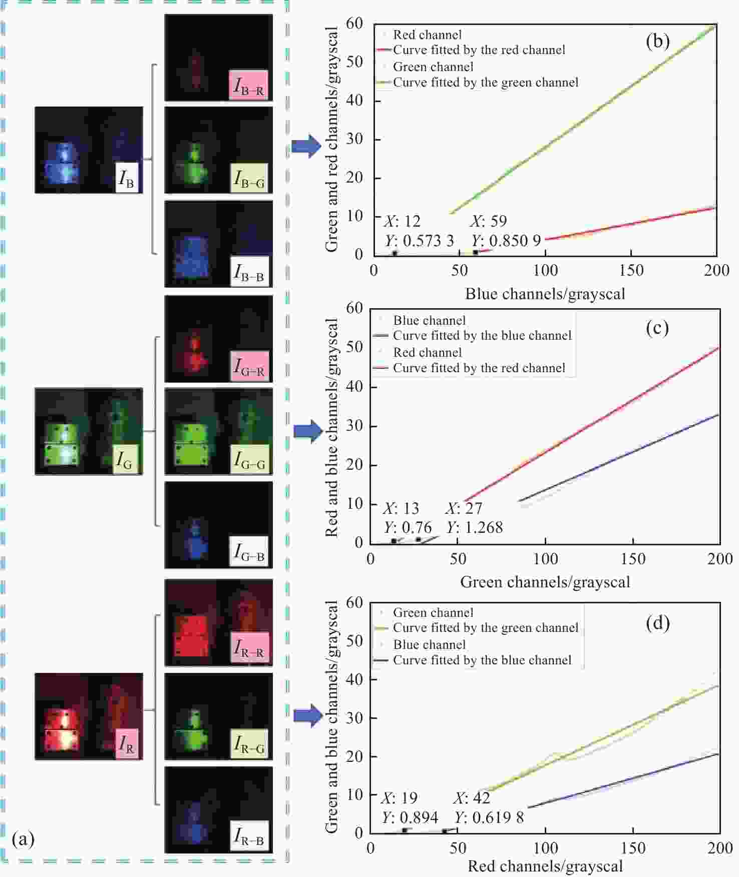 $ {a_{ \to {\mathrm{R}}}} $ $ {{\text{b}}_{ \to {\mathrm{R}}}} $ $ {a_{ \to {\mathrm{G}}}} $ $ {{\text{b}}_{ \to {\mathrm{G}}}} $ $ {a_{ \to {\mathrm{B}}}} $ $ {{\text{b}}_{ \to {\mathrm{B}}}} $ R 1 0 0.209 3.081 0.129 4.789 G 0.268 3.307 1 0 0.193 5.537 B 0.082 3.995 0.314 3.194 1 0 Table 2. Comparison of measurement accuracy