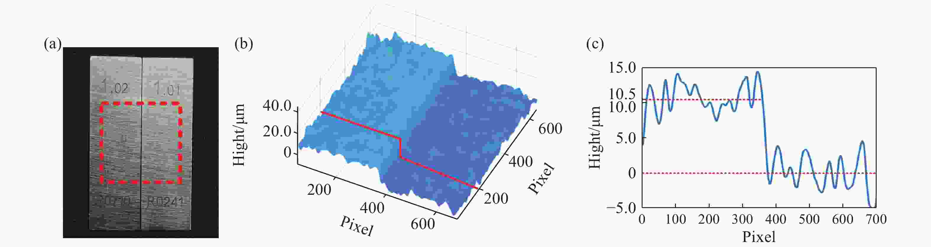 Figure 4.  10 µm step measurement results. (a) The 10 µm step object. (b) Topography map representation with a 10 µm step. (c) Outline of the red line in (b)