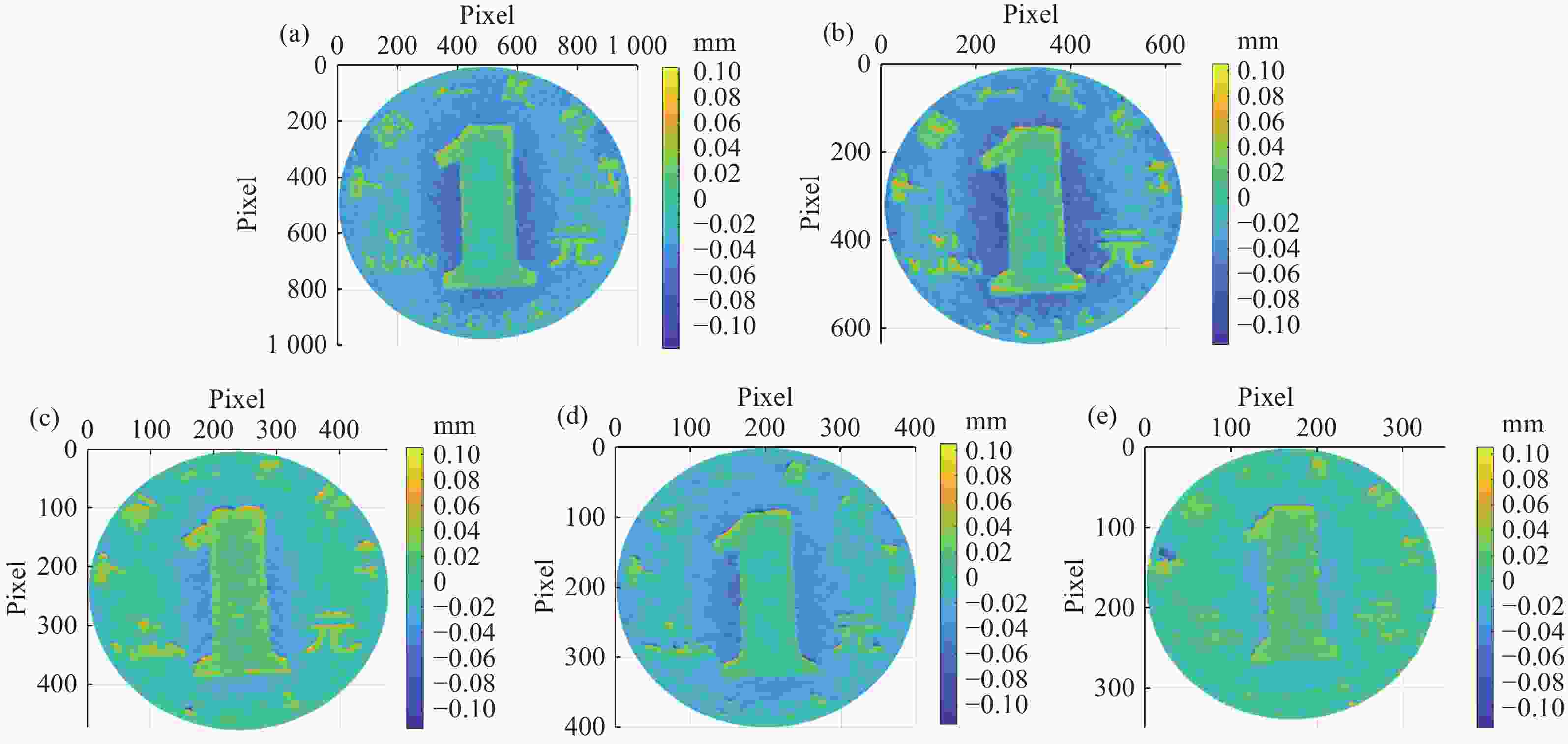 Figure 5.  3D topographies of coin at different distances. (a)-(e) 3D topographies of coin located 1m to 5 m away from the first mirror M, with a spacing of 1 m