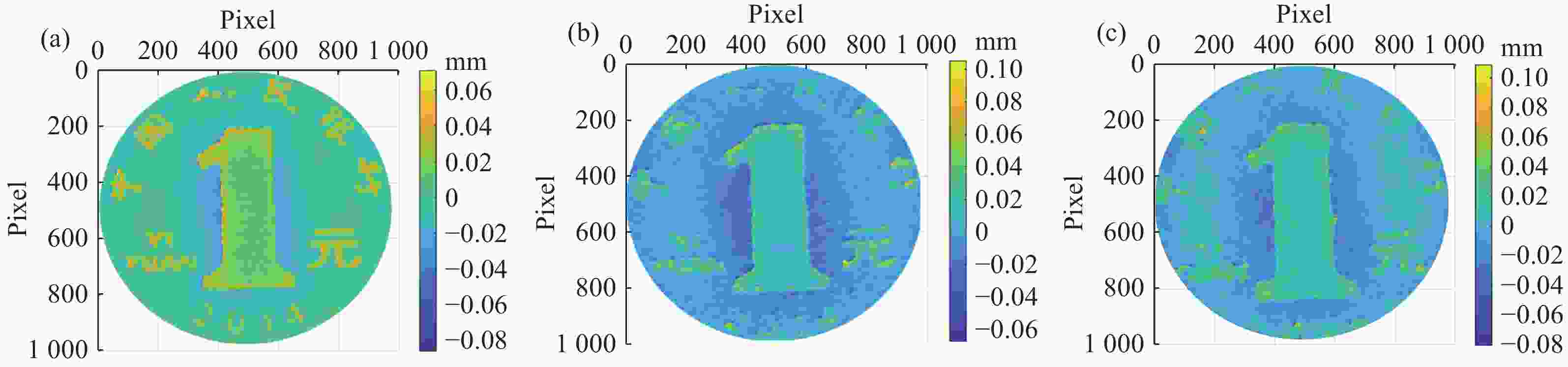 Figure 6.  Topography of coin. (a) Coin at 2 m from the first mirror. (b) Coin at 3.5 m from the first mirror. (c) Coin at 5 m from the first mirror