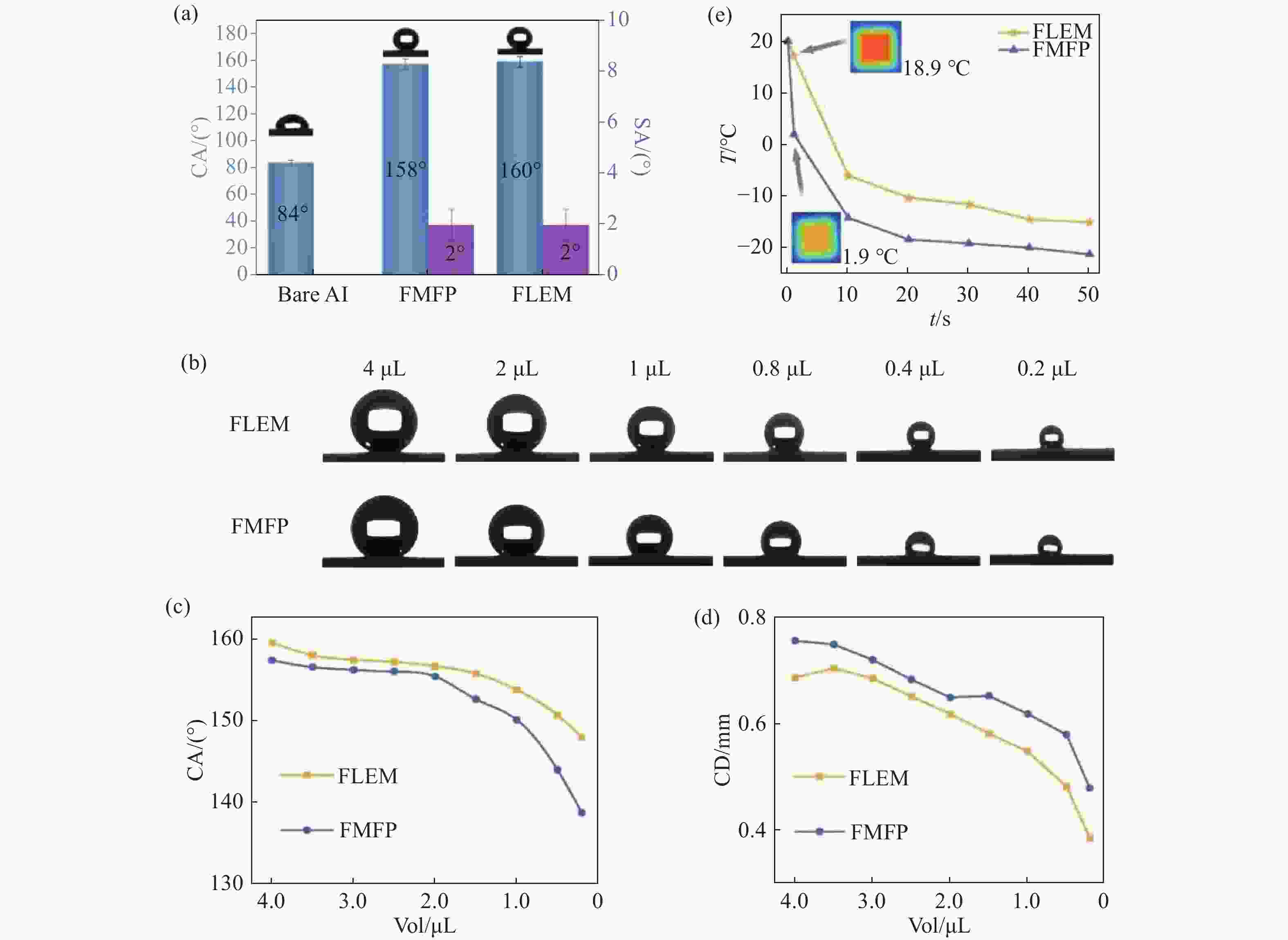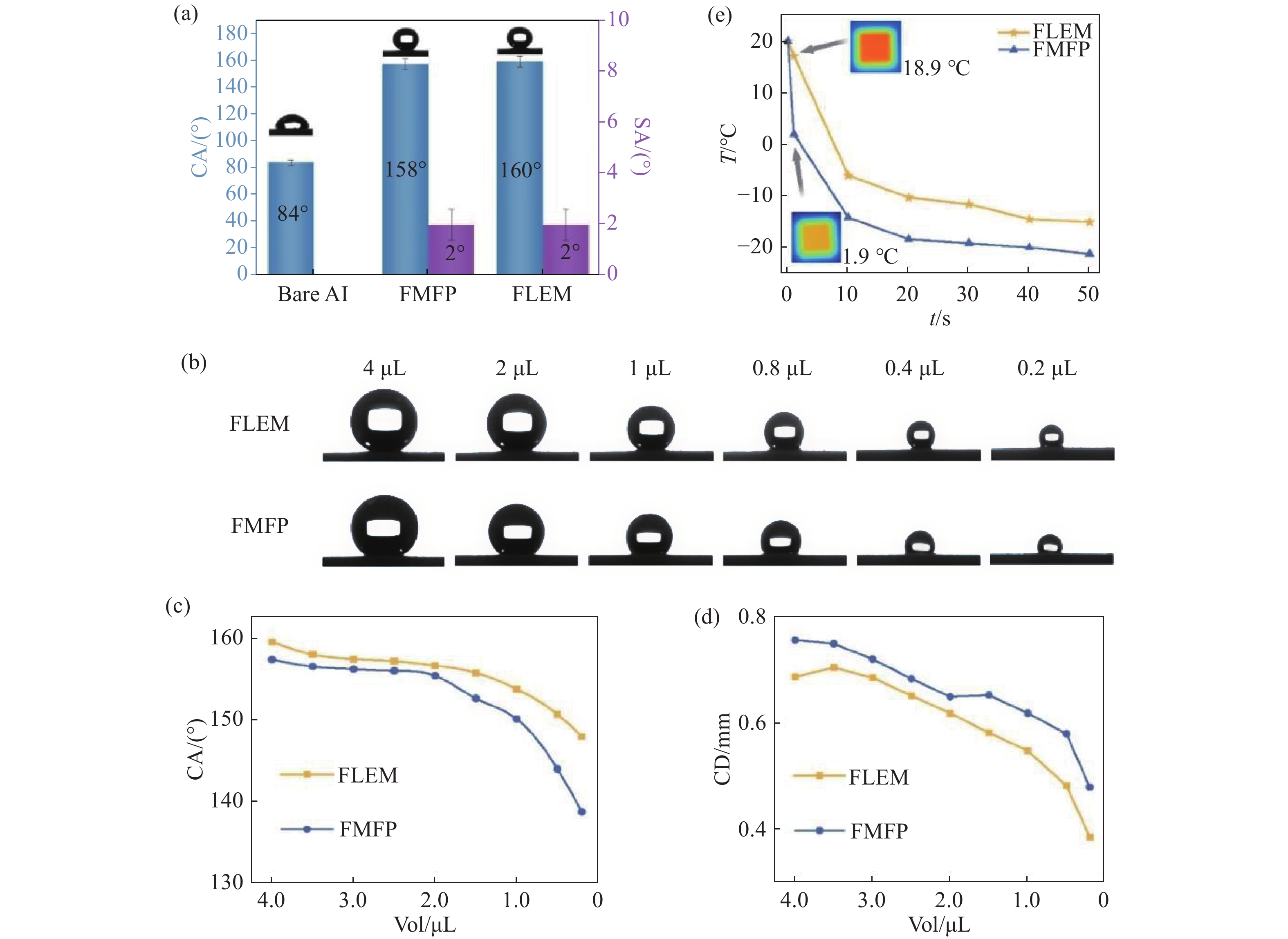 Figure 2. Characterizations of the superhydrophobic and anti-icing performance of different samples (indoor conditions). (a) Measured contact angle (CA) and sliding angle (SA) for three different surfaces. (b) Time-evolution of the droplet volume on the FLEM and FMFP surfaces during the evaporation experiment. Measured CA (c) and CD(d) variations with the water droplet volume. (e) Measured heat transfer efficiencies of the FMFP and FLEM samples placed on a Peltier cooling plate