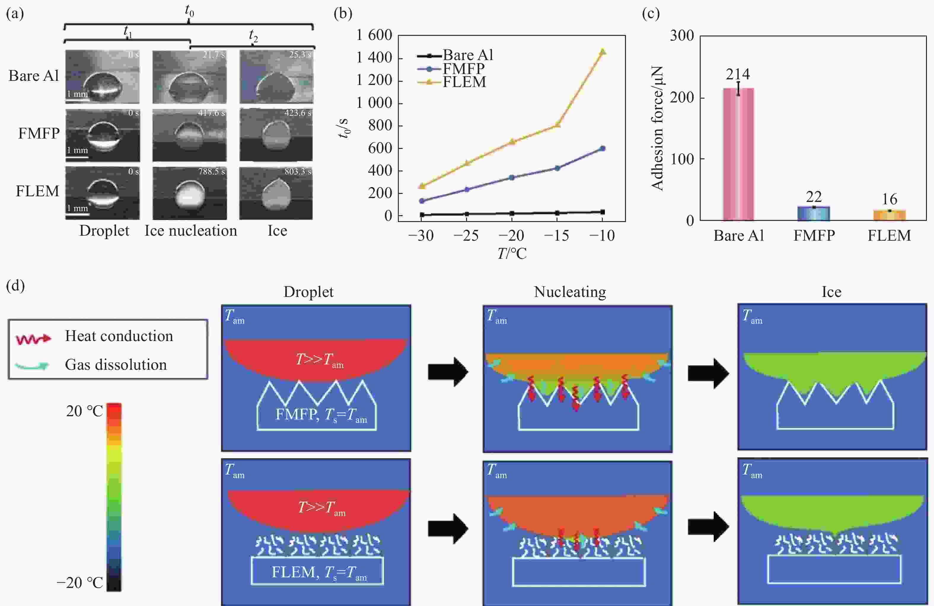 Figure 3. Measured anti-icing performances and underlying mechanisms for the FLEM and FMFP surfaces. (a) The whole droplet icing process on the bare Al, FMFP and FLEM surfaces. (b) The measured dependence of delayed icing time t0 on the ambient temperature Tam for three different surfaces. (c) The measured adhesion force of ice droplet on these surfaces at the ambient temperature of Tam = −15 °C. (d) Proposed scenarios for the anti-icing process on the FLEM and FMFP surfaces