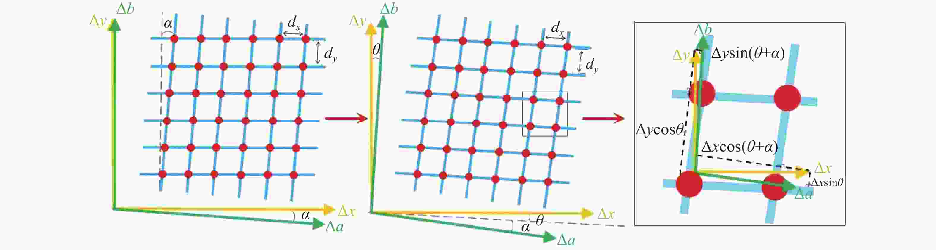 (xn,yn) θ(°) α(°) $ \rho $x(gr/mm) $ \rho $y(gr/mm) (1,5) 0.48016 − 1.07329 1199.99228 1199.90331 (2,5) 0.48820 − 1.08118 1199.99563 1199.90466 (3,5) 0.48496 − 1.07812 1200.02361 1199.90413 (4,5) 0.48669 − 1.07981 1200.02964 1199.90443 (5,5) 0.48652 − 1.07963 1200.01899 1199.90439 (5,4) 0.48654 − 1.07839 1200.01872 1199.87662 (5,3) 0.48653 − 1.07917 1200.01889 1199.88735 (5,2) 0.48668 − 1.06947 1200.01681 1199.88468 (5,1) 0.48653 − 1.07342 1200.01767 1199.87282 Average value 0.48587 − 1.07694 1200.01469 1199.89360 Standard deviation 0.002158 0.003702 0.01171085 0.01322980 Table 2. The results of the measurement of the 2D grating calibration area