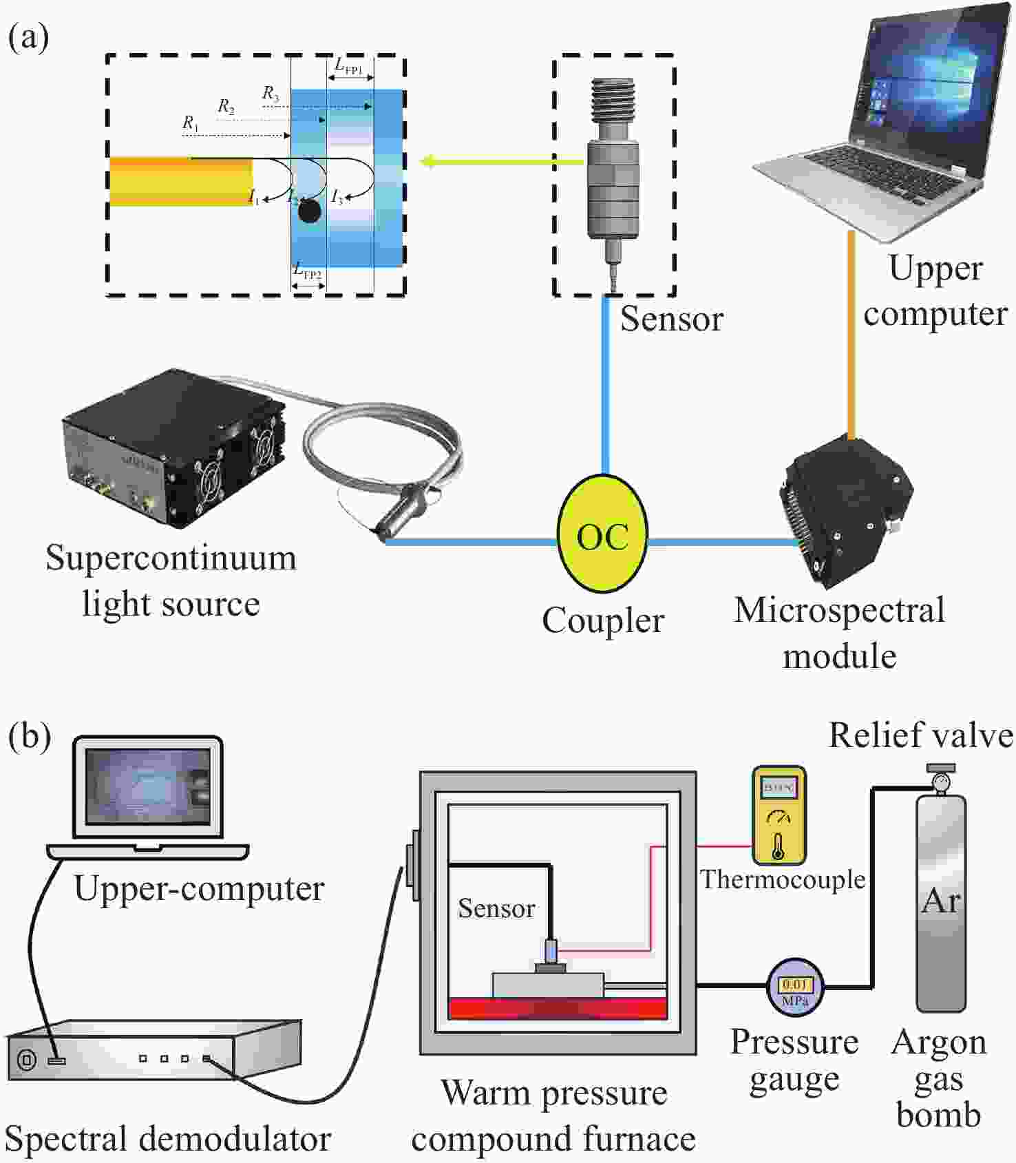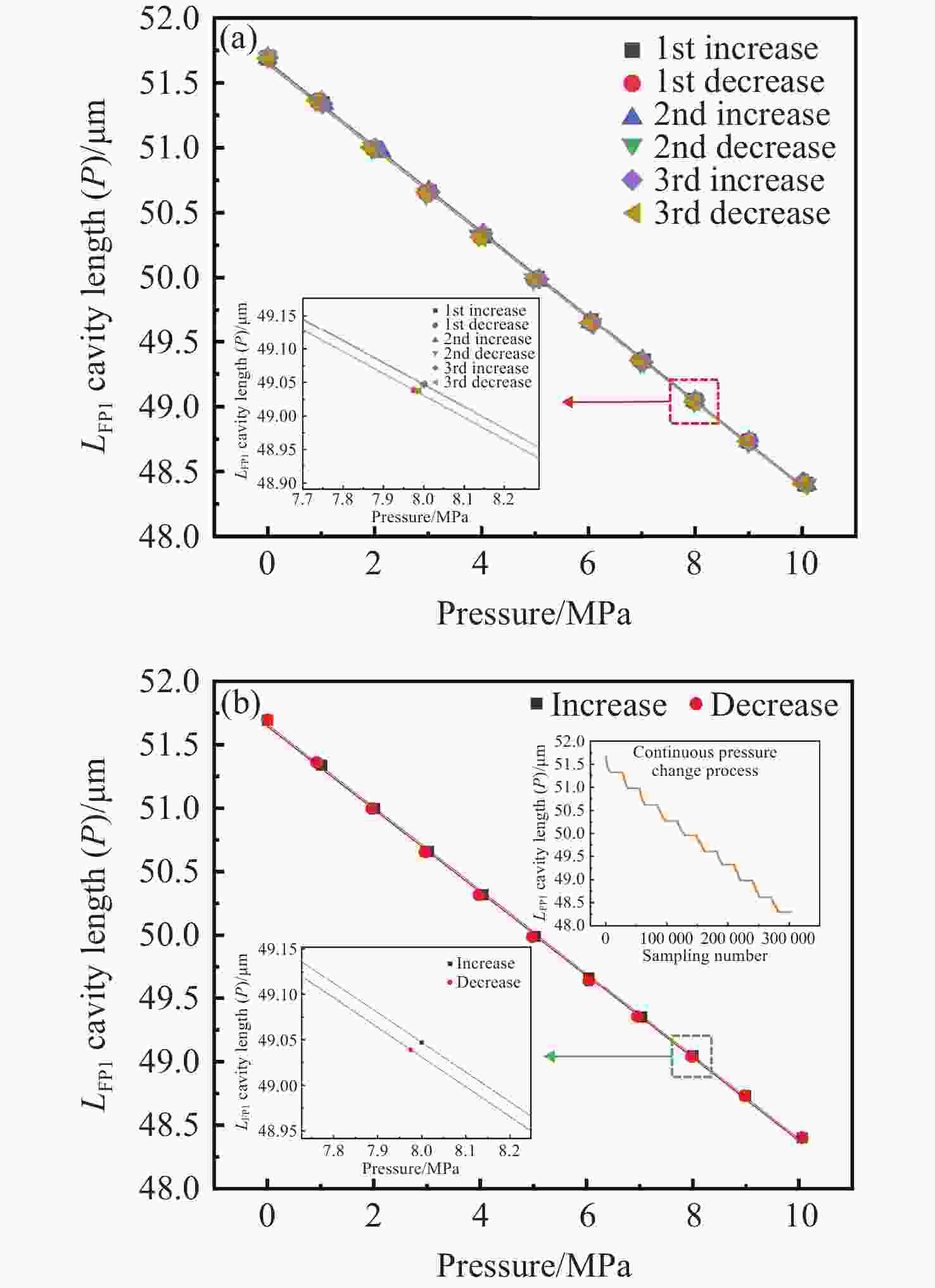 本文针对油气井、发动机燃油系统和航空液压系统等高温密闭环境下压力监测的技术难题,研发了一种具有温度补偿的金属膜片式光纤压力传感器。该传感器采用金属敏感膜片与蓝宝石晶片构成温度-压力双法珀(Fabry-Perot, FP)干涉腔结构,并结合互相关信号解调算法与温度解耦方法,有效降低温度串扰对压力测试的影响。实验结果表明,该传感器在常温和300 °C的压力测量中最大非线性误差分别为0.75% FS和0.99% FS。经过温度解耦后,压力测量精度可达1.7% FS。该传感器具有良好的静态压力响应、稳定性和可靠性,为高温压力监测场景提供了一种有效的解决方案。