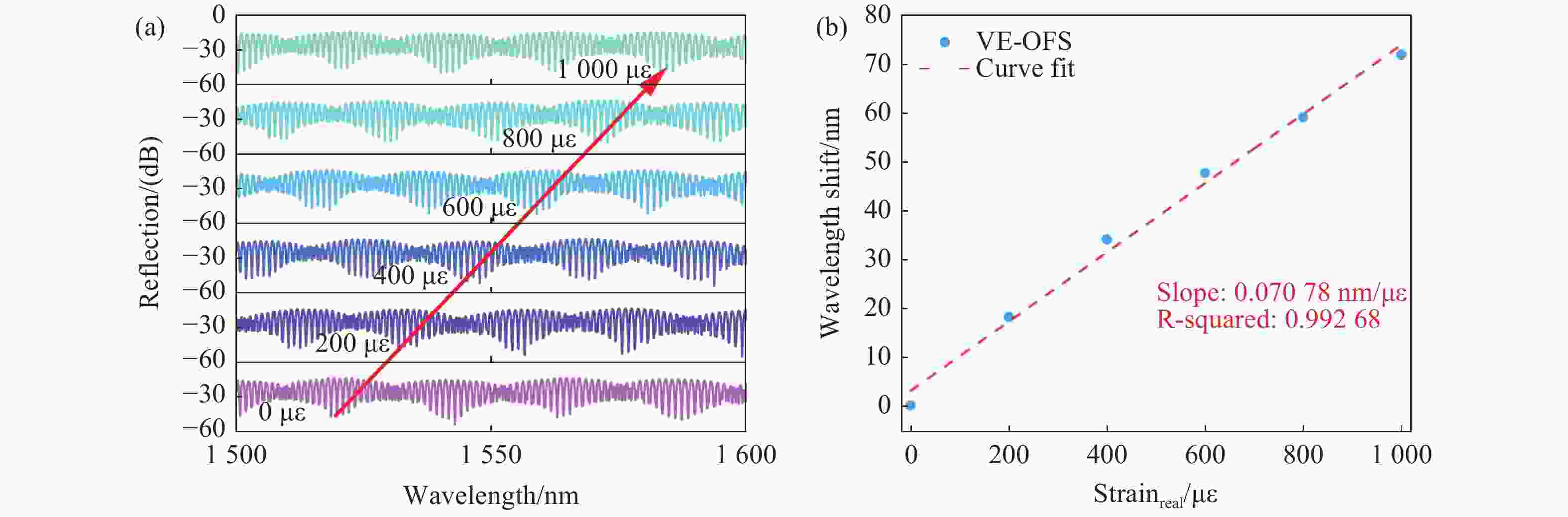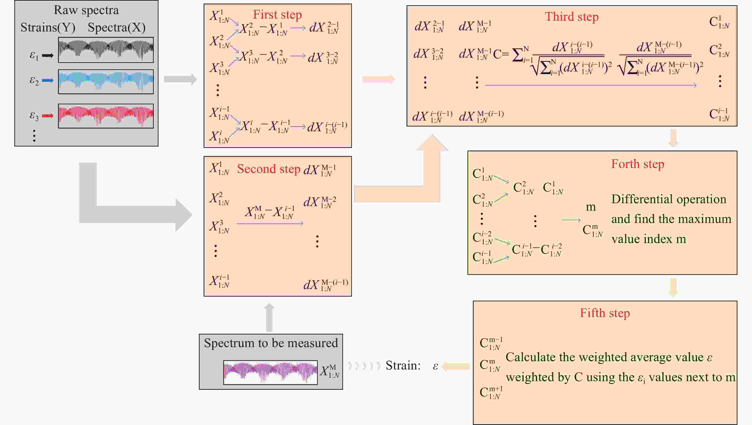 0.1038 $ \mu \varepsilon $ 的低平均绝对误差,并且消除了光谱范围对测量范围的限制。此外,与光谱跟踪技术相比,由于其可以使用低分辨率光谱进行解调,该改进互相关算法还具有提高测量速度的能力,因此该算法进一步提高了基于游标效应的光纤应变传感器解调性能。Abstract:The improved cross-correlation algorithm for the strain demodulation of Vernier-effect-based optical fiber sensor (VE-OFS) is proposed in this article. The algorithm identifies the most similar spectrum to the measured one from the database of the collected spectra by employing the cross-correlation operation, subsequently deriving the predicted value via weighted calculation. As the algorithm uses the complete information in the measured raw spectrum, more accurate results and larger measurement range can be obtained. Additionally, the improved cross-correlation algorithm also has the potential to improve the measurement speed compared to current standards due to the possibility for the collection using low sampling rate. This work presents an important algorithm towards a simpler, faster way to improve the demodulation performance of VE-OFS.